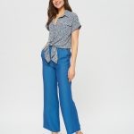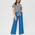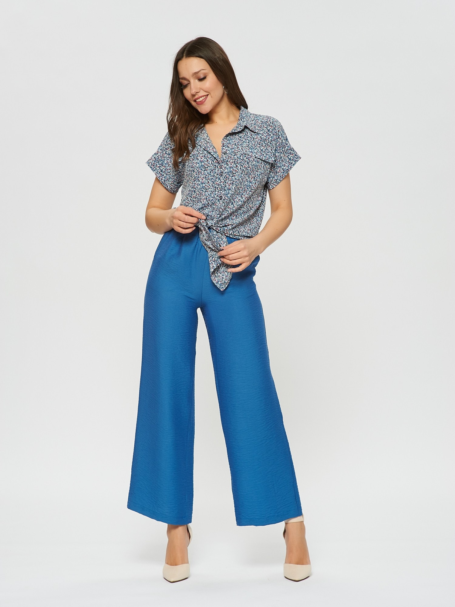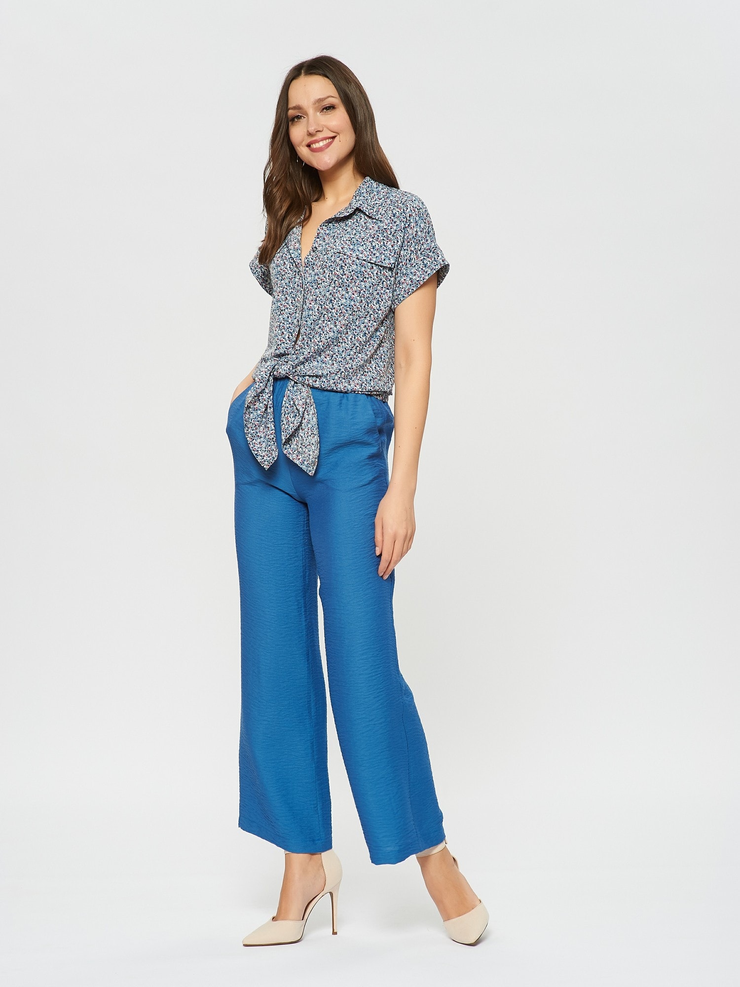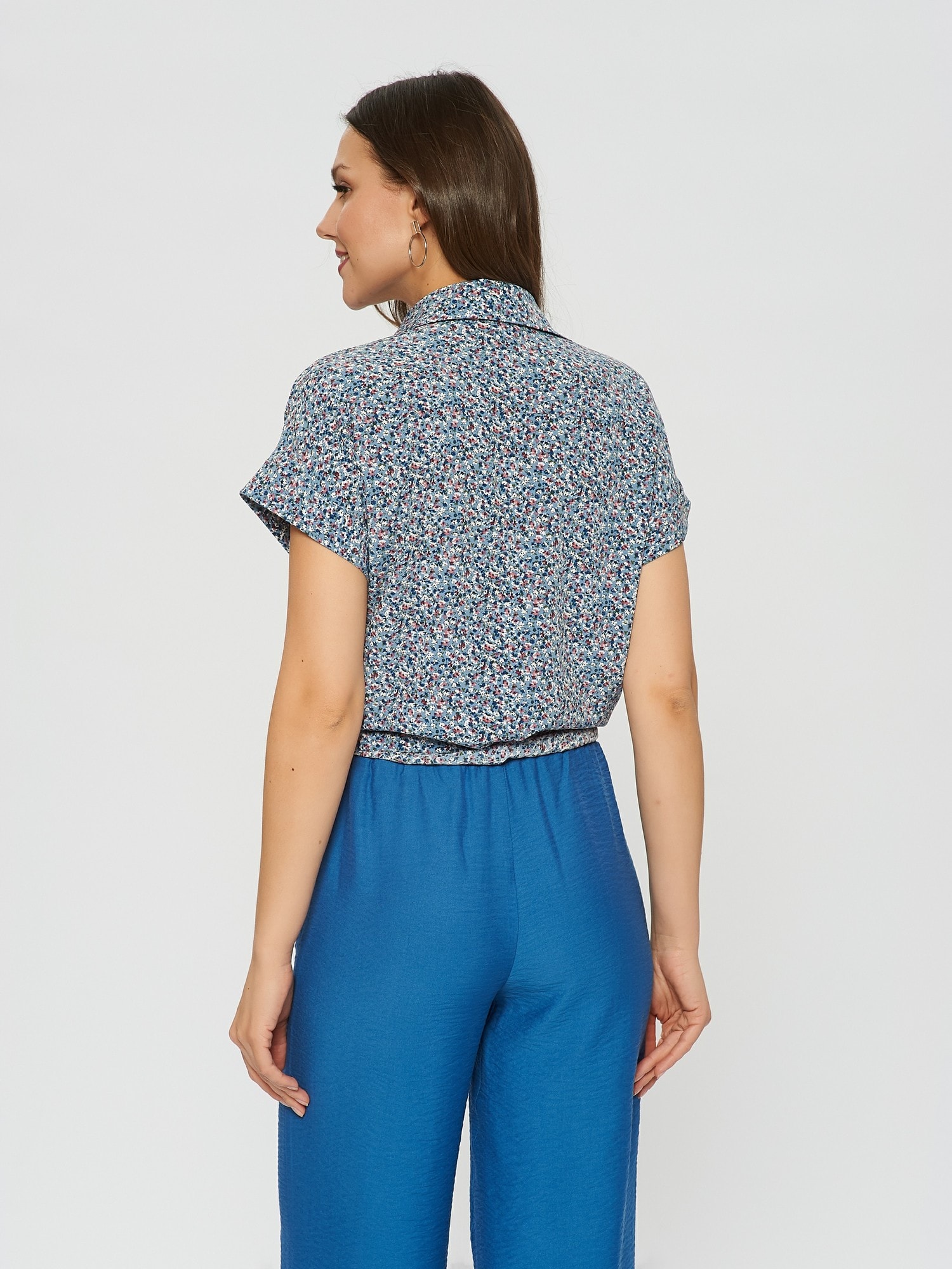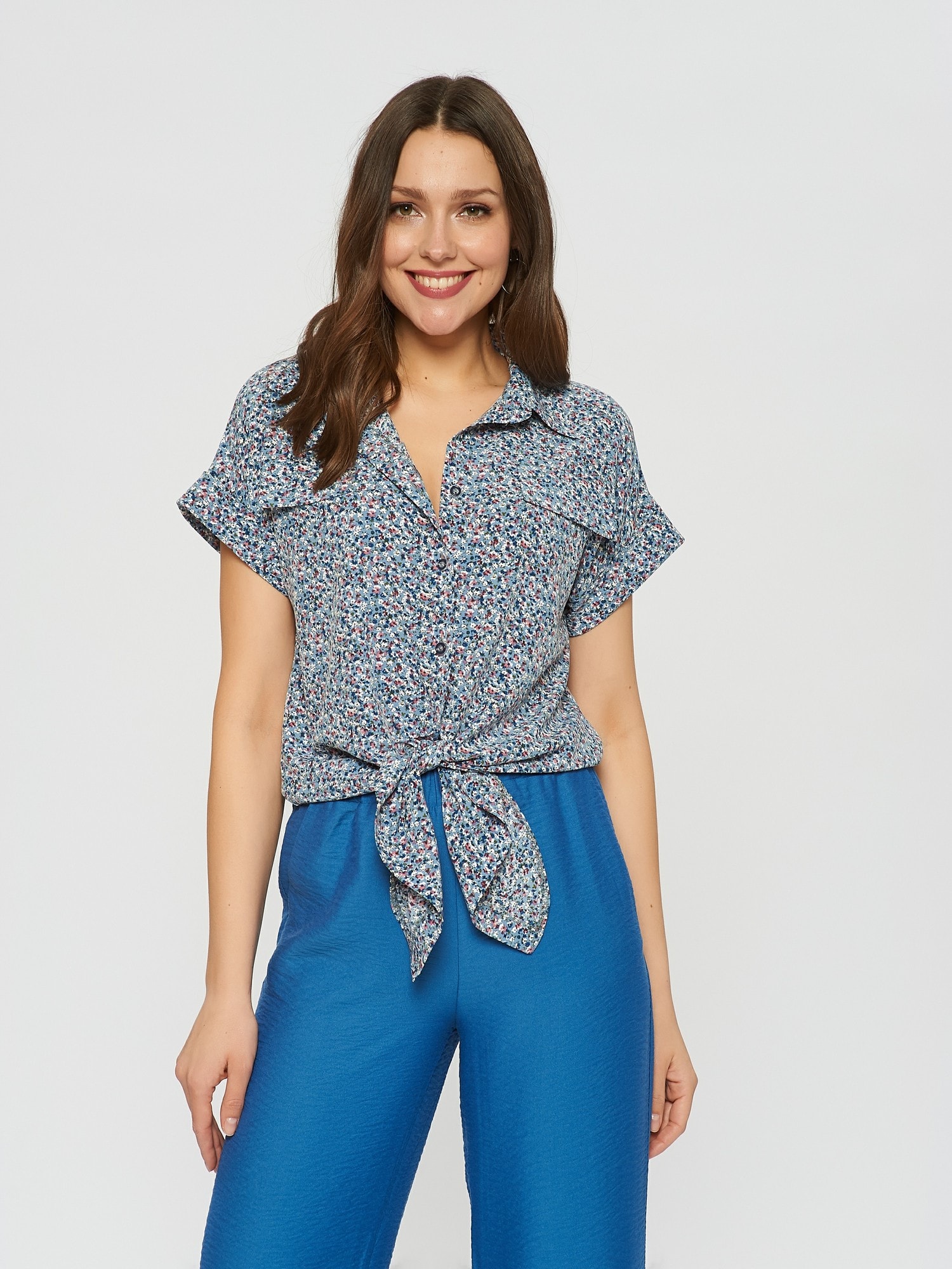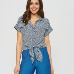 Блузка в стиле милитари с цветочным принтом. Отложной воротник, отвороты на рукавах. По низу блузки расположены удлиненные края для завязки в калифорнийском стиле. Прекрасно дополняется брюками Б-900 БРЮ(В20)