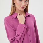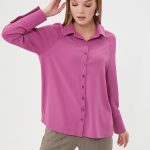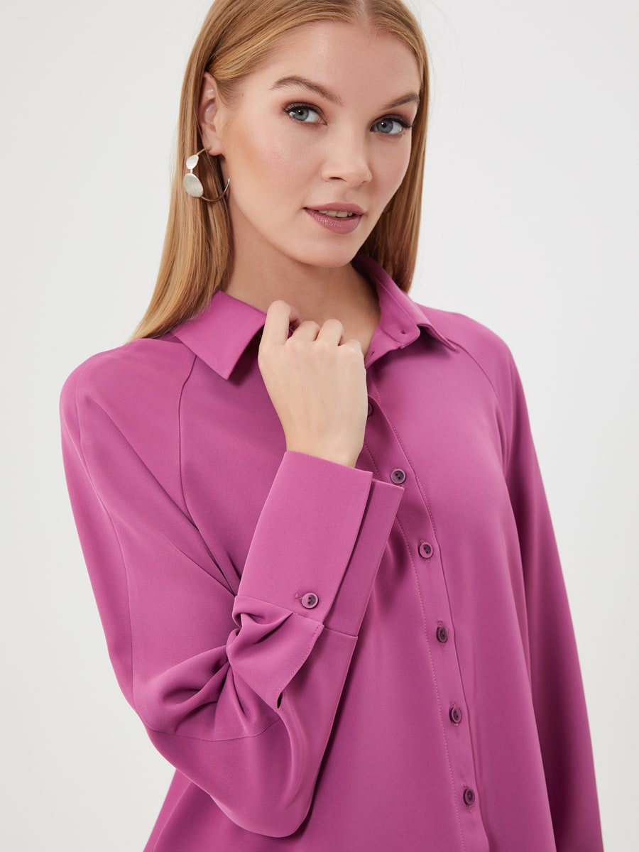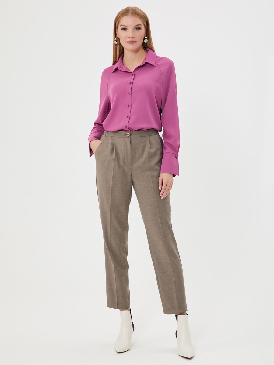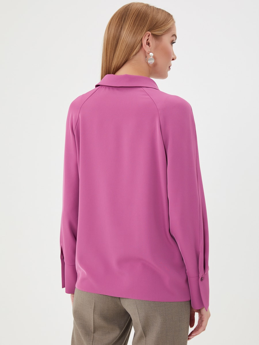 Описание: Блузка в цвете фуксия. Покрой рукава реглан, отложной воротник. Это именно та вещь, которая принесет ярких красок в осенний гардероб. Образ на фото дополнен брюками Б-802 ЖК(О)