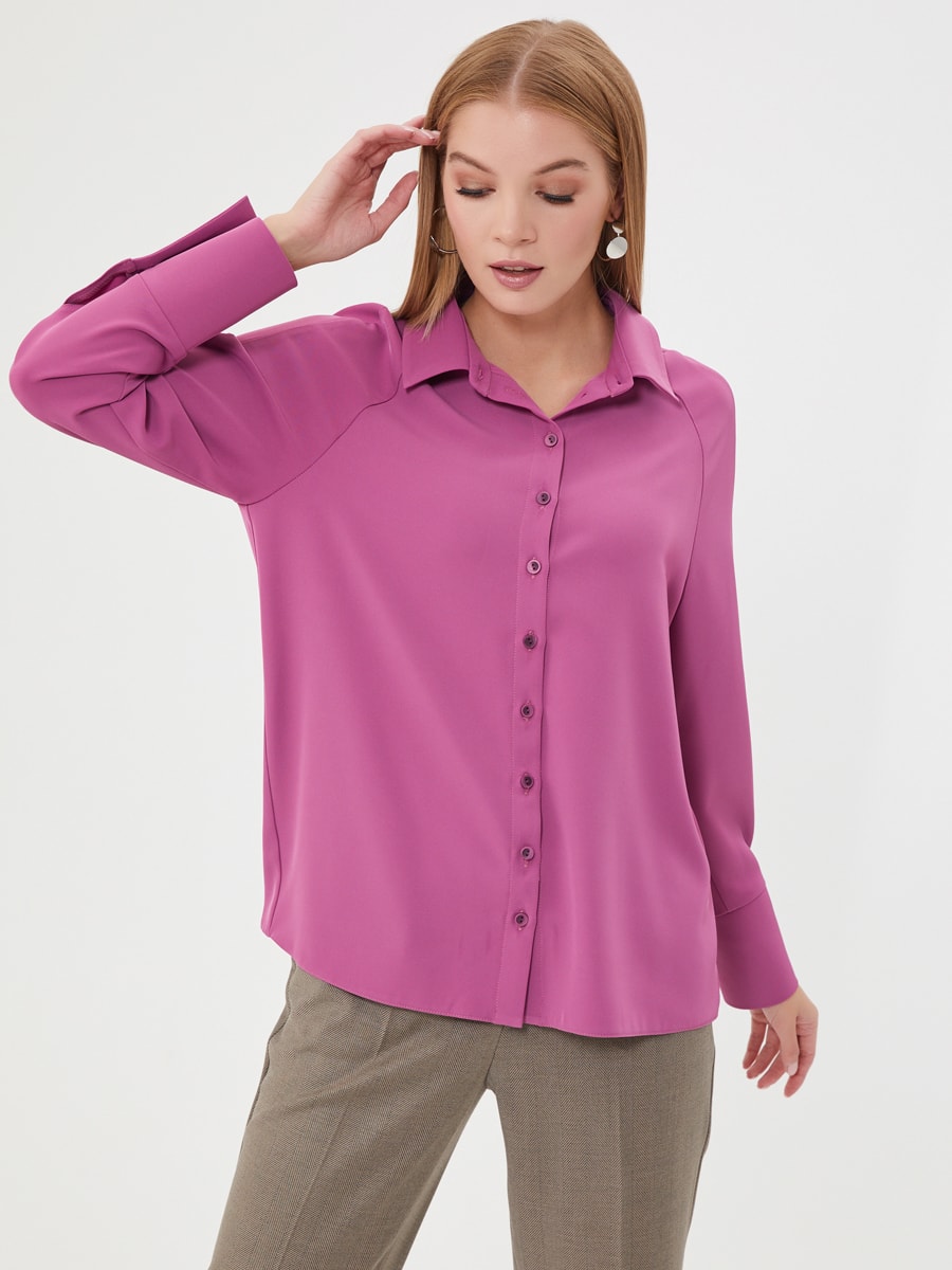 Описание: Блузка в цвете фуксия. Покрой рукава реглан, отложной воротник. Это именно та вещь, которая принесет ярких красок в осенний гардероб. Образ на фото дополнен брюками Б-802 ЖК(О)