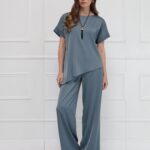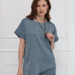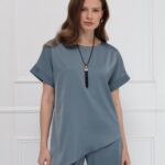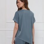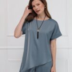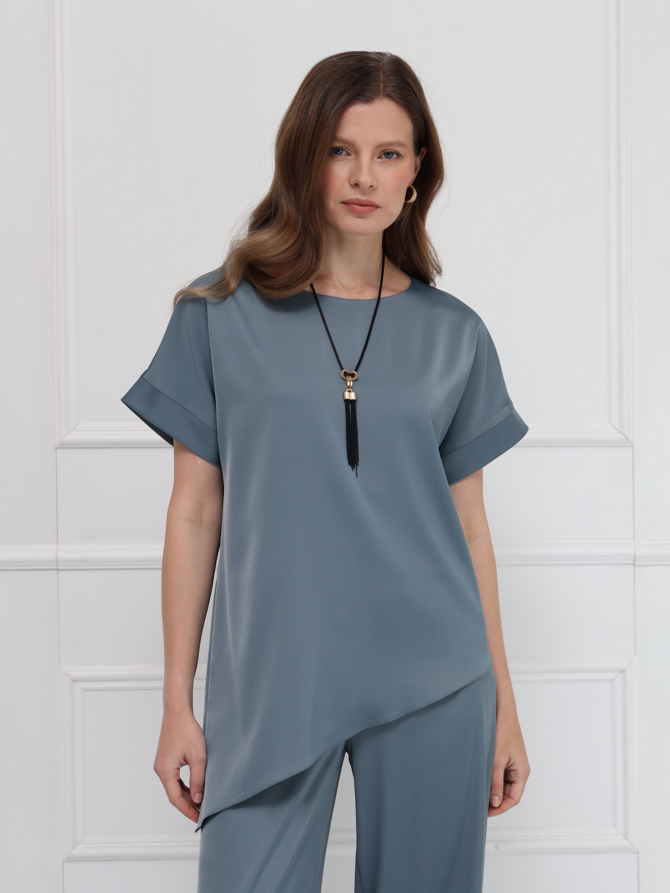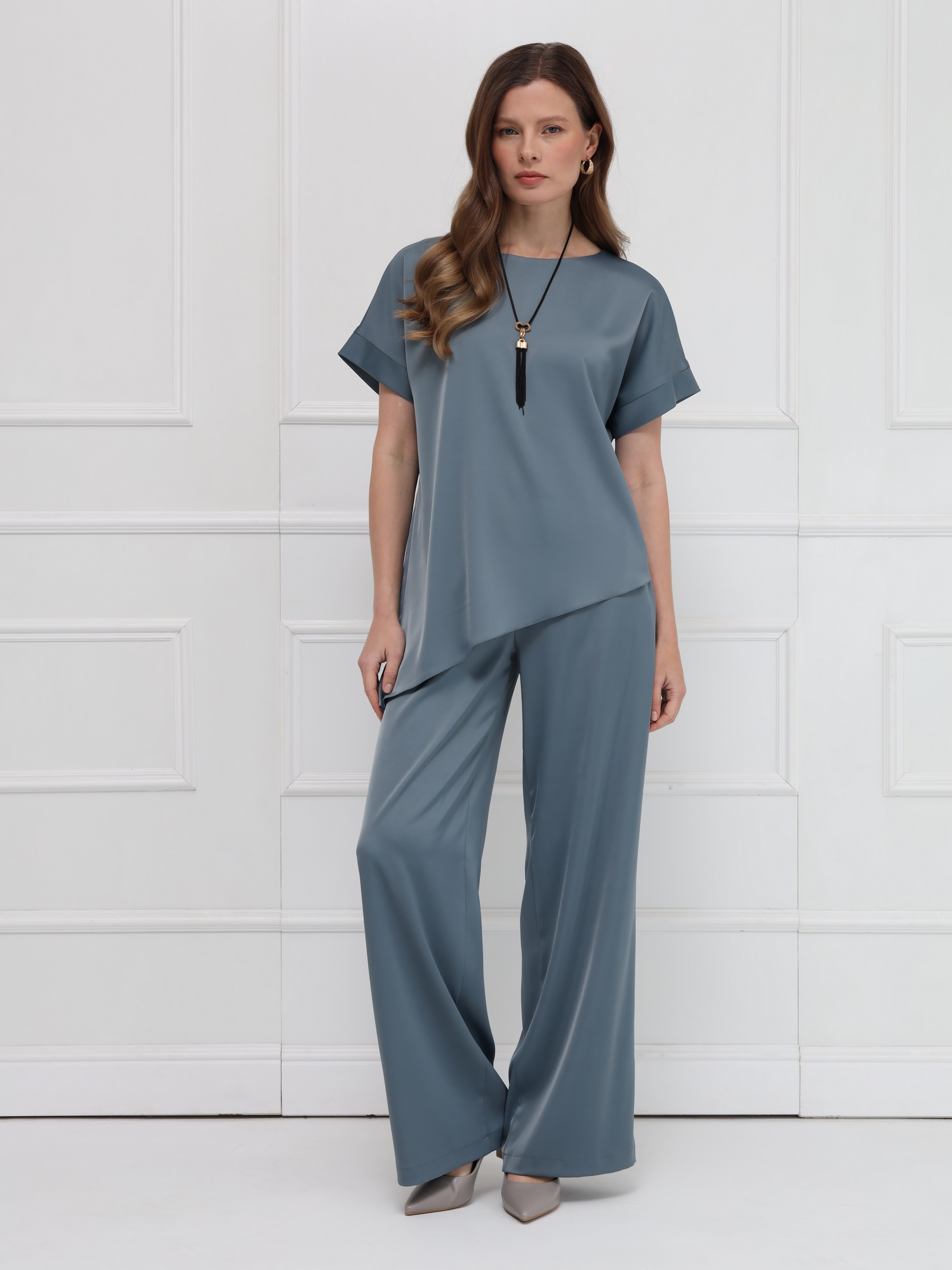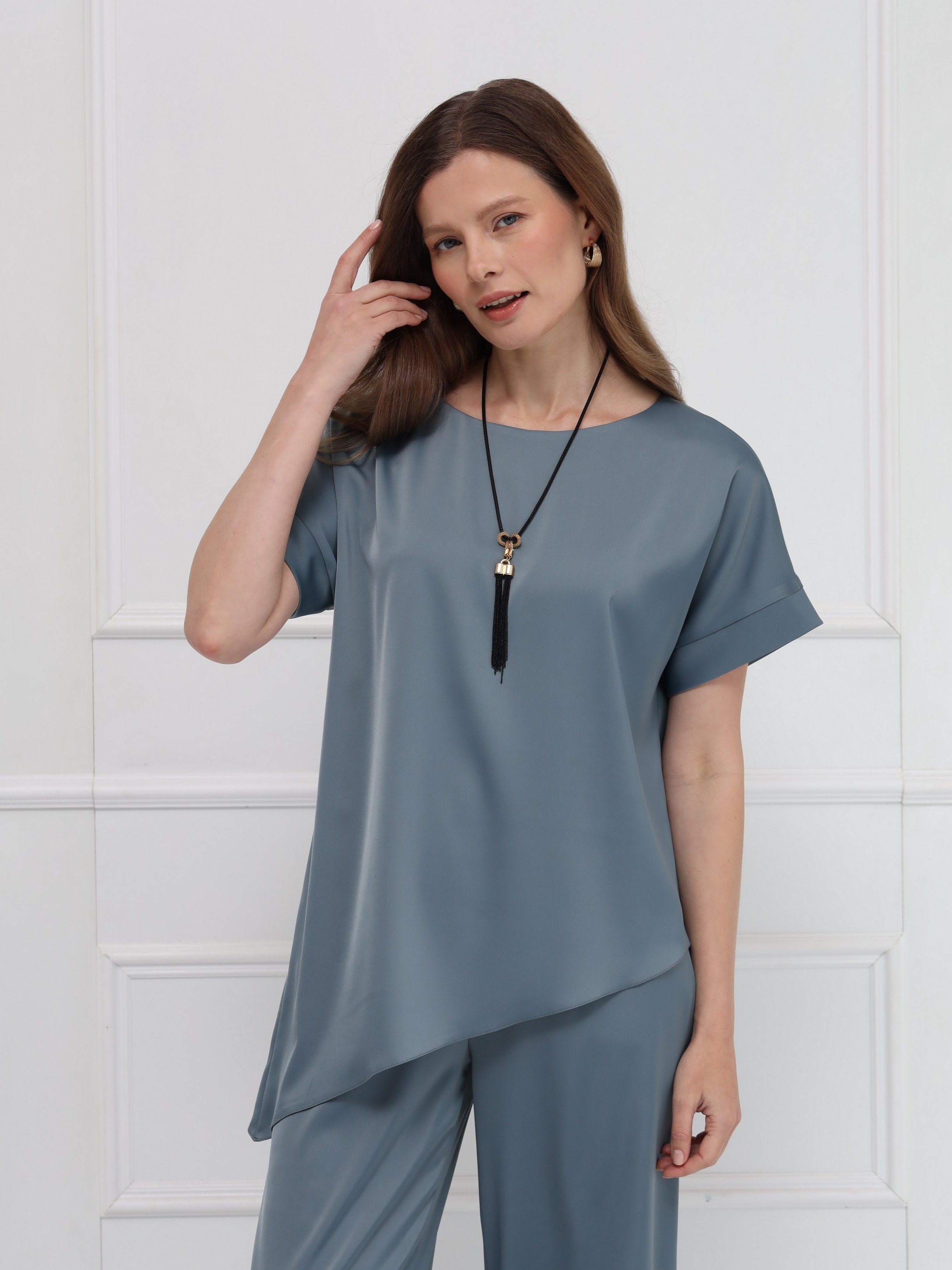 Блузка из атласа выглядит свежо и современно. Овальная горловина и короткие цельнокроеные рукава на манжетах создают аккуратный и изящный силуэт, асимметричная линия низа придаёт свободной модели динамику и лёгкость. Идеальная вещь для стильных и продуманных образов в насыщенных и красивых цветах. На фото блузка представлена с брюками Б-900 ЛНА(В6).