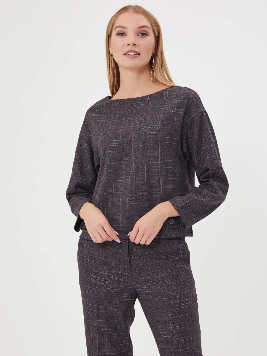 Описание: Блузка из серо-фиолетовой фактурной ткани. Декоративные хлястики с пуговицами в боковых швах. Этот костюмный топ просто создан для осенней поры. Сочетайте с брюками Б-703 МЖ(О)