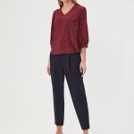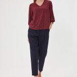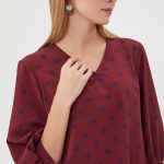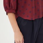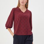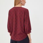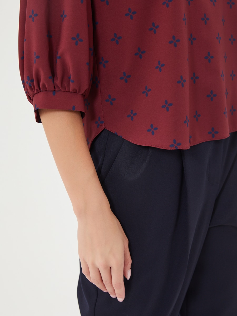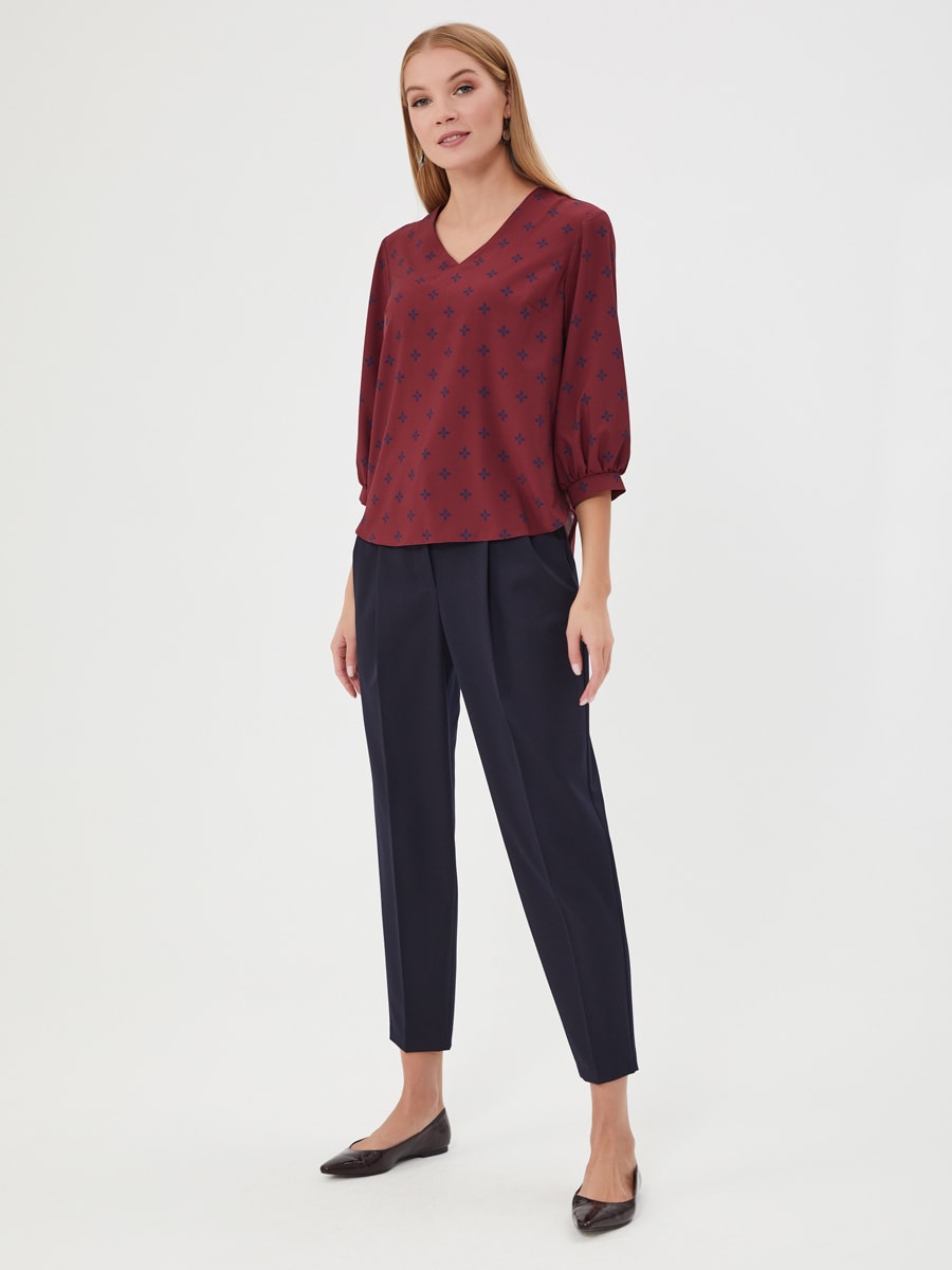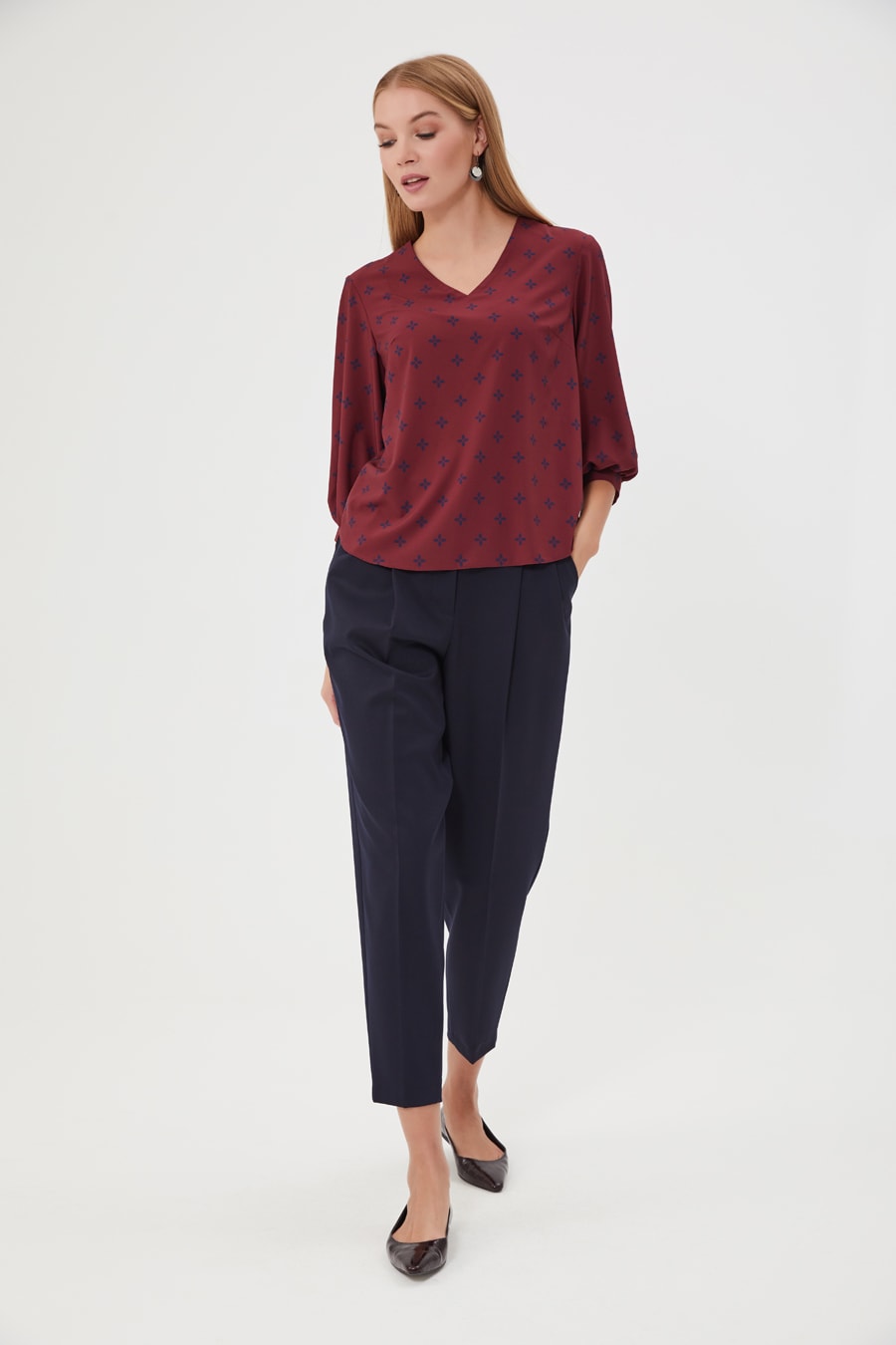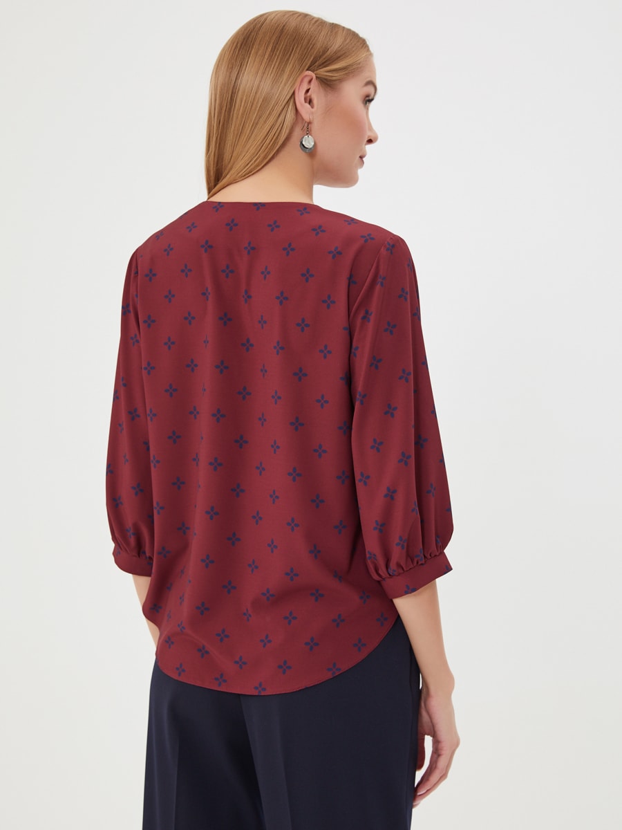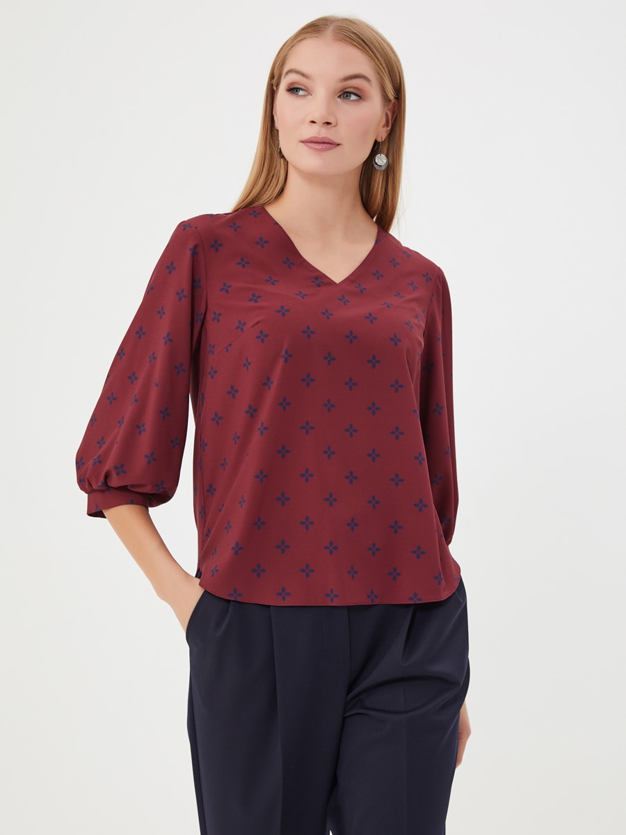 Описание: Блузка в бордовом цвете в мелкий узорный синий принт. Объемный рукав с манжетом. V-образный вырез.