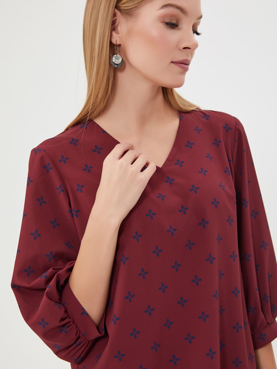 Описание: Блузка в бордовом цвете в мелкий узорный синий принт. Объемный рукав с манжетом. V-образный вырез.