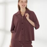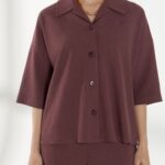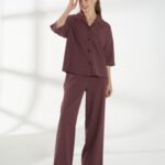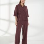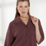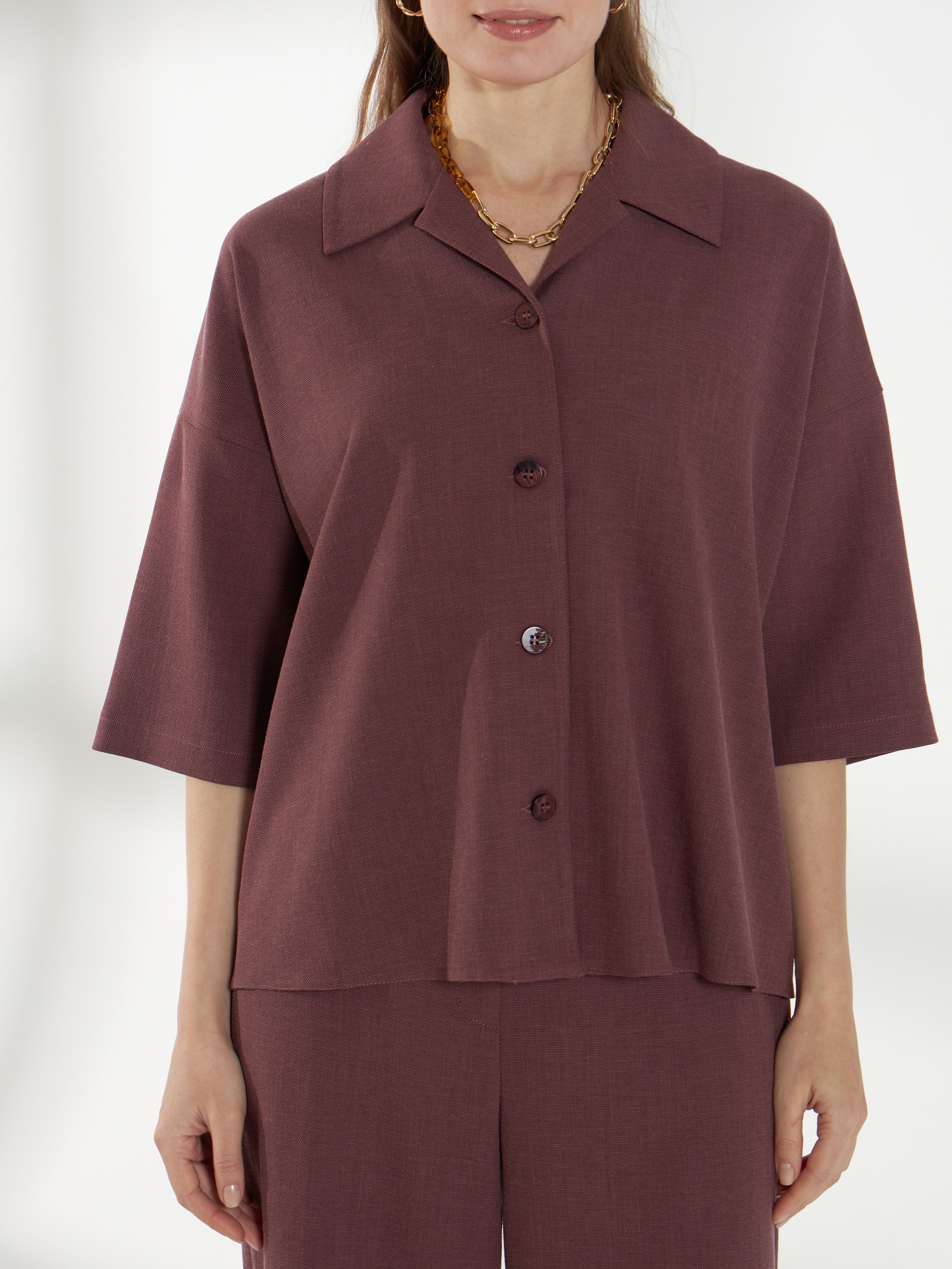 Свободная блуза, со спущенной линией плеча и короткими рукавами, из дышащей и пластичной ткани. Классический воротник и застежка на пуговицы сохраняют аккуратность силуэта. Винный оттенок добавляет глубины и элегантности образу, а свободный крой обеспечивает комфорт в течение дня. На фото блузка представлена с брюками Б-2047 ГРН(В6).