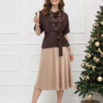 Блуза свободного кроя из гладкого атласа глубокого шоколадного оттенка — воплощение утончённой элегантности. Короткие цельнокроеные рукава придают образу лёгкость, а горловина с драпировкой мягко ниспадает изящными складками, создавая благородный акцент. Пояс-лента подчёркивает талию и формирует женственный силуэт, который легко подстроится под ваш стиль — завяжите его бантом для романтичного образа или оставьте свободно для более расслабленного настроения. На фото блузка представлена с юбкой А-2035 КСР(О5)