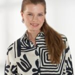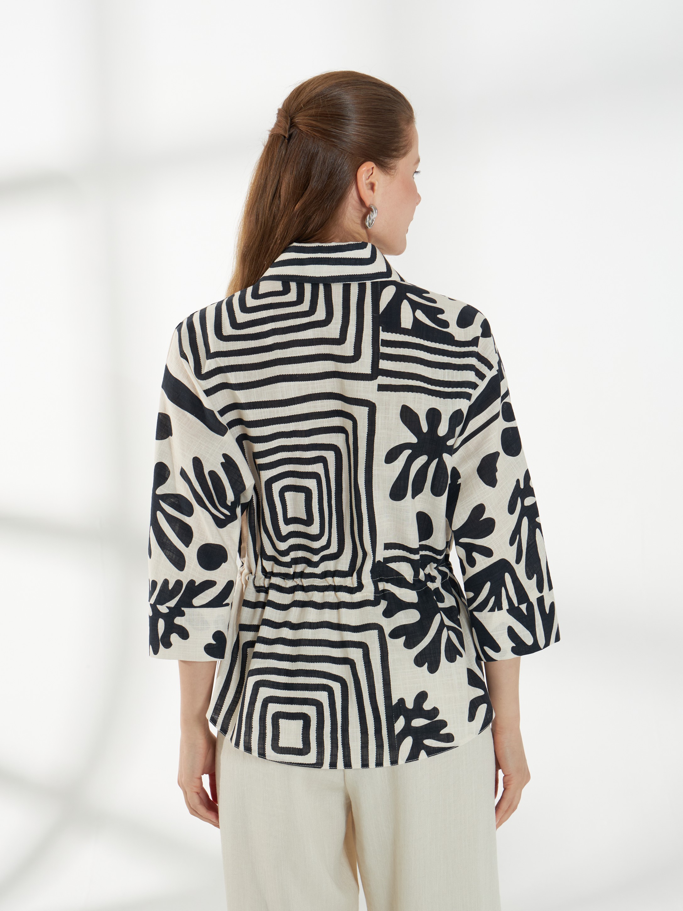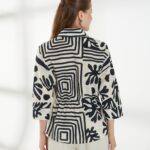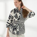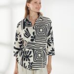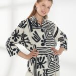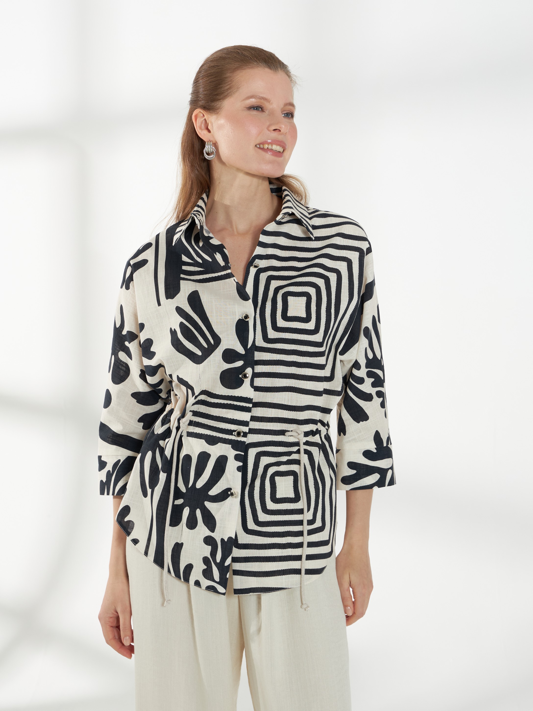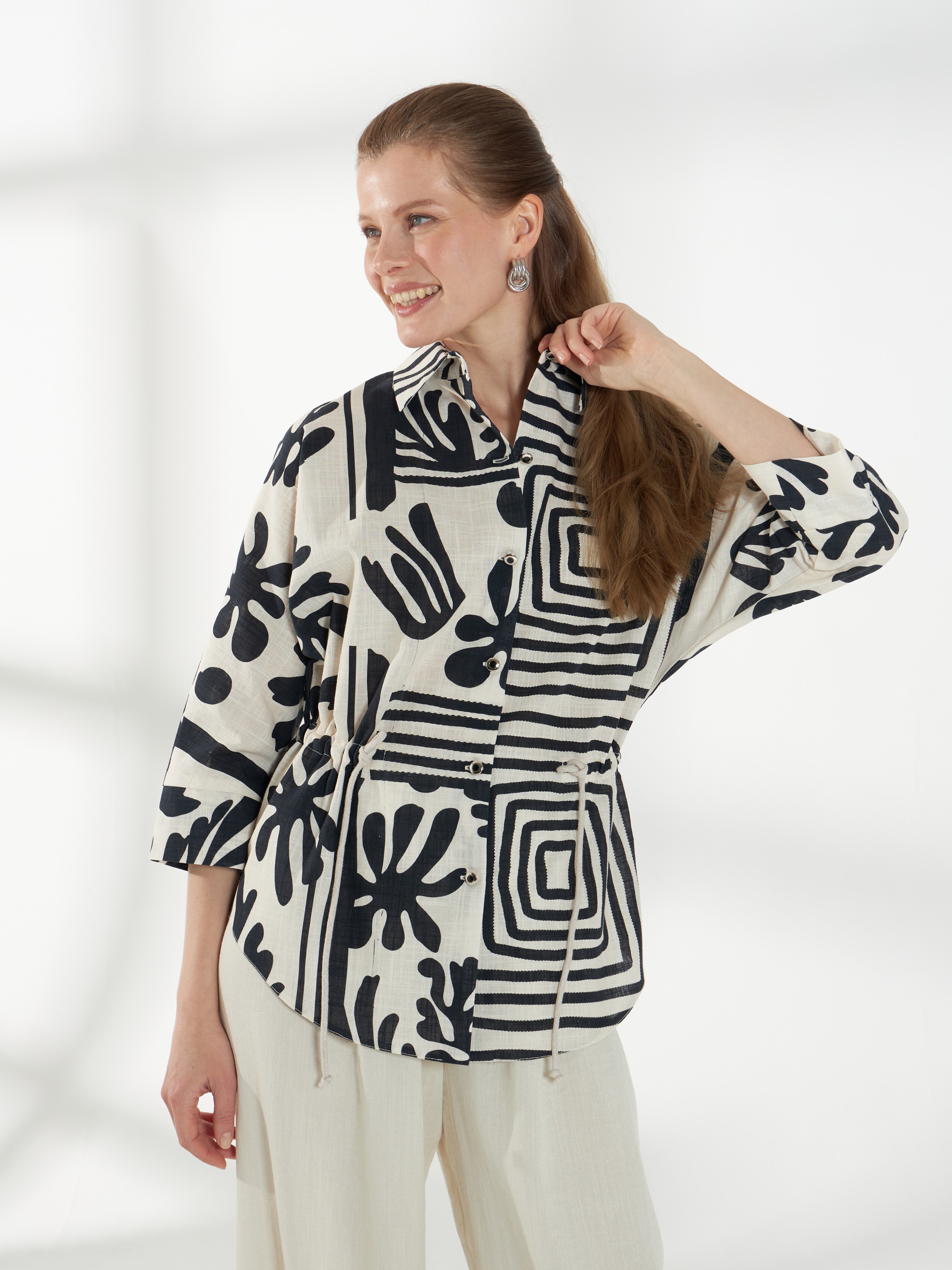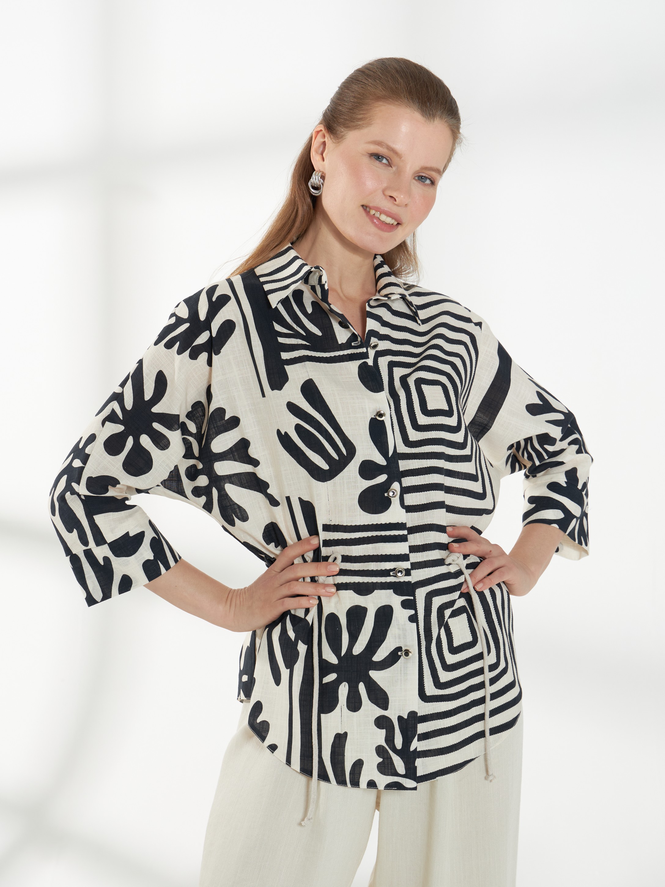 Легкая блуза свободного кроя, из хлопка с крупным черным арт-дизайном на молочном фоне. Цельнокроеные рукава 3/4 и рубашечный воротник создают аккуратный и непринужденный силуэт. Планка с изящными пуговицами и фигурная линия низа добавляют детализацию, а шнур в кулисе позволяет при желании слегка приталить модель, сохраняя комфорт и легкость посадки. На фото блузка представлена с брюками Б-2057 МЛН(В6).