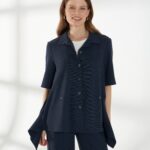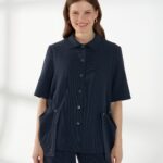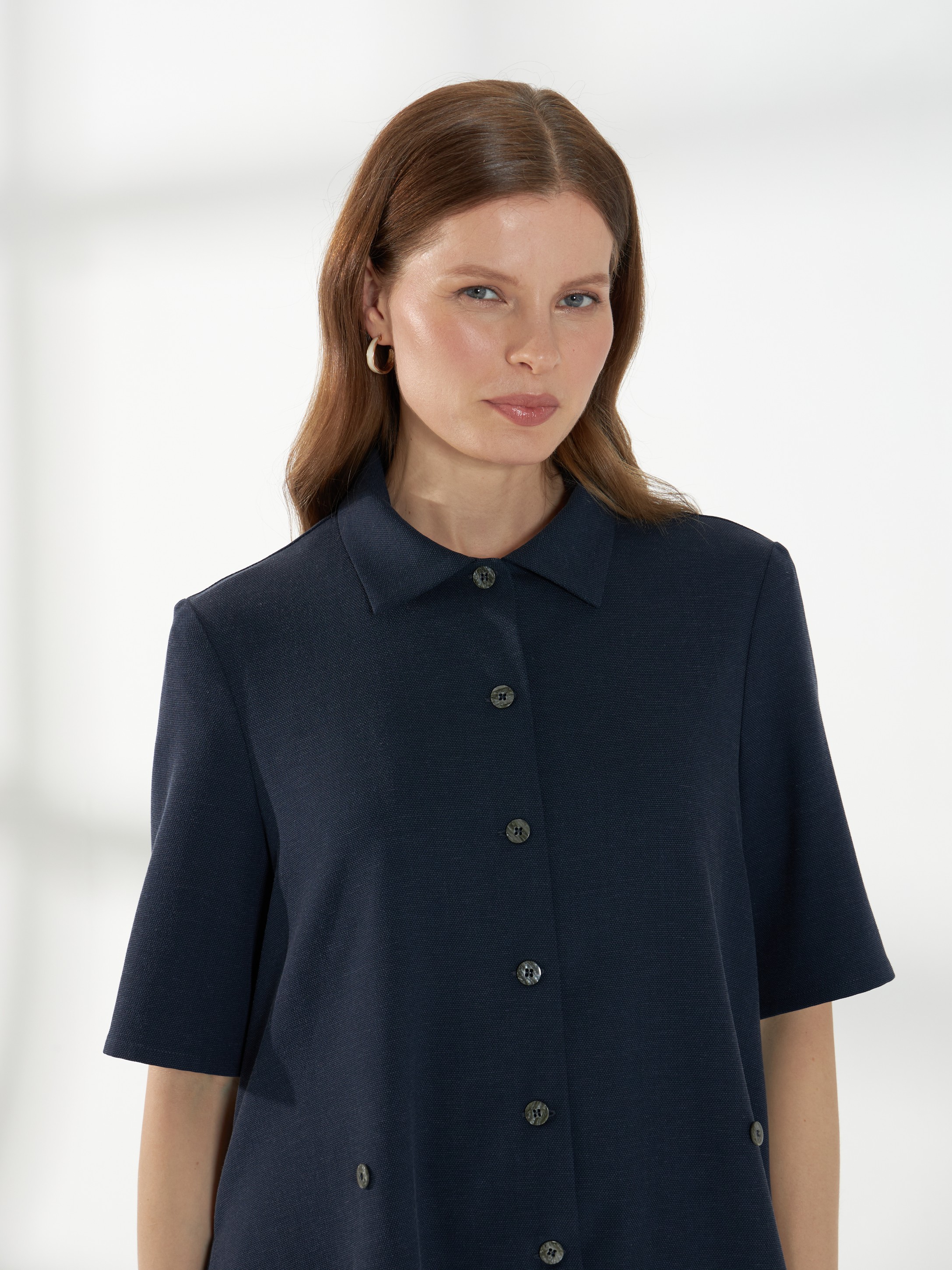 Блуза-рубашка из легкой, дышащей и пластичной ткани в темно-синем оттенке. Модель сочетает классические элементы и выразительную деталь внизу: летящая нижняя часть мягко ниспадает драпировкой или с помощью пуговиц формирует эффект накладного кармана. Классический воротник и застежка на пуговицы сохраняют аккуратность и универсальность образа. Втачной короткий рукав обеспечивает комфортную посадку. Ткань легкая, приятная к телу и красиво держит форму, подчеркивая плавность линий. На фото блузка представлена с брюками Б-900 ИГО(В6) и джемпером С-43 ЛЕТ(В6).