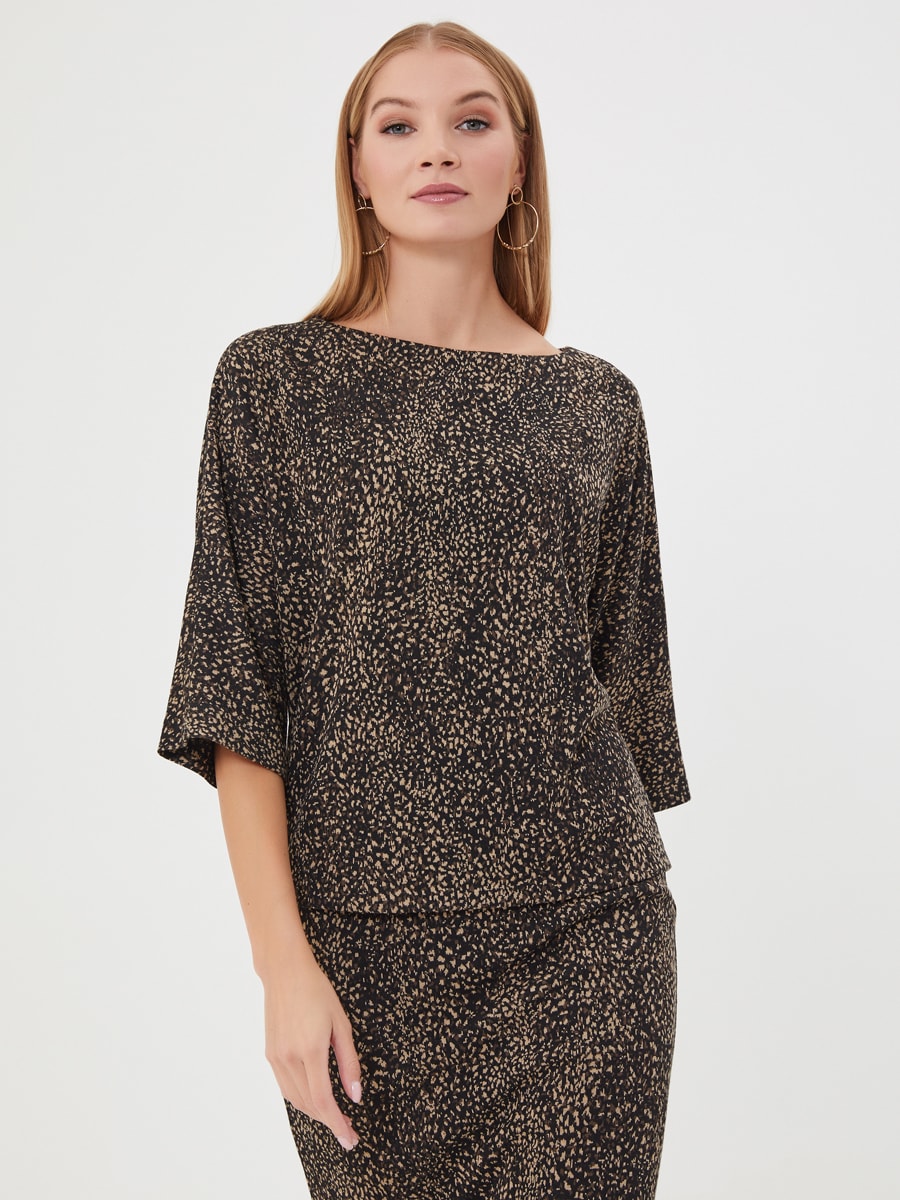 Описание: Трикотажная блузка с принтом в лапку. Рукав со спущенной линией плеча, заужается к запястьям. Дополните юбкой А-805 ЛАП(О) из той же ткани для полноценного комплекта.
