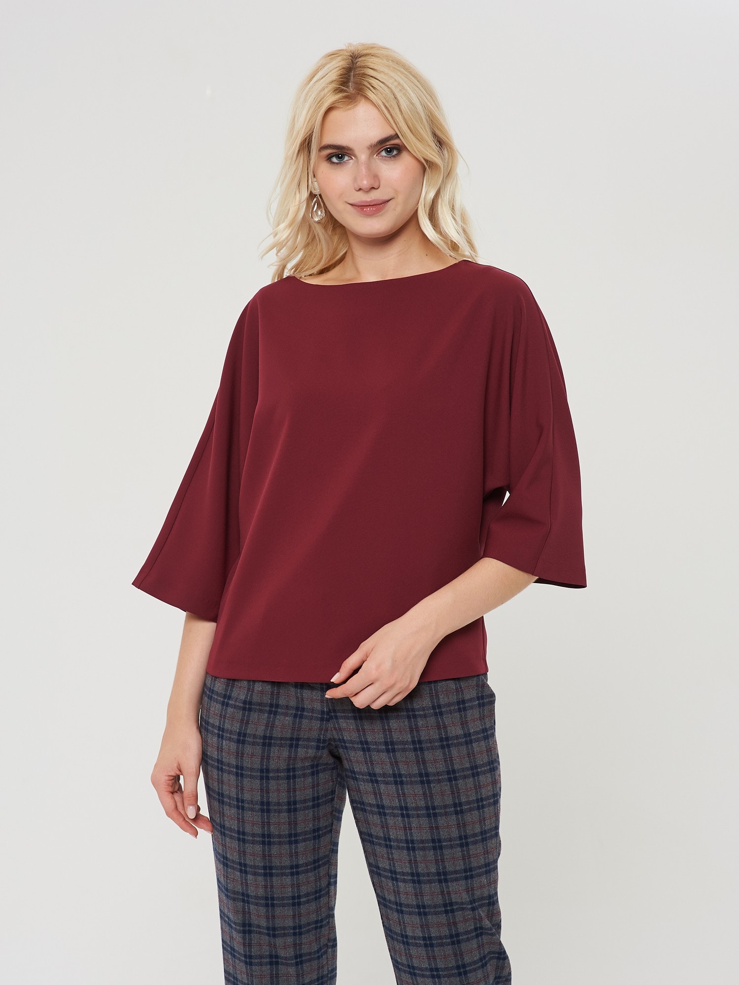 Свободная Блузка глубокого оттенка "марон" с цельнокроенными рукавами. Будет отлично смотреться как с брюками , так и в сочетании с джинсами. Дополнена брюками Б-901 ВКС(О9)