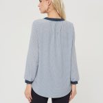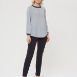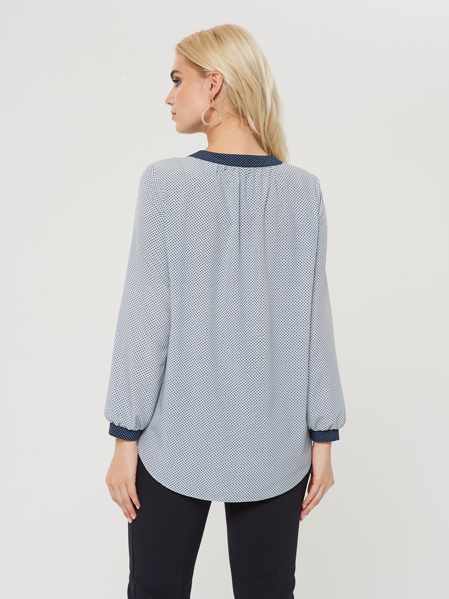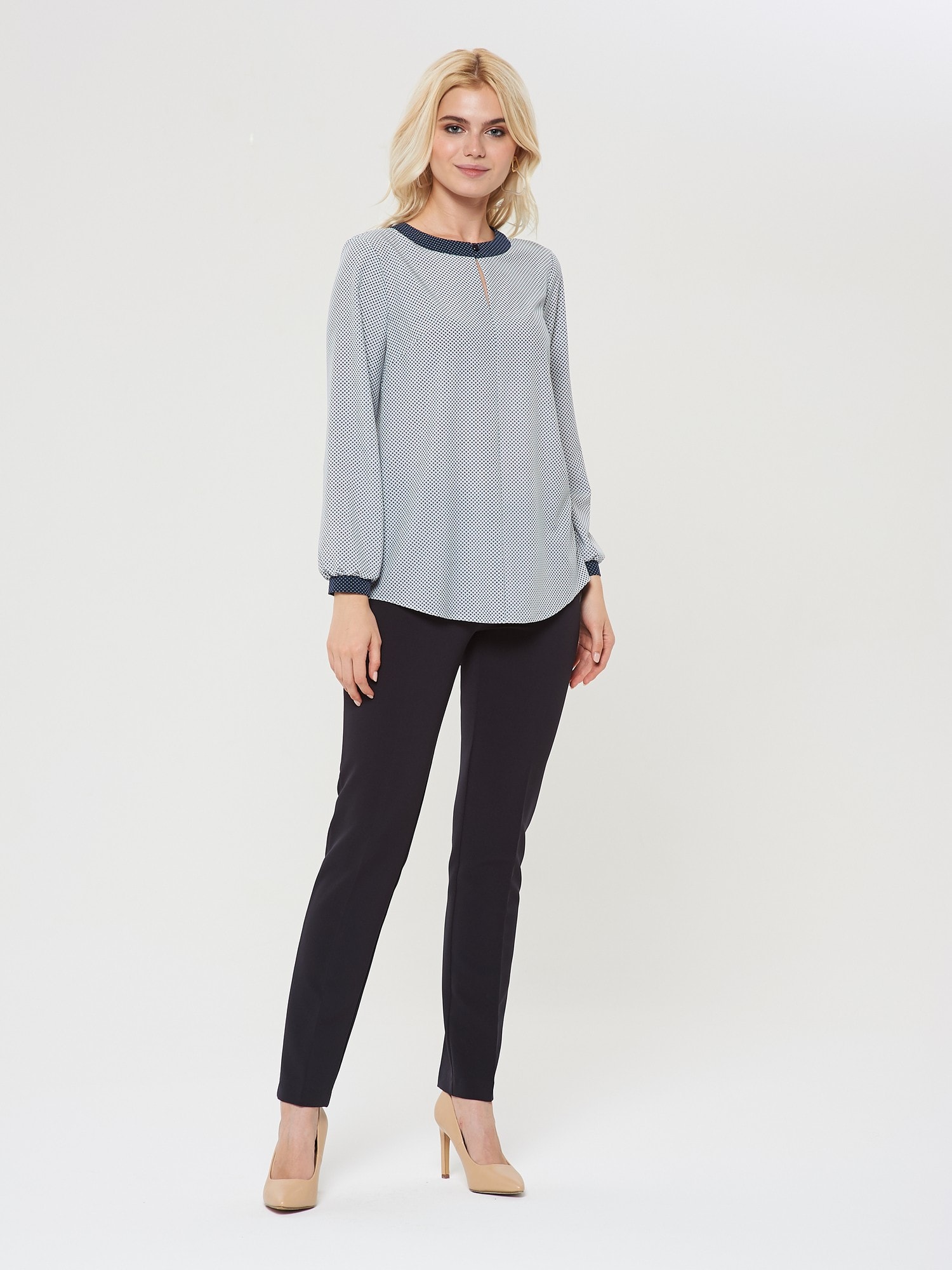 Блузка с круглым вырезом горловины и контрастными элементами в виде манжет и горловины. Застежка на пуговицу спереди. Сочетайте с брюками Б-902 ДС(О9)