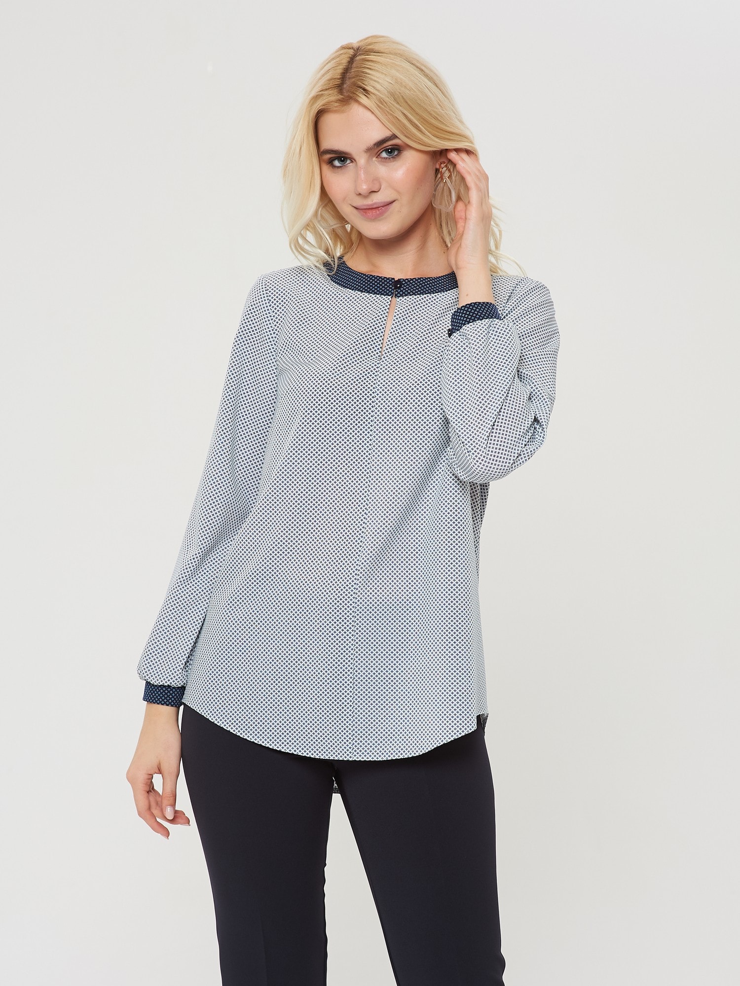 Блузка с круглым вырезом горловины и контрастными элементами в виде манжет и горловины. Застежка на пуговицу спереди. Сочетайте с брюками Б-902 ДС(О9)