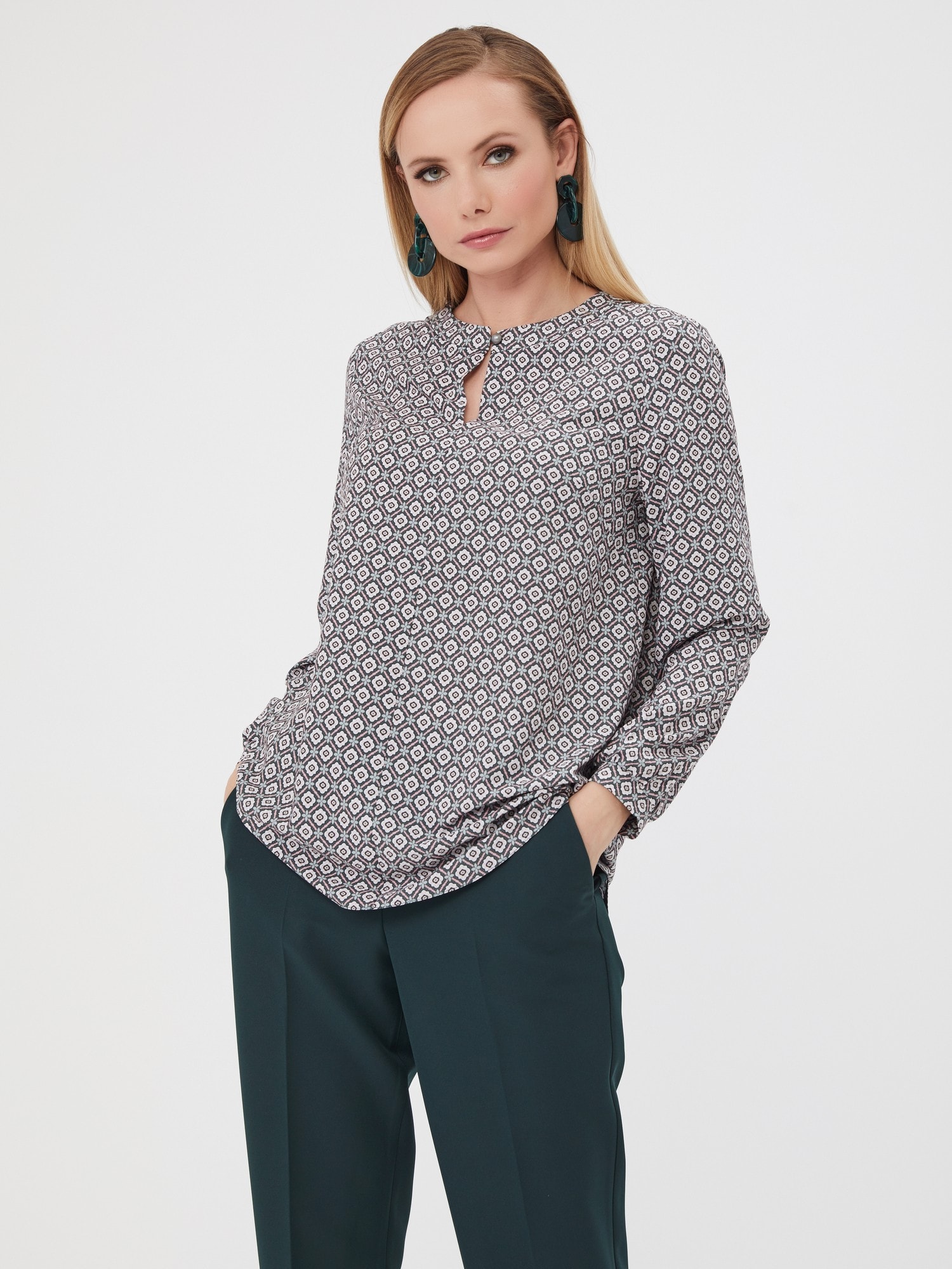 Блузка с застежкой петелькой спереди. Принт в зелено-розовых тонах. Небольшая сборка на спинке. Прекрасно дополняется Б-703 ИЗ(О) брюками и жилетом В-803 ИЗ(О)