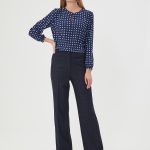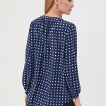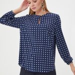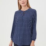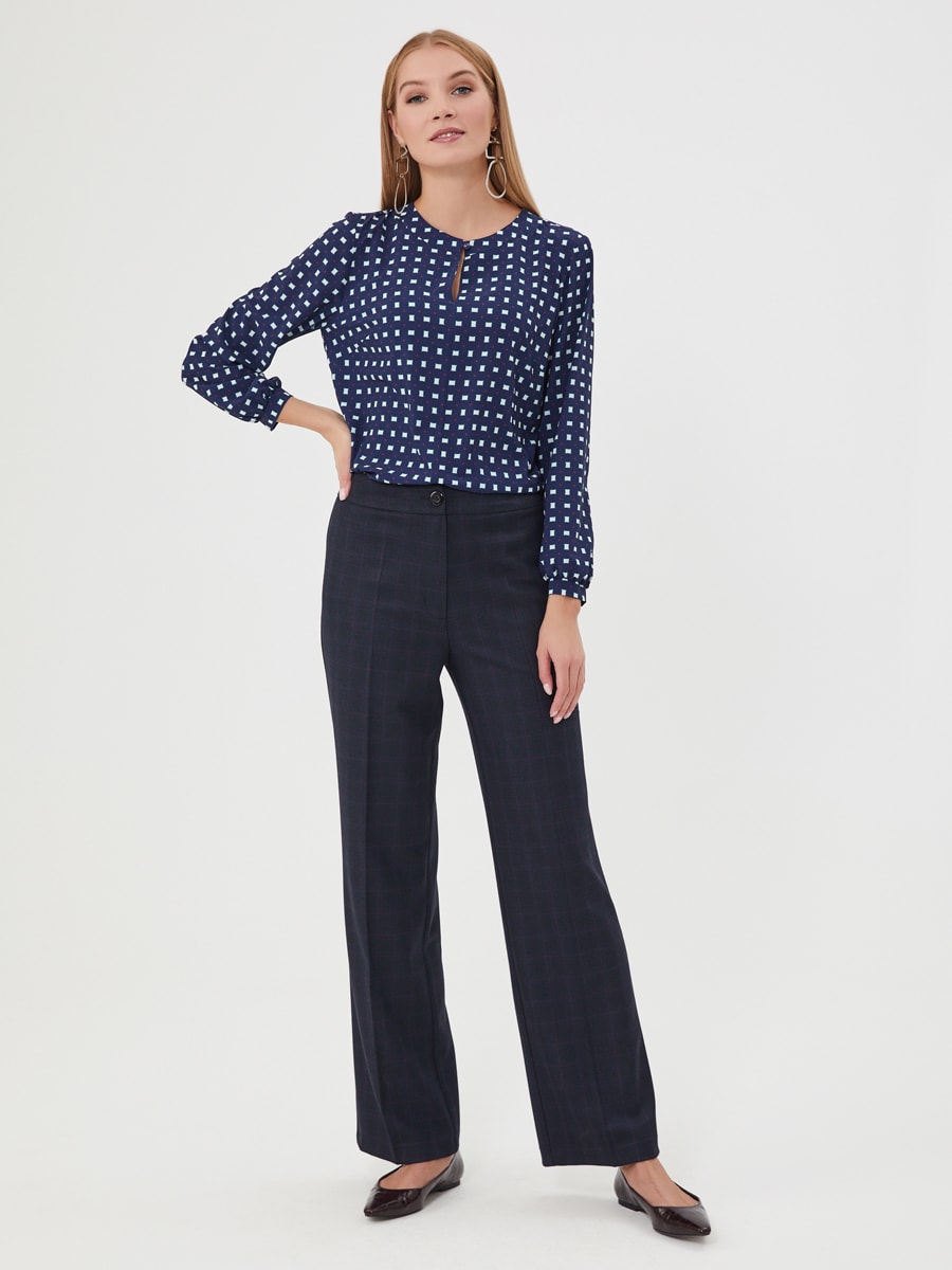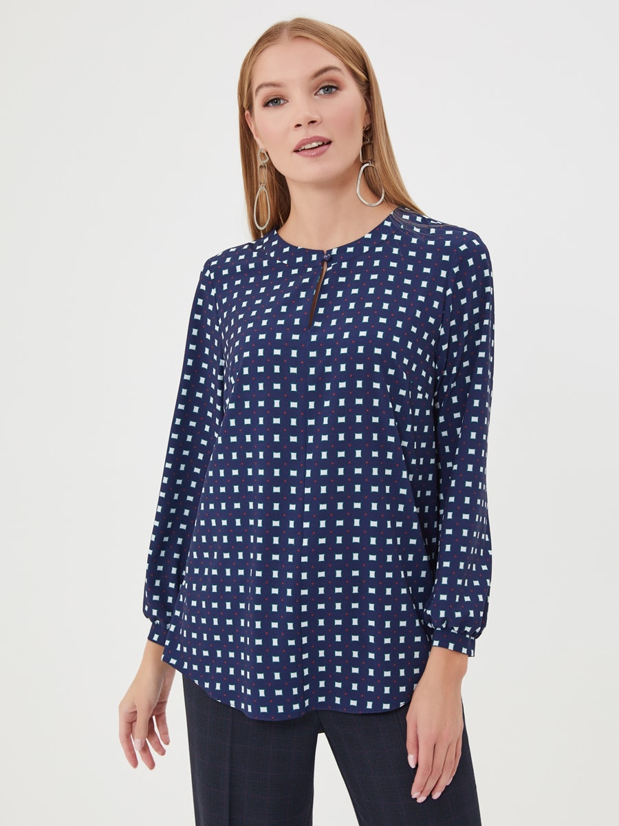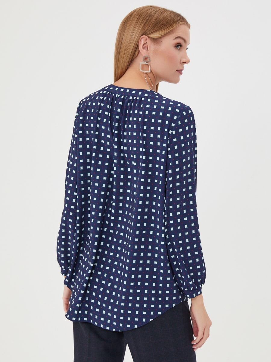 Описание: Блузка в сине-белый геометрический паттерн. Круглая линия воротника, застежка на пуговицу спереди. Небольшая сборка по спинке. Блузка из капсулы "Ягодная панакота"