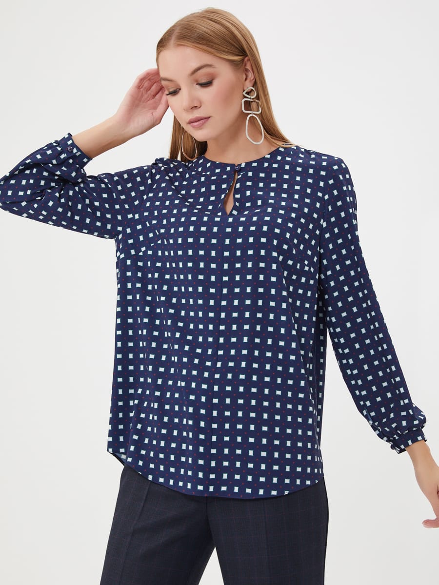 Описание: Блузка в сине-белый геометрический паттерн. Круглая линия воротника, застежка на пуговицу спереди. Небольшая сборка по спинке. Блузка из капсулы "Ягодная панакота"