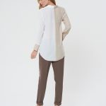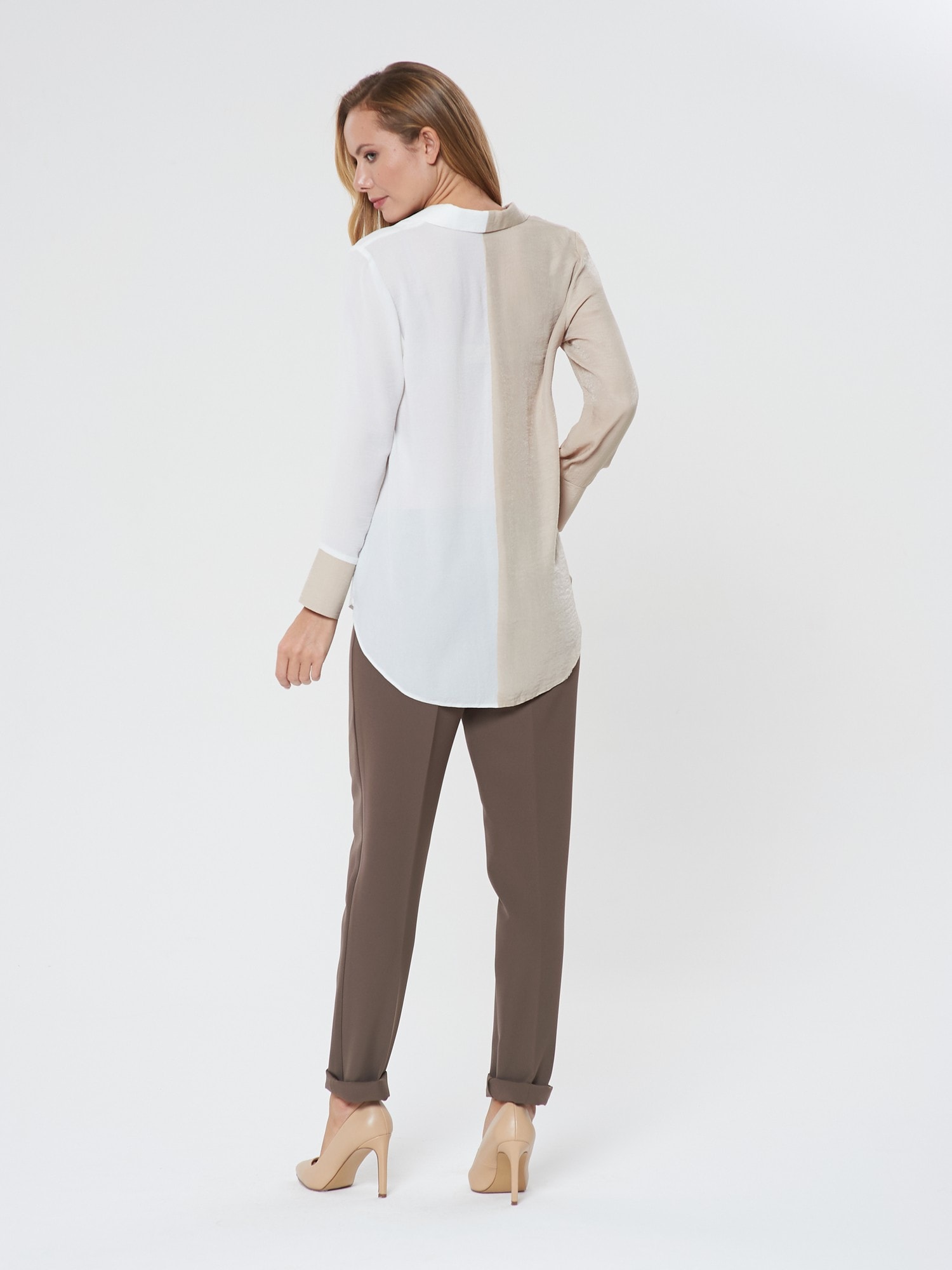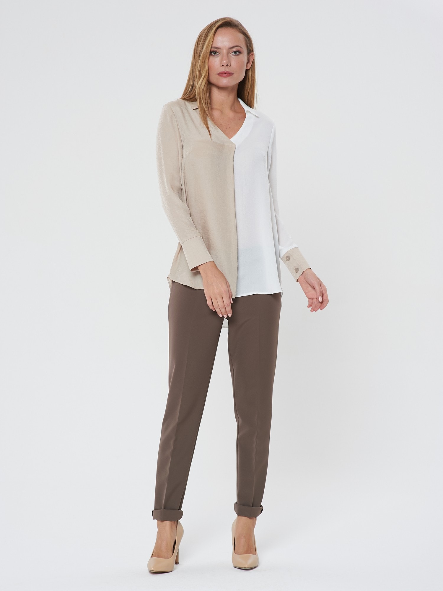 Оригинальная блузка из двух половинок. V- образный вырез подчеркивает изящность шеи. Отложной воротник и манжеты на двух пуговицах. Сочетайте с брюками Б-117 МД(В20)