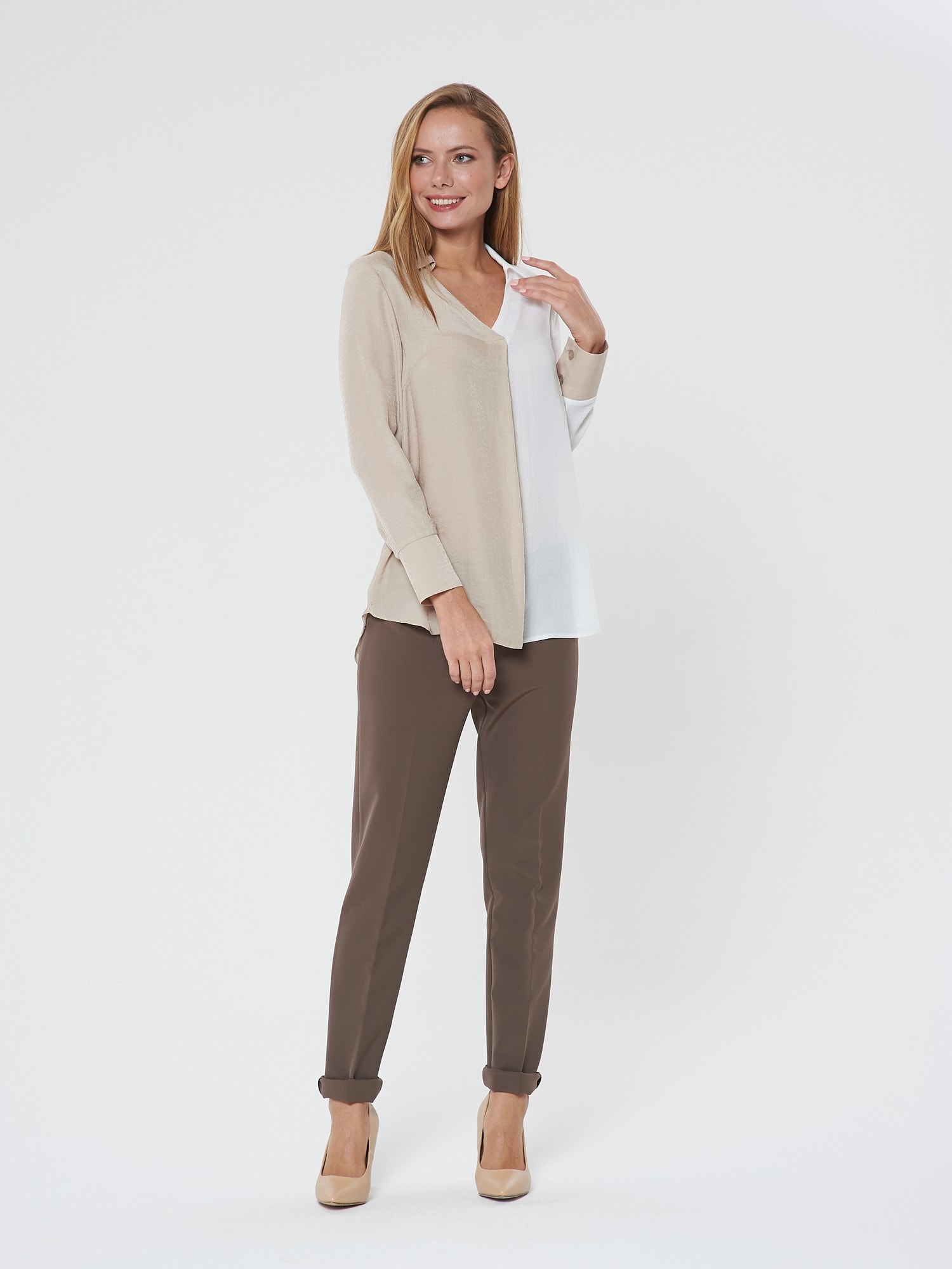 Оригинальная блузка из двух половинок. V- образный вырез подчеркивает изящность шеи. Отложной воротник и манжеты на двух пуговицах. Сочетайте с брюками Б-117 МД(В20)