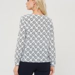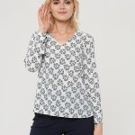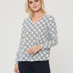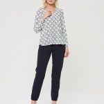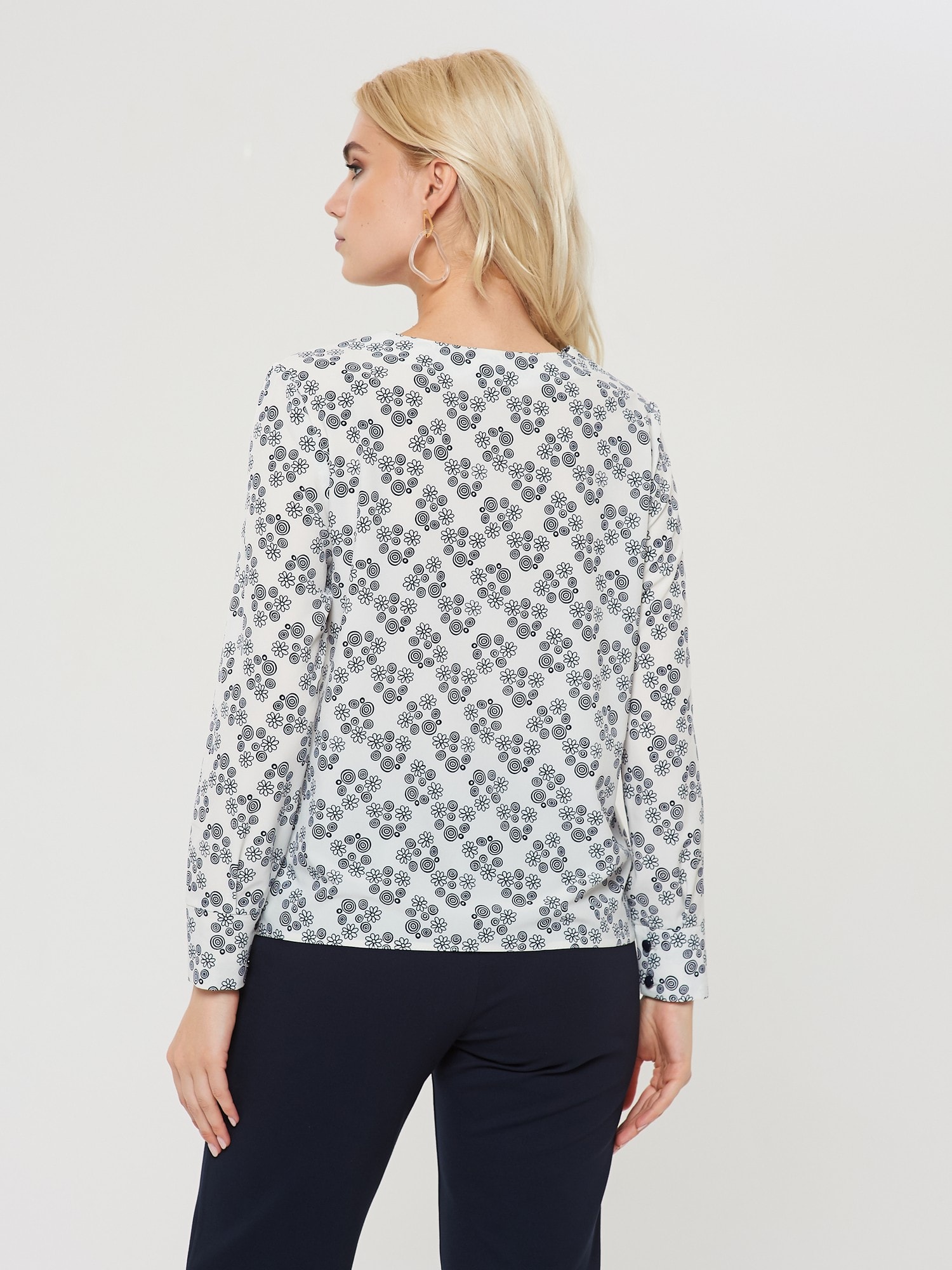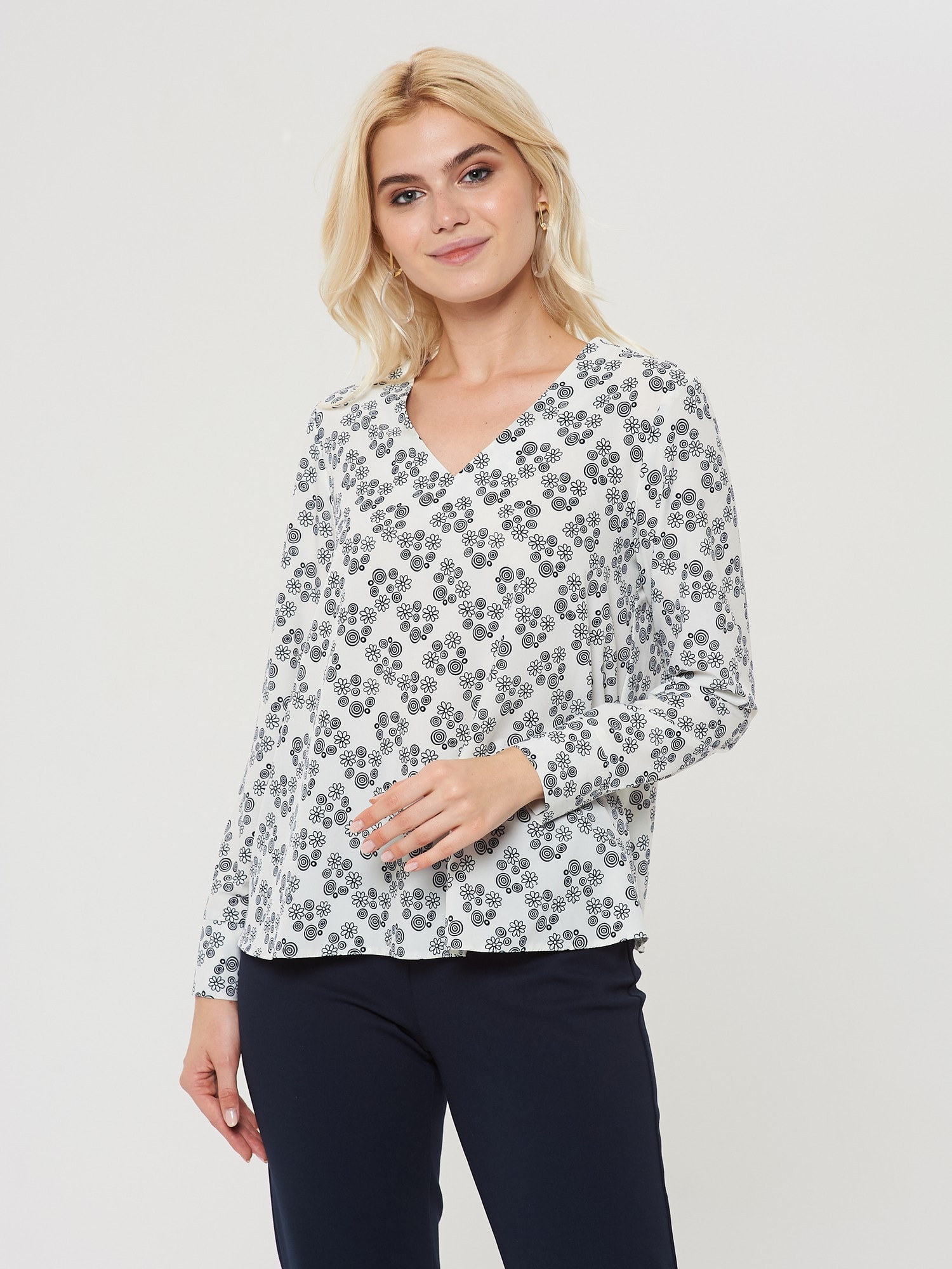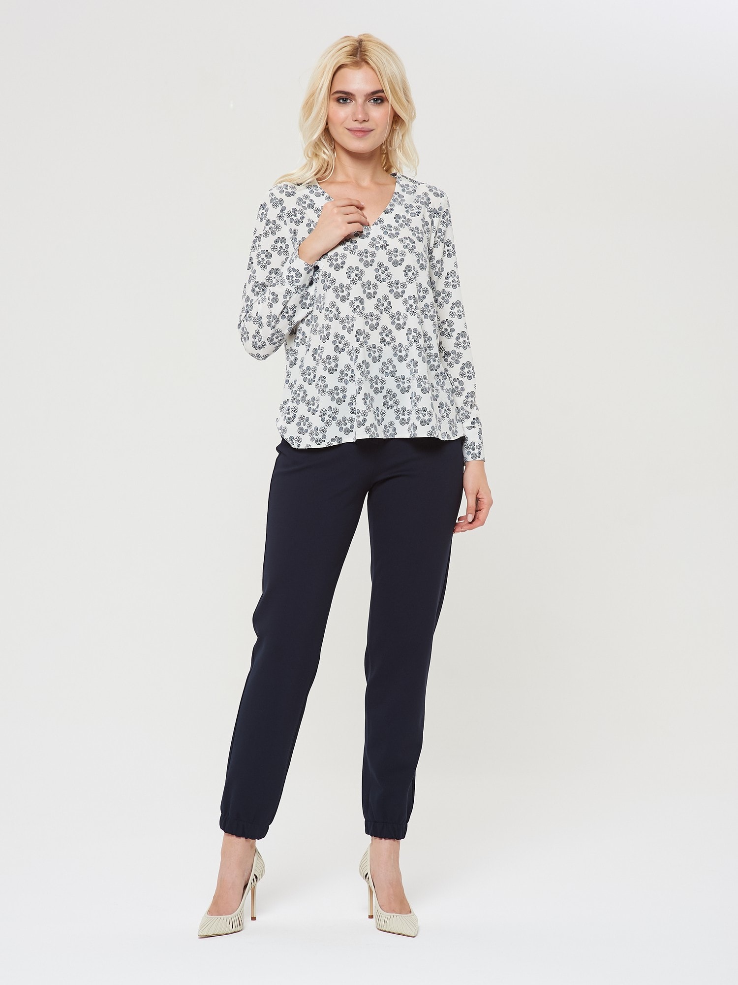 Блузка с нежным флоральным принтом в сине-белой гамме. V-образный вырез визуально удлинняет шею. Блузка легко сочетается как с брюками, так и с юбками. Образ на фото дополнен брюками Б-902 ДС(О9)