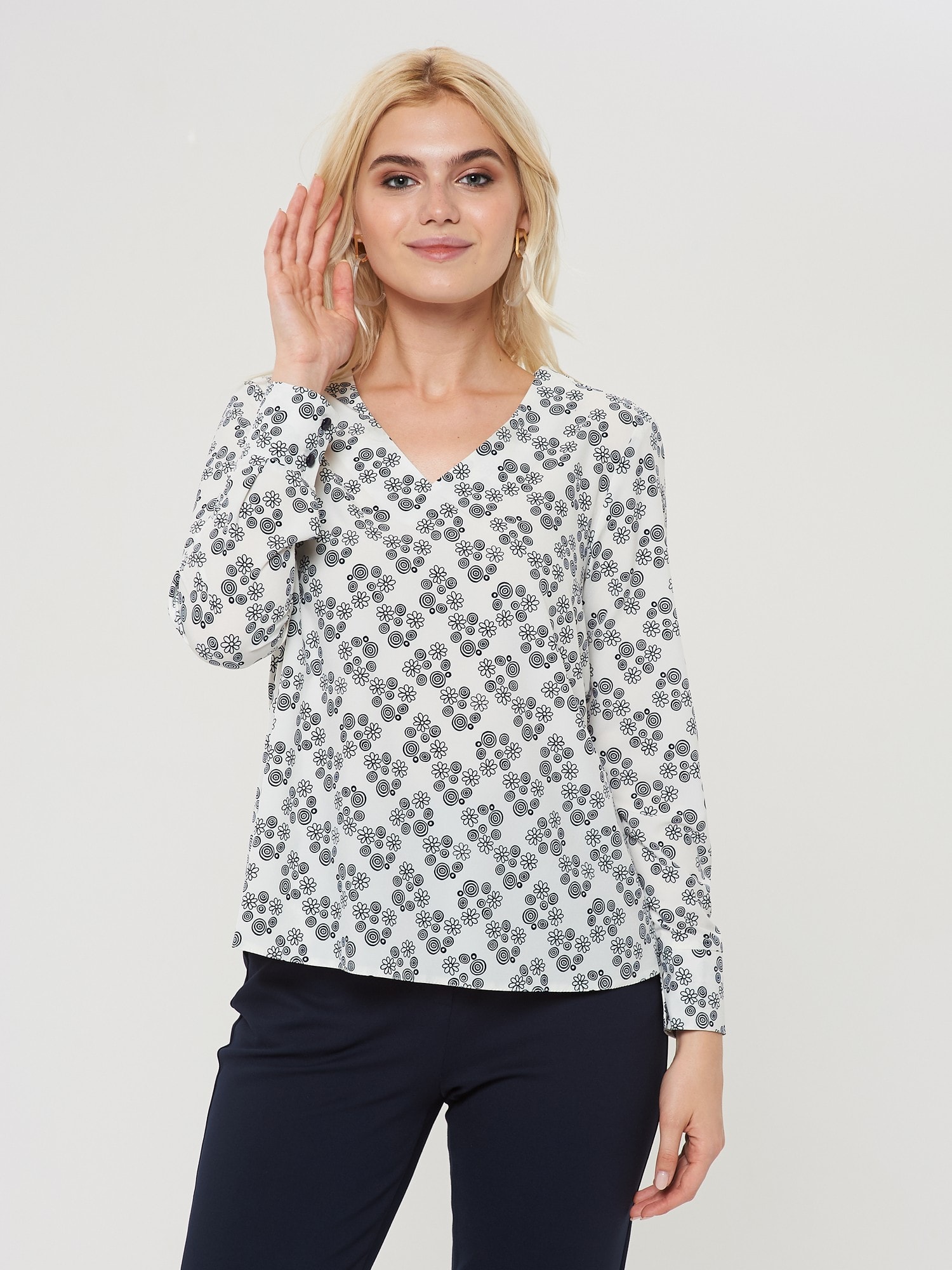Блузка с нежным флоральным принтом в сине-белой гамме. V-образный вырез визуально удлинняет шею. Блузка легко сочетается как с брюками, так и с юбками. Образ на фото дополнен брюками Б-902 ДС(О9)