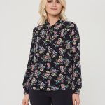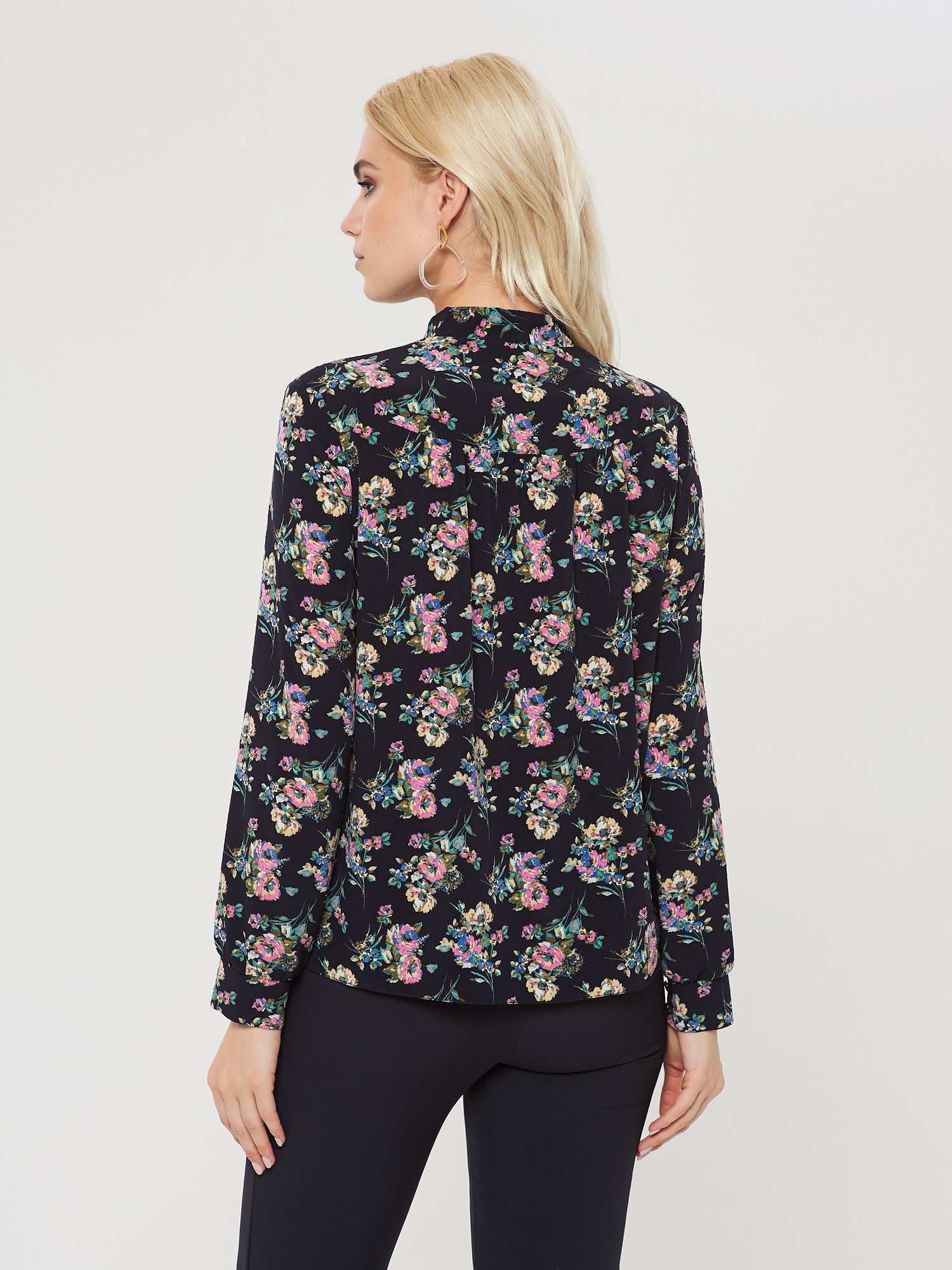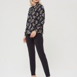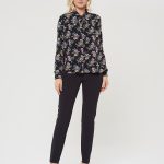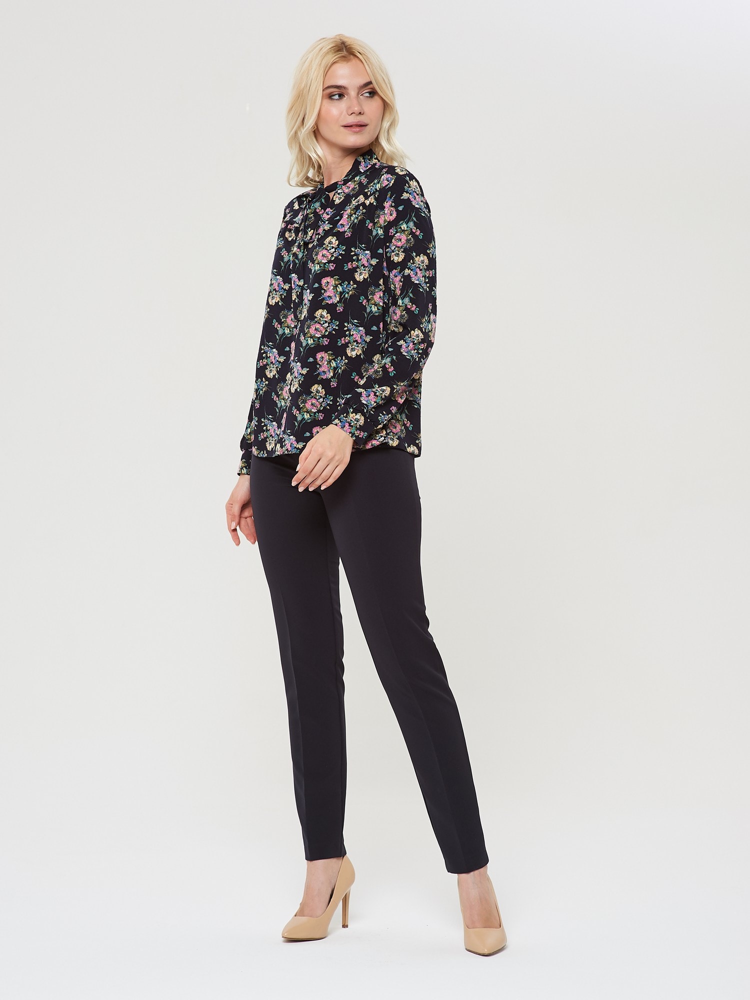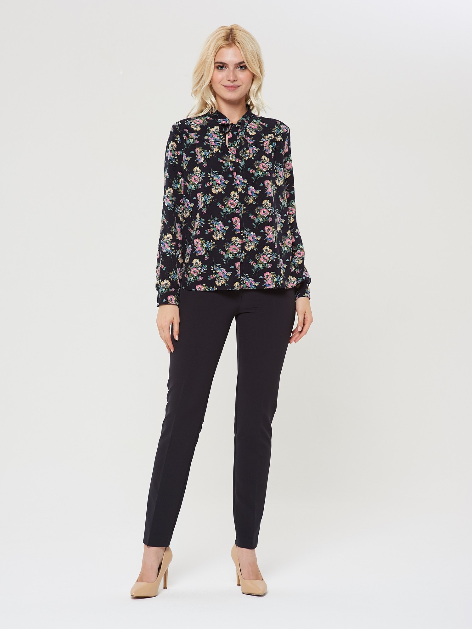 Блузка с воротником "аскот" в глубоком синем оттенке. Благодаря принту в виде цветов блуза выглядит празднично и нарядно. Сочетайте с юбкой А-900 ДС(О9)