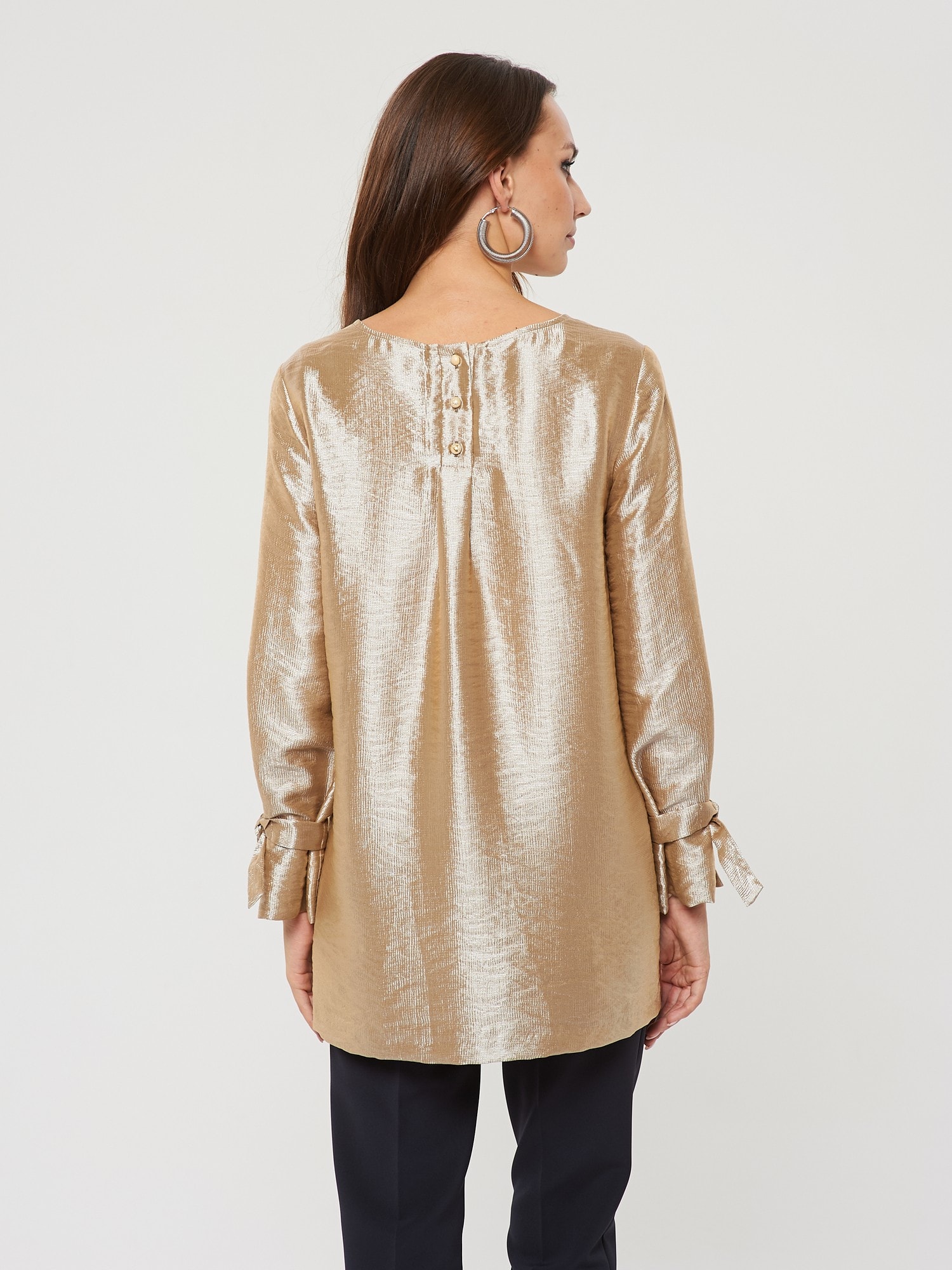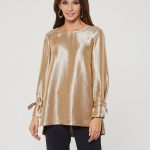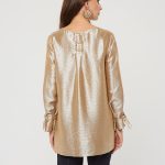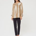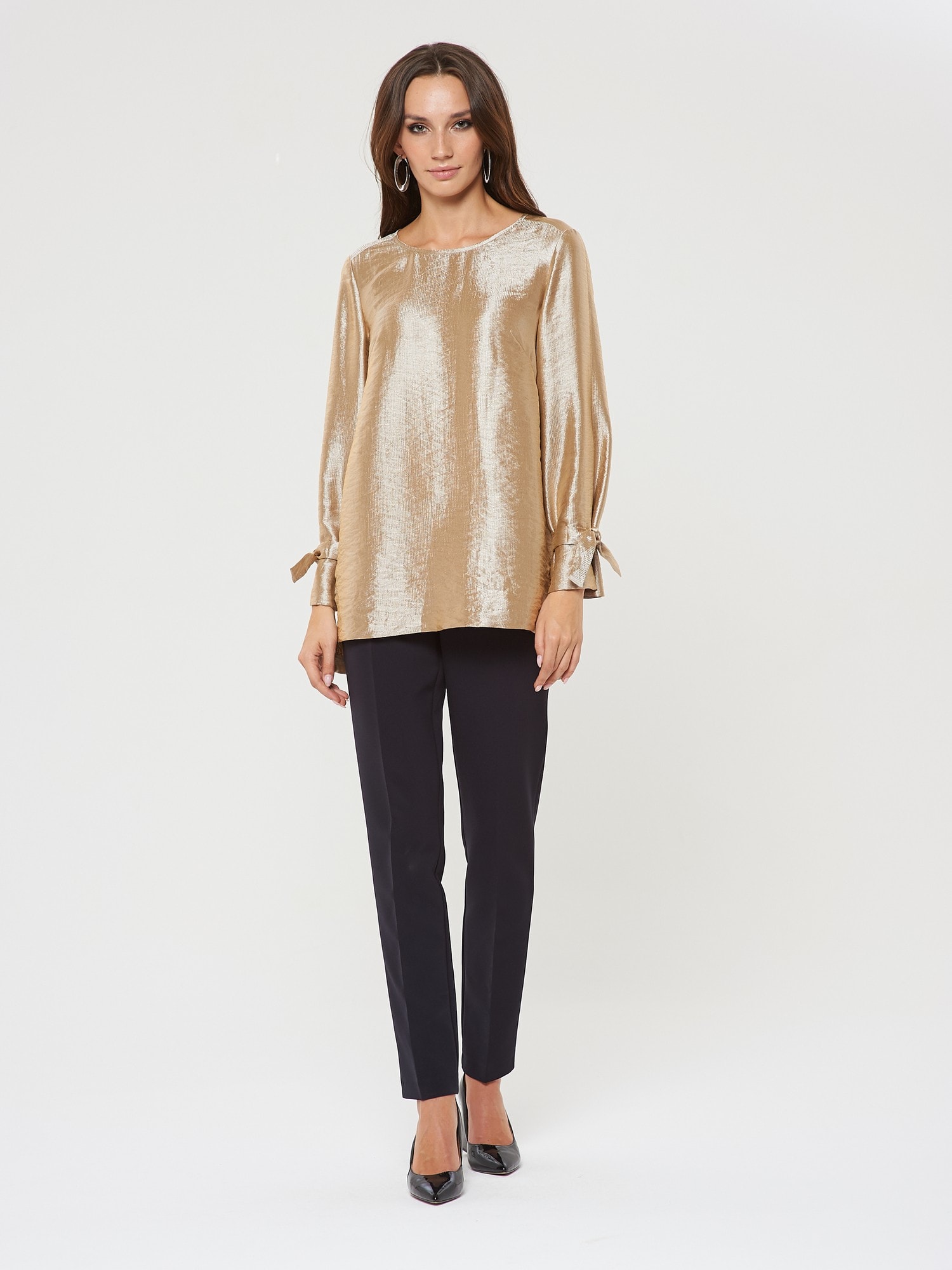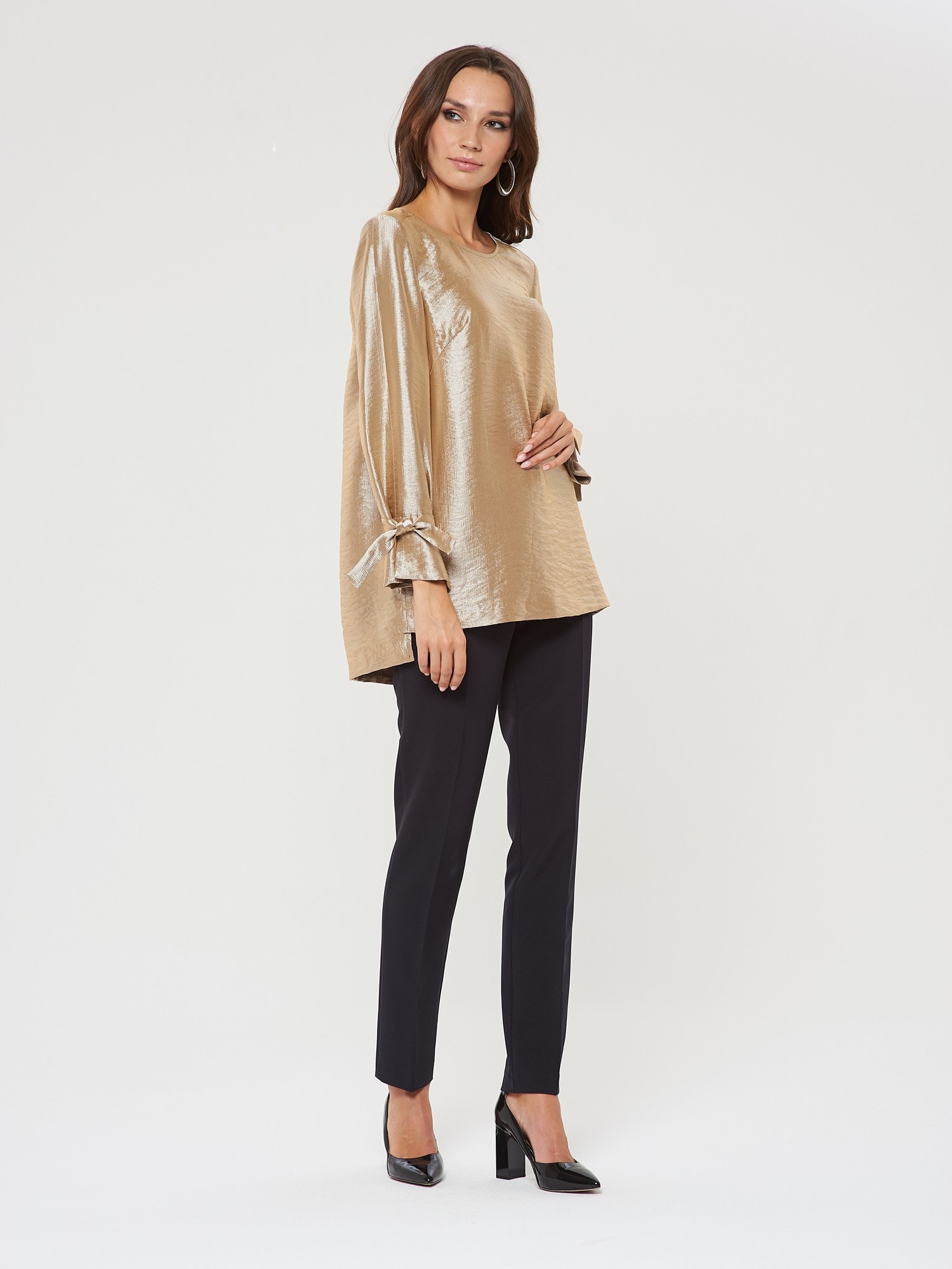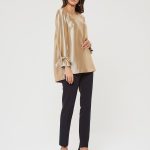 Блузка в теплом перламутрово-золотистом оттенке. Завязки на рукавах в виде бантиков. Застежка в форме усеченной планки на спинке. Такая блузка может стать основой как для вечерних, так и для повседневных образов.