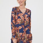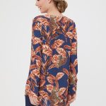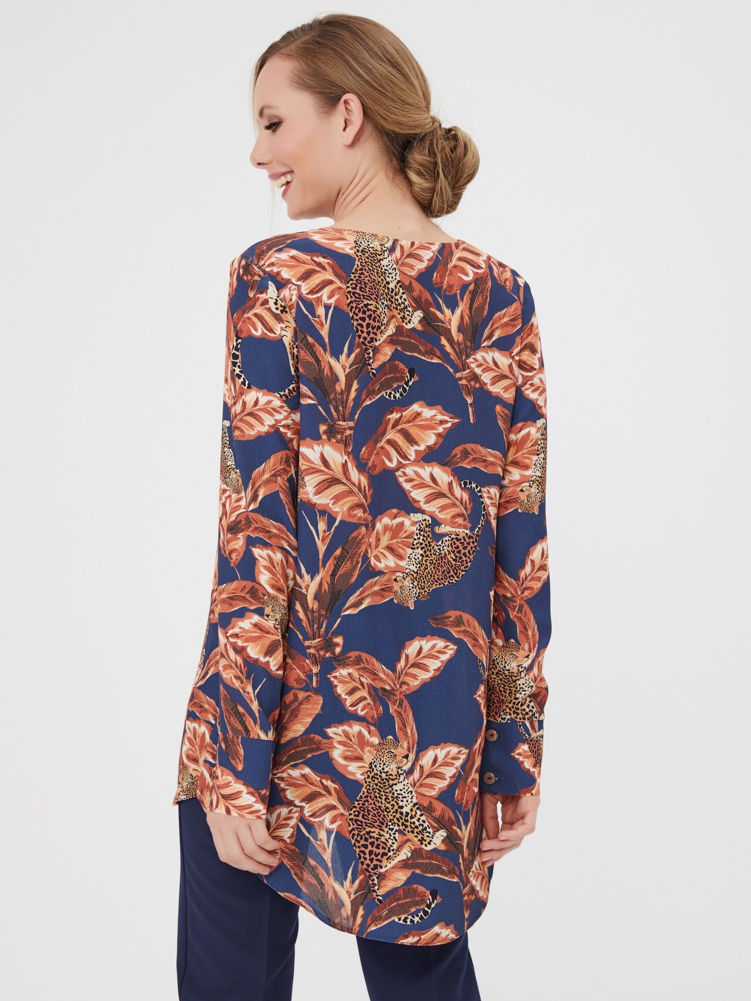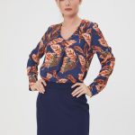 Яркая блузка с принтом в сине-кирпичных оттенках. V-образный вырез горловины с защипом для свободы движений. Рукава с манжетами, удлиненная спинка. Дополните образ юбкой А-900 КБ(О) или брюками Б-117 КБ(О)