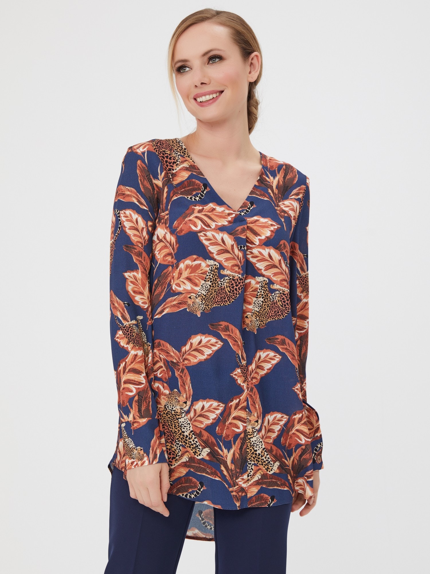 Яркая блузка с принтом в сине-кирпичных оттенках. V-образный вырез горловины с защипом для свободы движений. Рукава с манжетами, удлиненная спинка. Дополните образ юбкой А-900 КБ(О) или брюками Б-117 КБ(О)