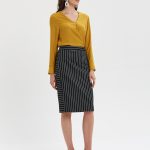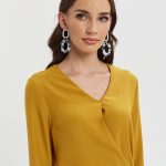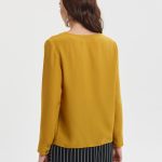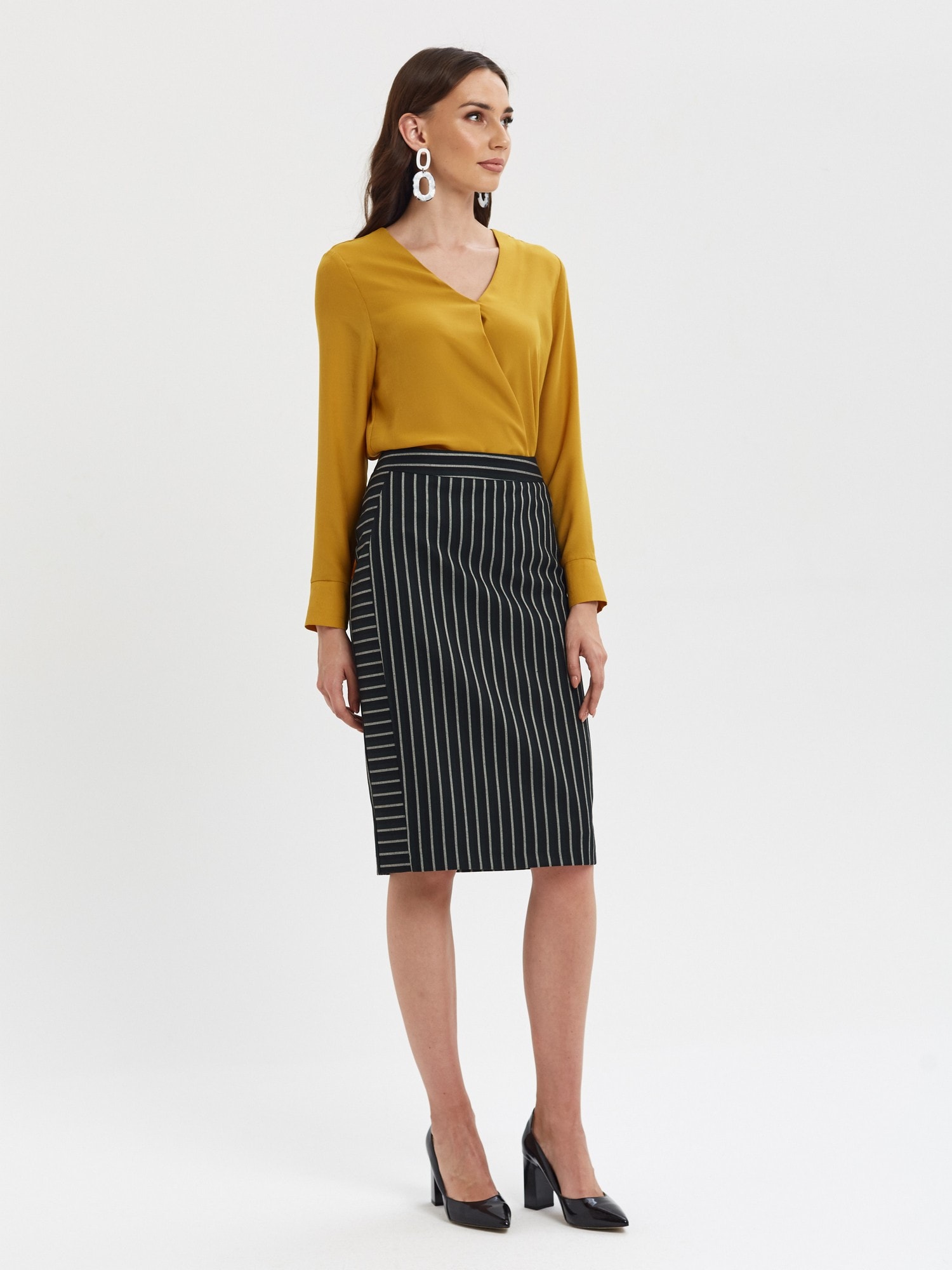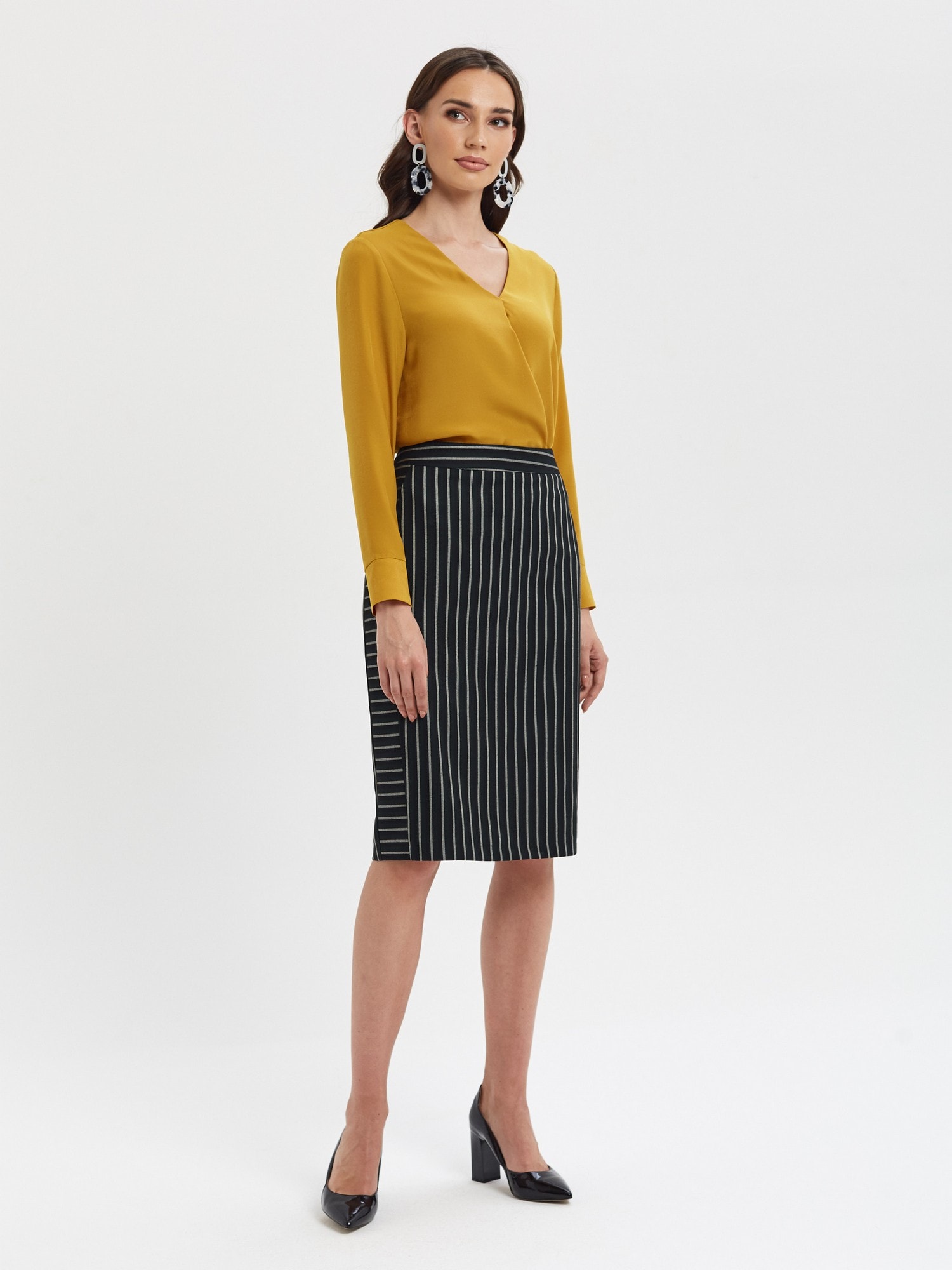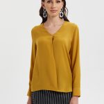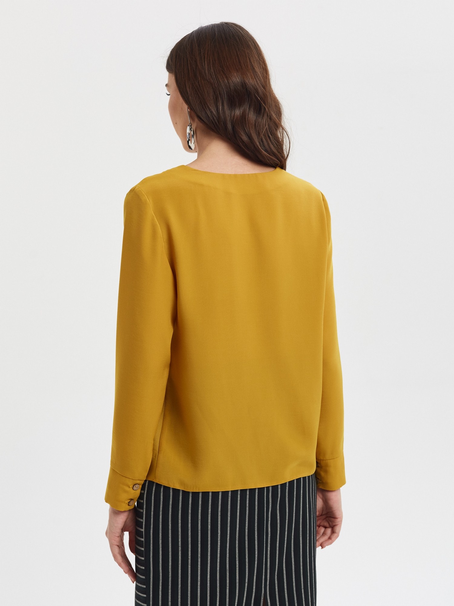 Полиэстер 70%, вискоза 30% Размеры 42-50 Рост модели 178 см Блуза актуального этой осенью цвета острой горчицы. Модель прямого кроя с V-образным вырезом горловины, длинными рукавами, складкой спереди. Образ возможно дополнить юбкой А-902 СТЮ(О9) и жилетом В-87 СТЮ(О9)