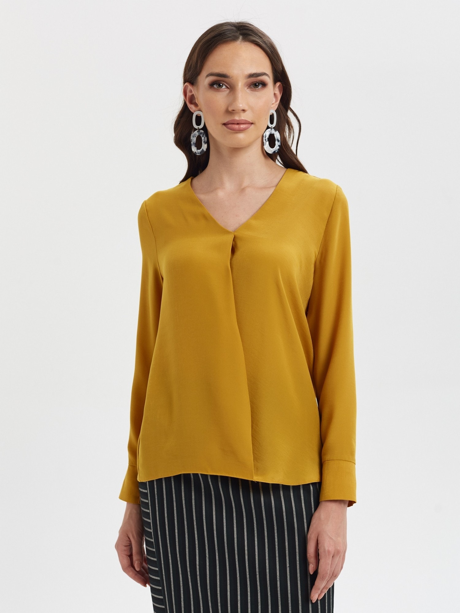 Полиэстер 70%, вискоза 30% Размеры 42-50 Рост модели 178 см Блуза актуального этой осенью цвета острой горчицы. Модель прямого кроя с V-образным вырезом горловины, длинными рукавами, складкой спереди. Образ возможно дополнить юбкой А-902 СТЮ(О9) и жилетом В-87 СТЮ(О9)