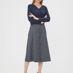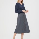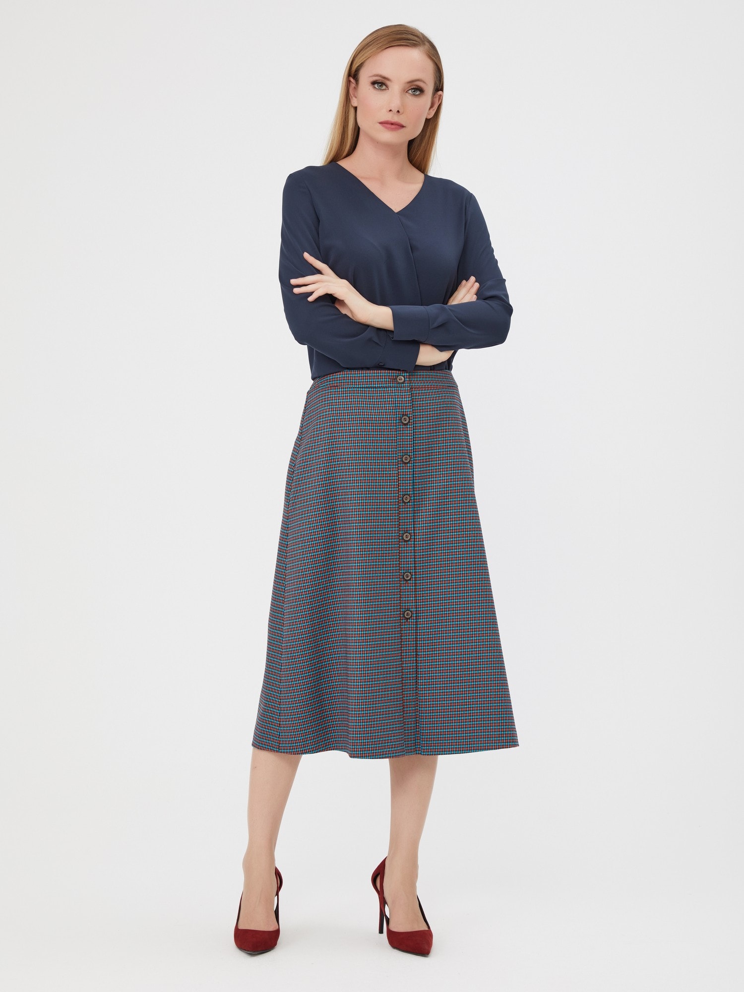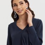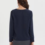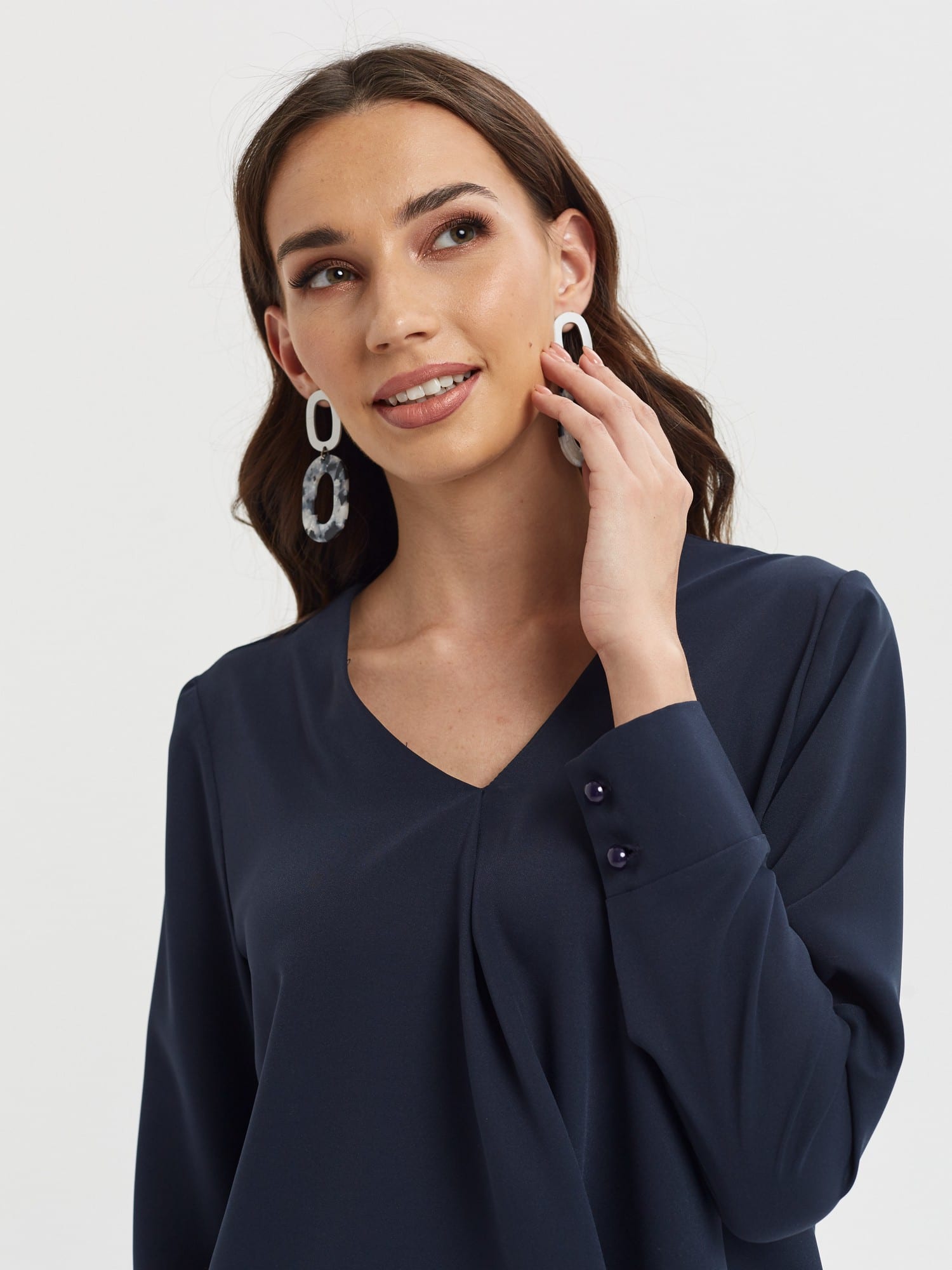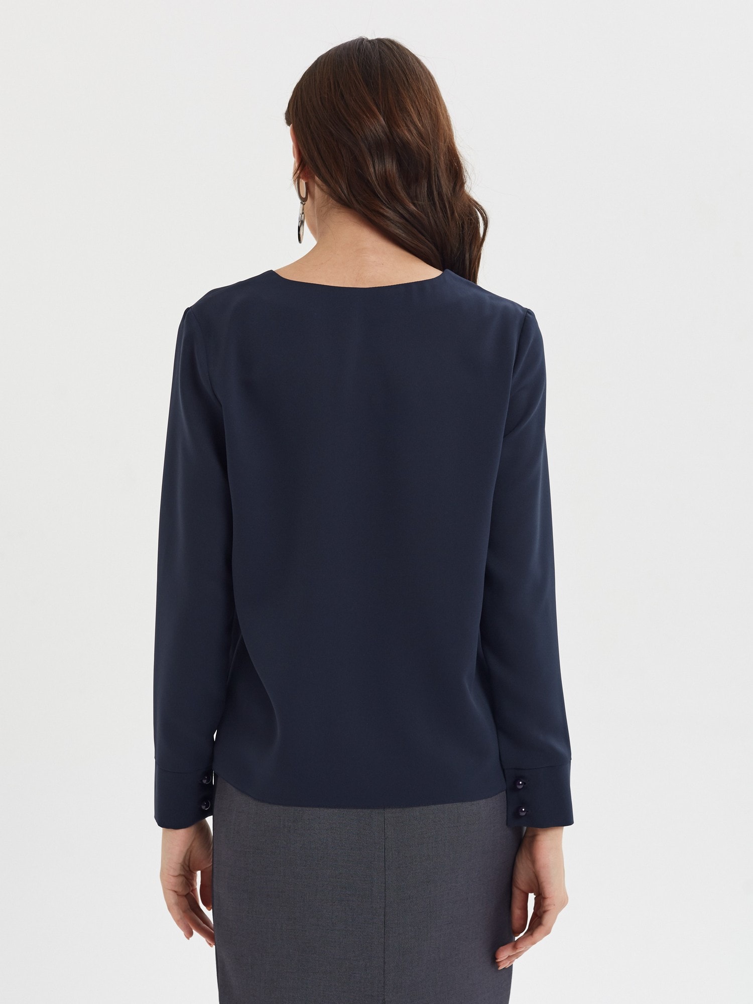 Классическая блузка глубокого сине-черного цвета. Манжет оформлен двумя перламутровыми пуговицами. V-образный вырез и ассиметричный защип в движении создают красивый и элегантный силуэт.