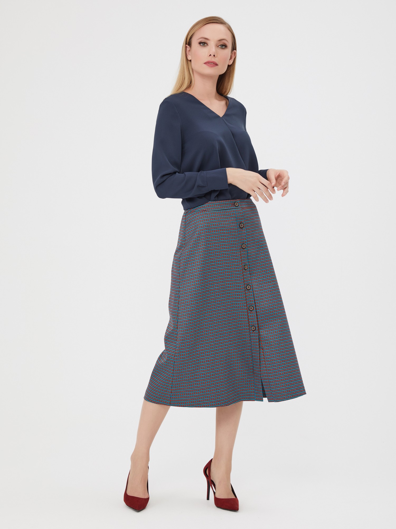 Классическая блузка глубокого сине-черного цвета. Манжет оформлен двумя перламутровыми пуговицами. V-образный вырез и ассиметричный защип в движении создают красивый и элегантный силуэт.