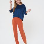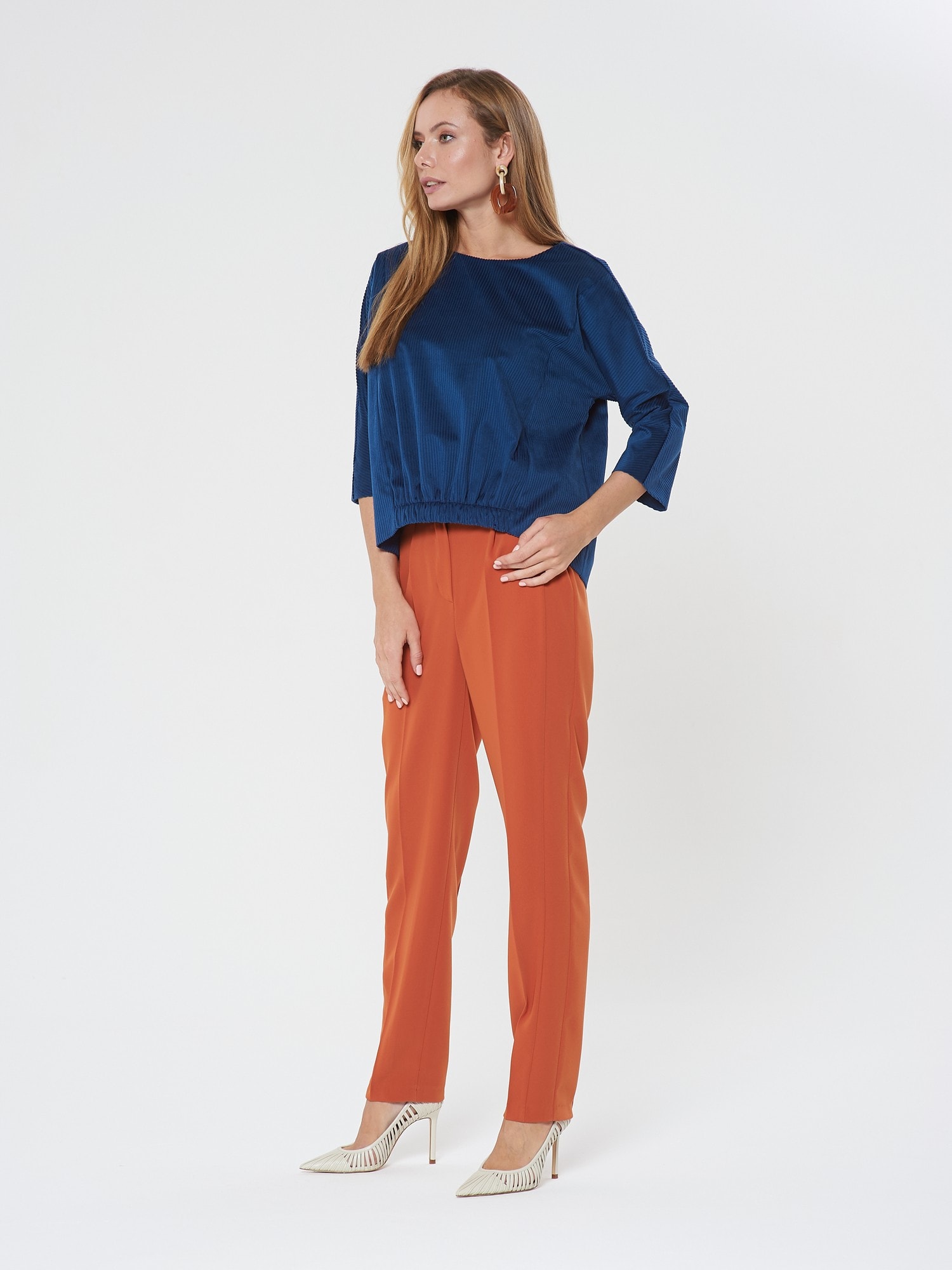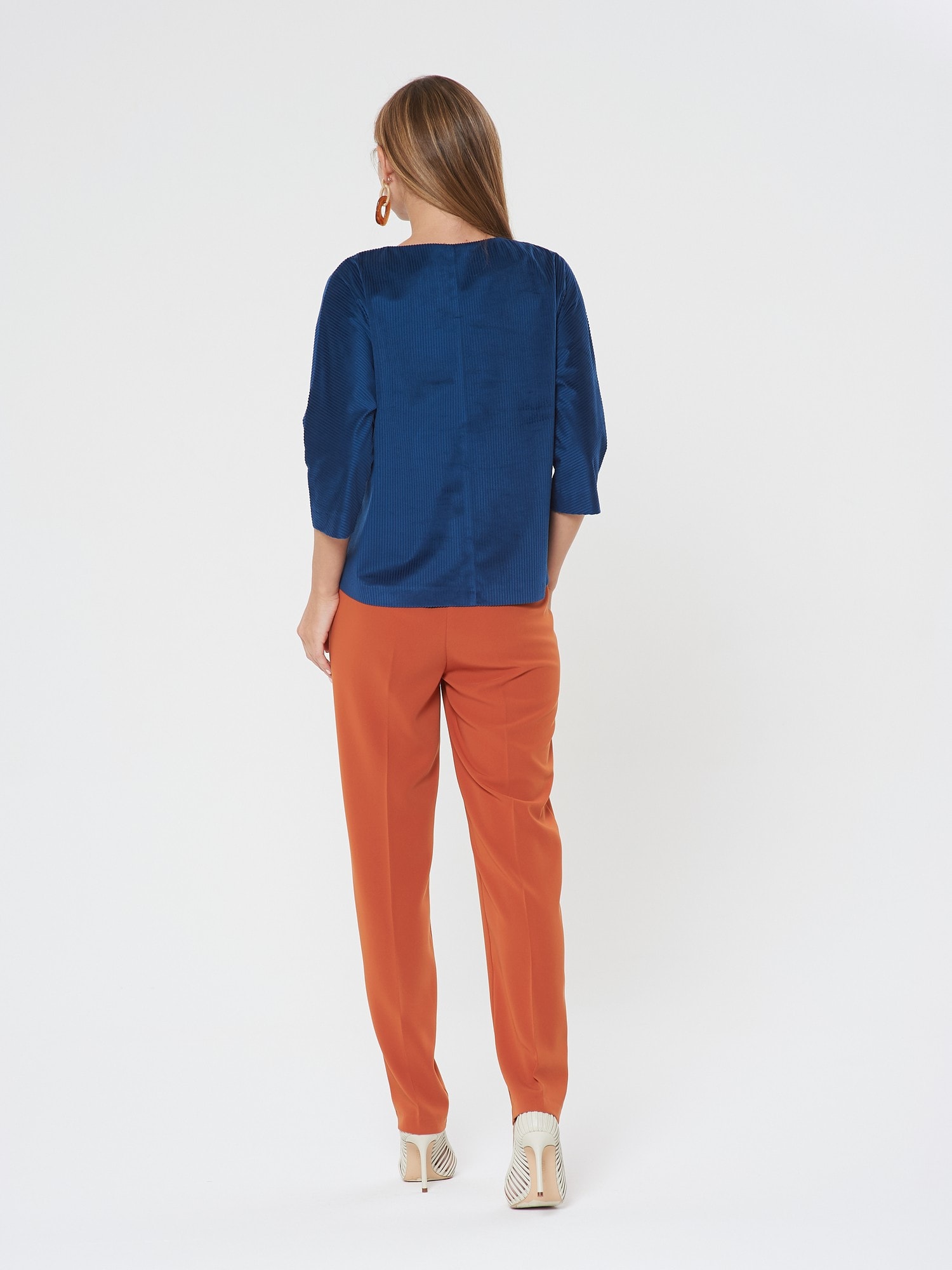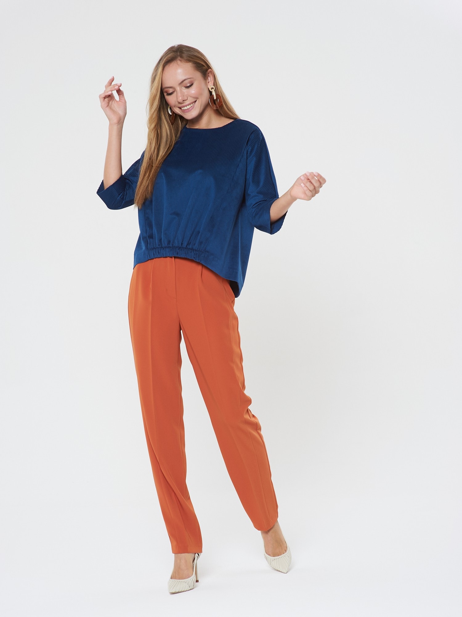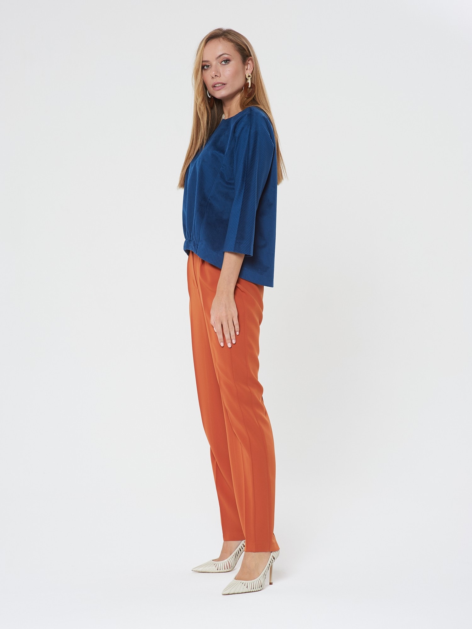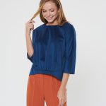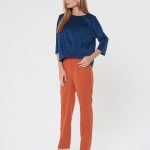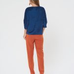 Уютная блузка из синего вельвета. Рукава реглан, спинка с удлиненнием. Низ полочки оформлен эелементом с широкой резинкой. Дополните образ брюками Б-805 КР(В20)