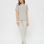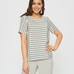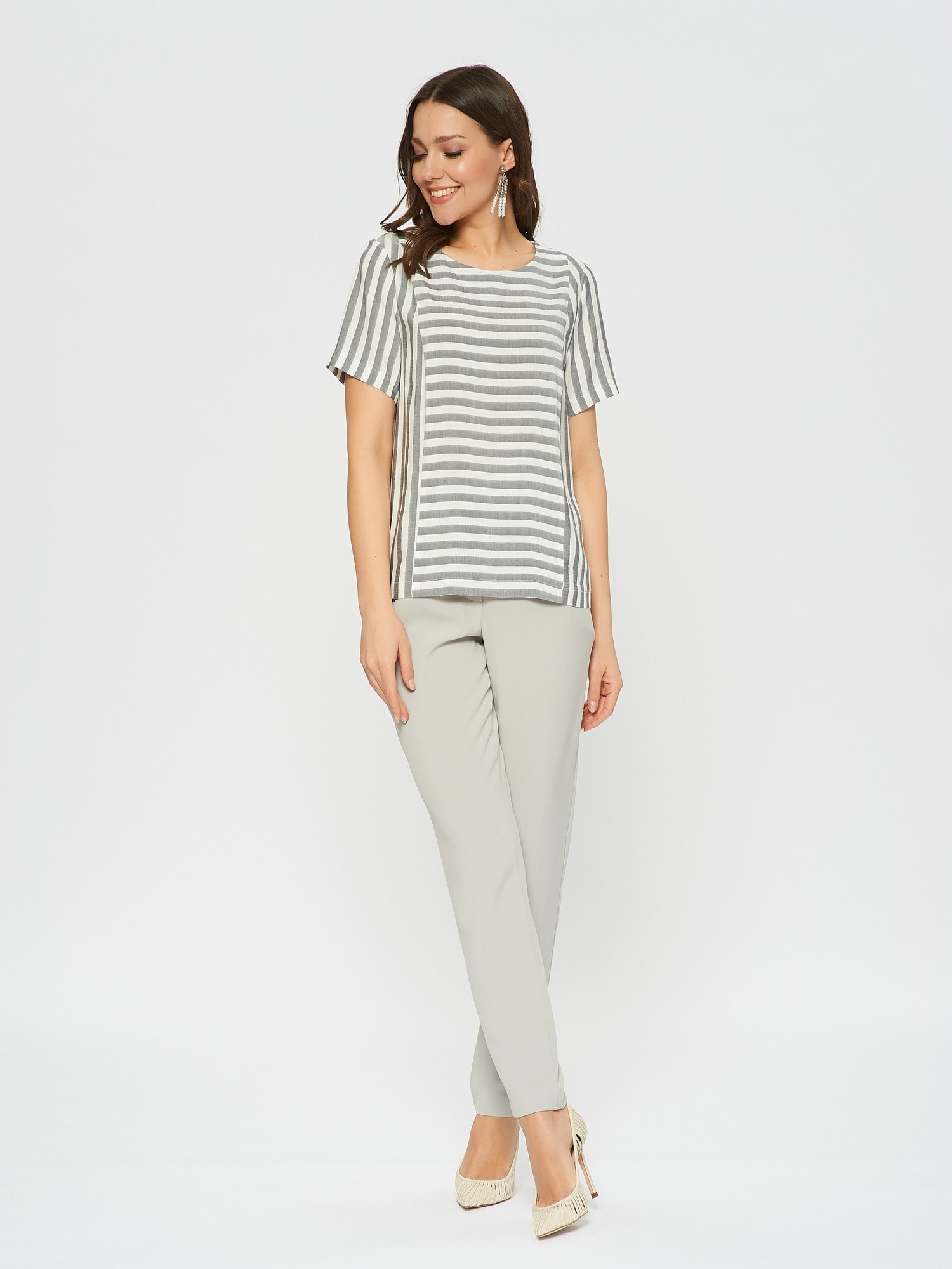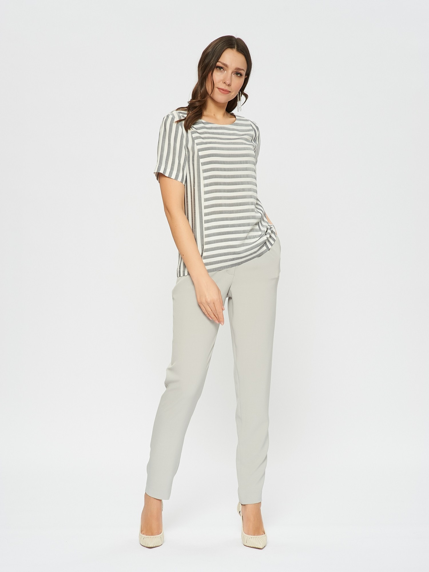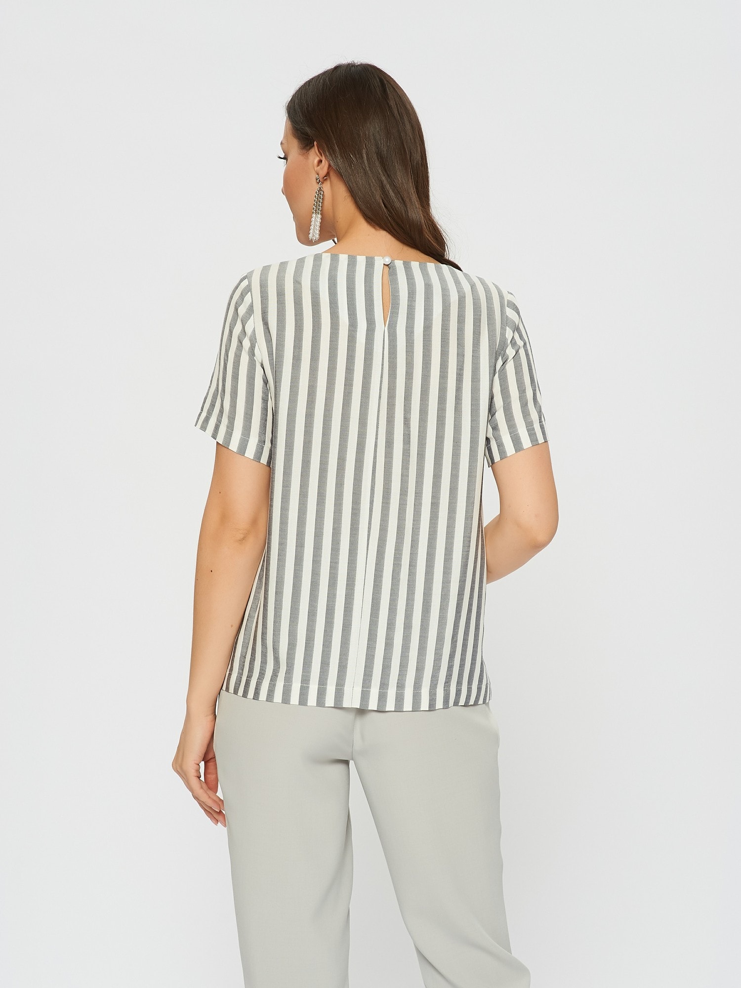 Блузка в стиле морского круиза из полосатой ткани. Сочетает в себе детали с разным положением полоски. Застежка на пуговицу на спинке. Дополните брюками Б-01 МШ(В20).
