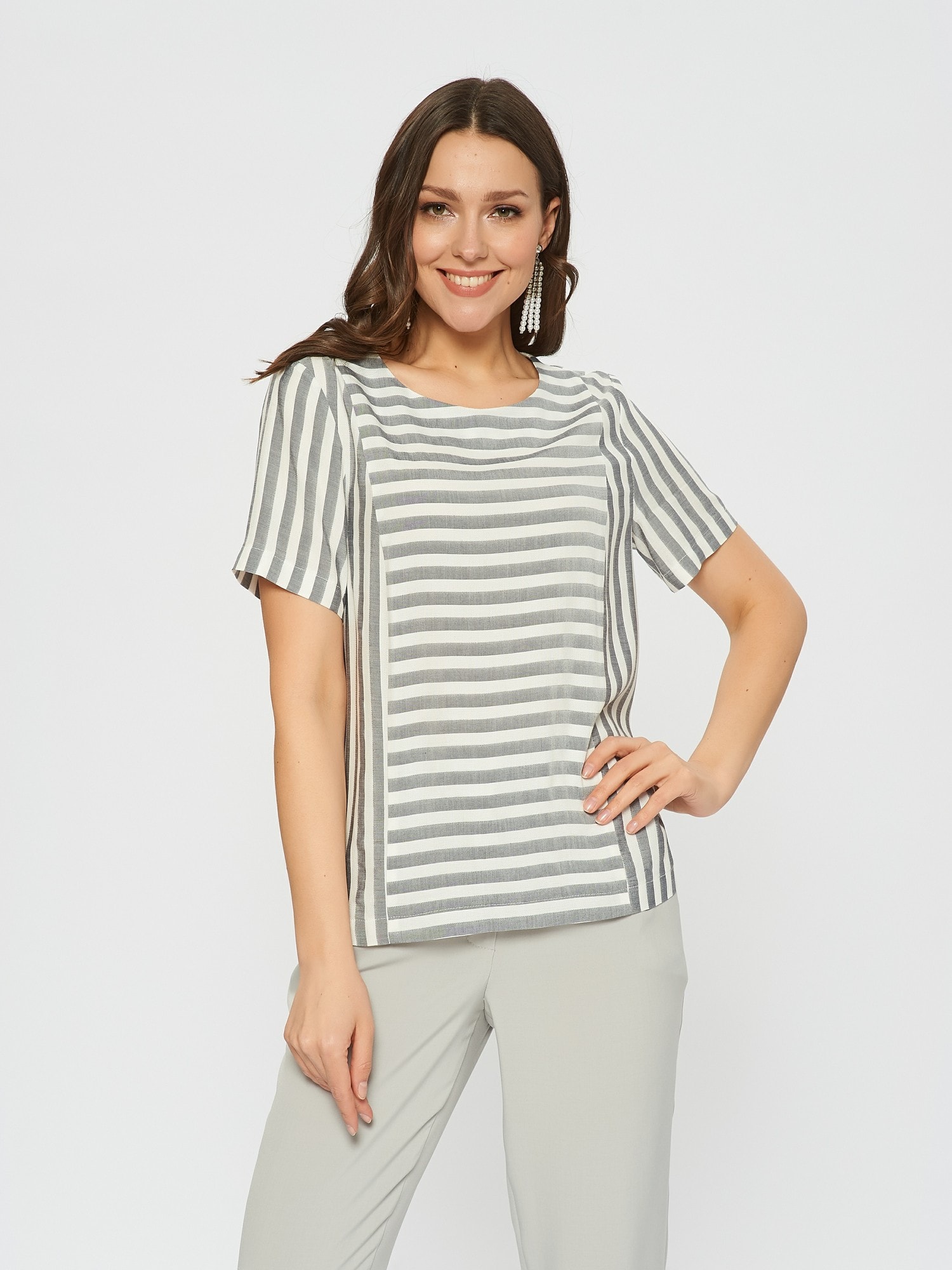 Блузка в стиле морского круиза из полосатой ткани. Сочетает в себе детали с разным положением полоски. Застежка на пуговицу на спинке. Дополните брюками Б-01 МШ(В20).