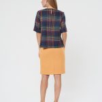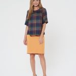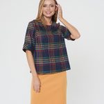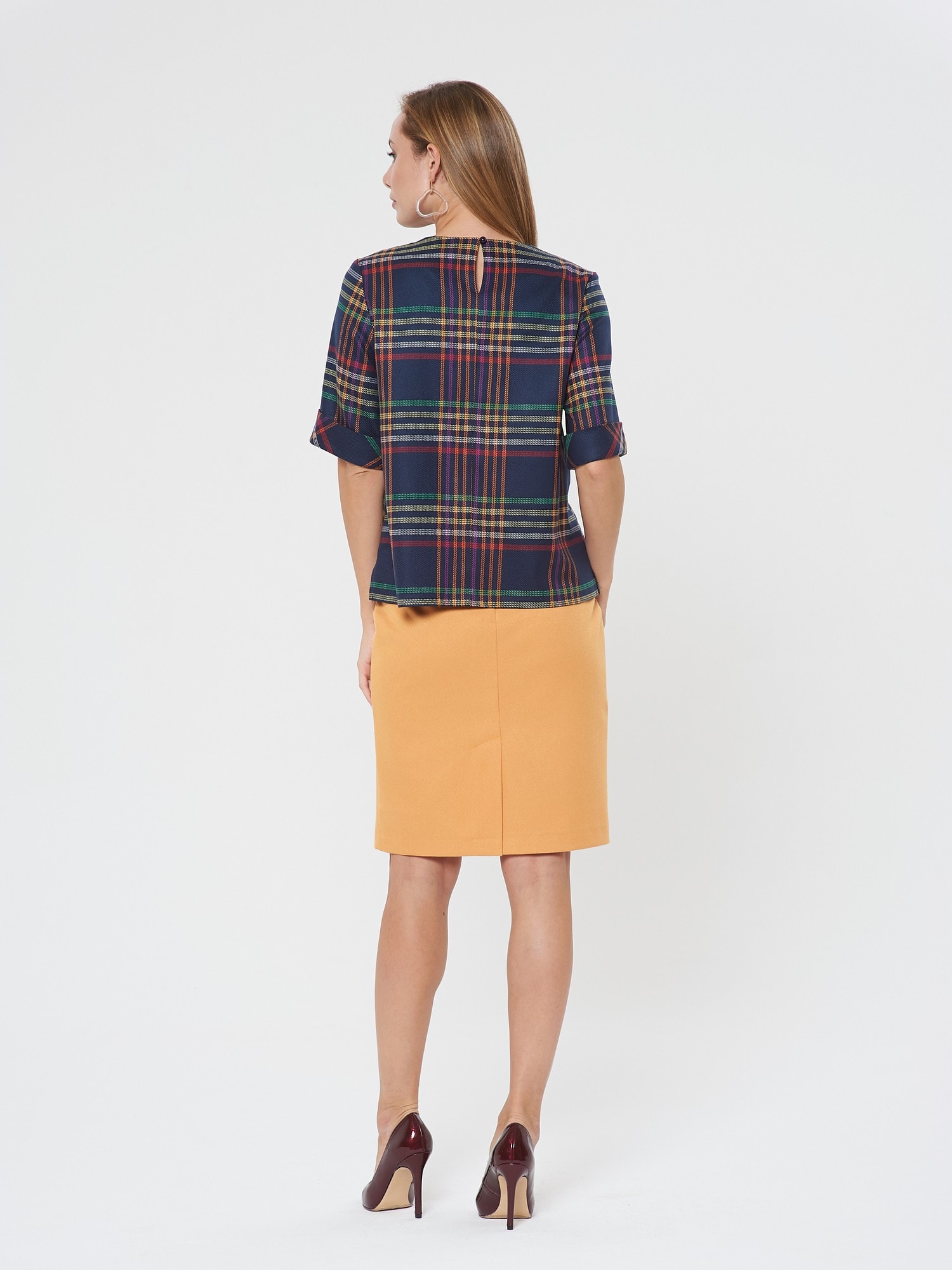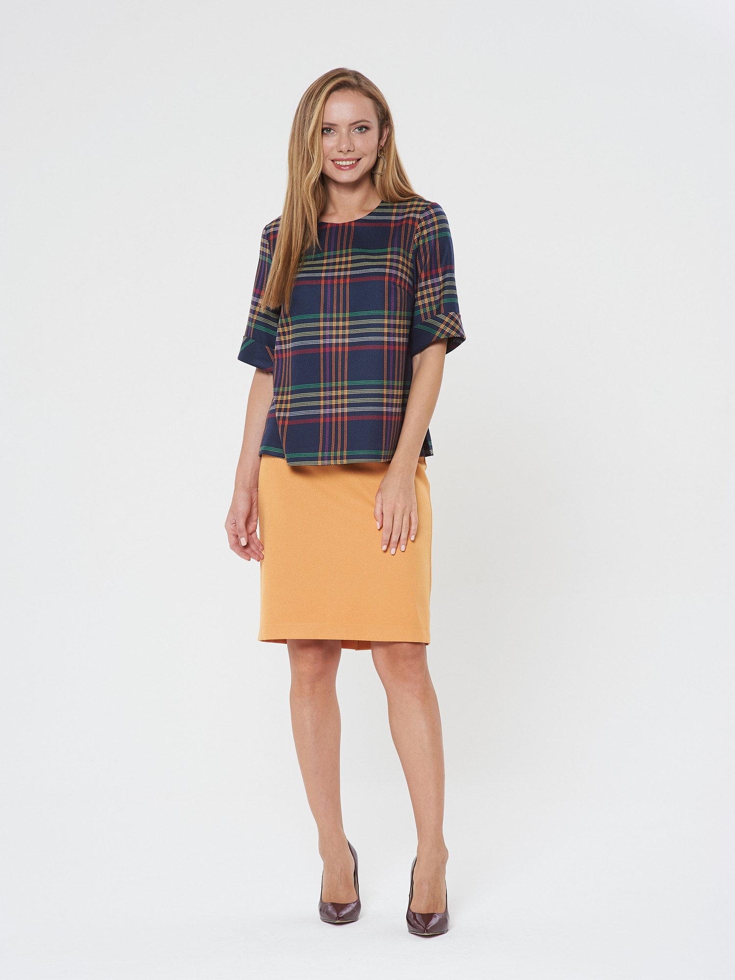 Блузка с коротким рукавом. Выполнена из ткани с разноцветной клеткой, благодаря которой она сочетается с разнообразными юбками и брюками. Рукава с отворотами, небольшие разрезы по бокам. Застежка на петельку с пуговицей на спинке. Дополните образ юбкой А-900 БР2(О9)
