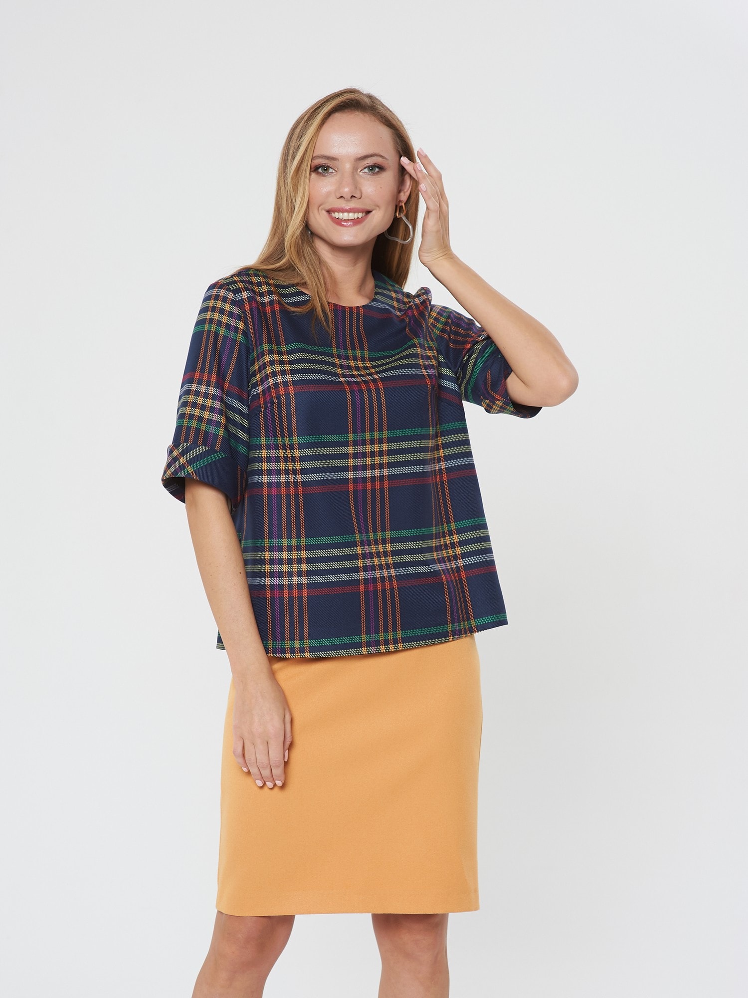 Блузка с коротким рукавом. Выполнена из ткани с разноцветной клеткой, благодаря которой она сочетается с разнообразными юбками и брюками. Рукава с отворотами, небольшие разрезы по бокам. Застежка на петельку с пуговицей на спинке. Дополните образ юбкой А-900 БР2(О9)