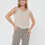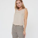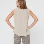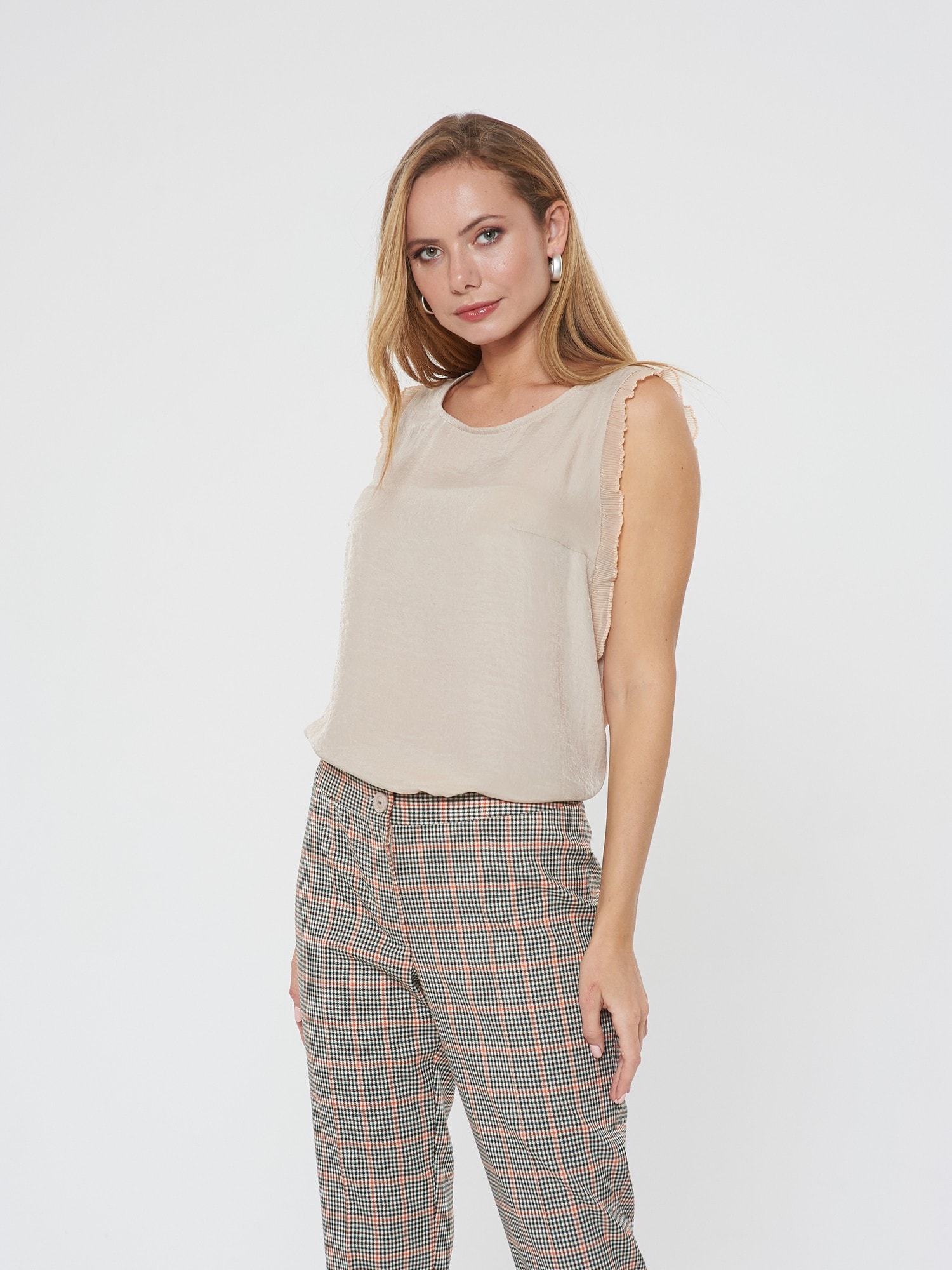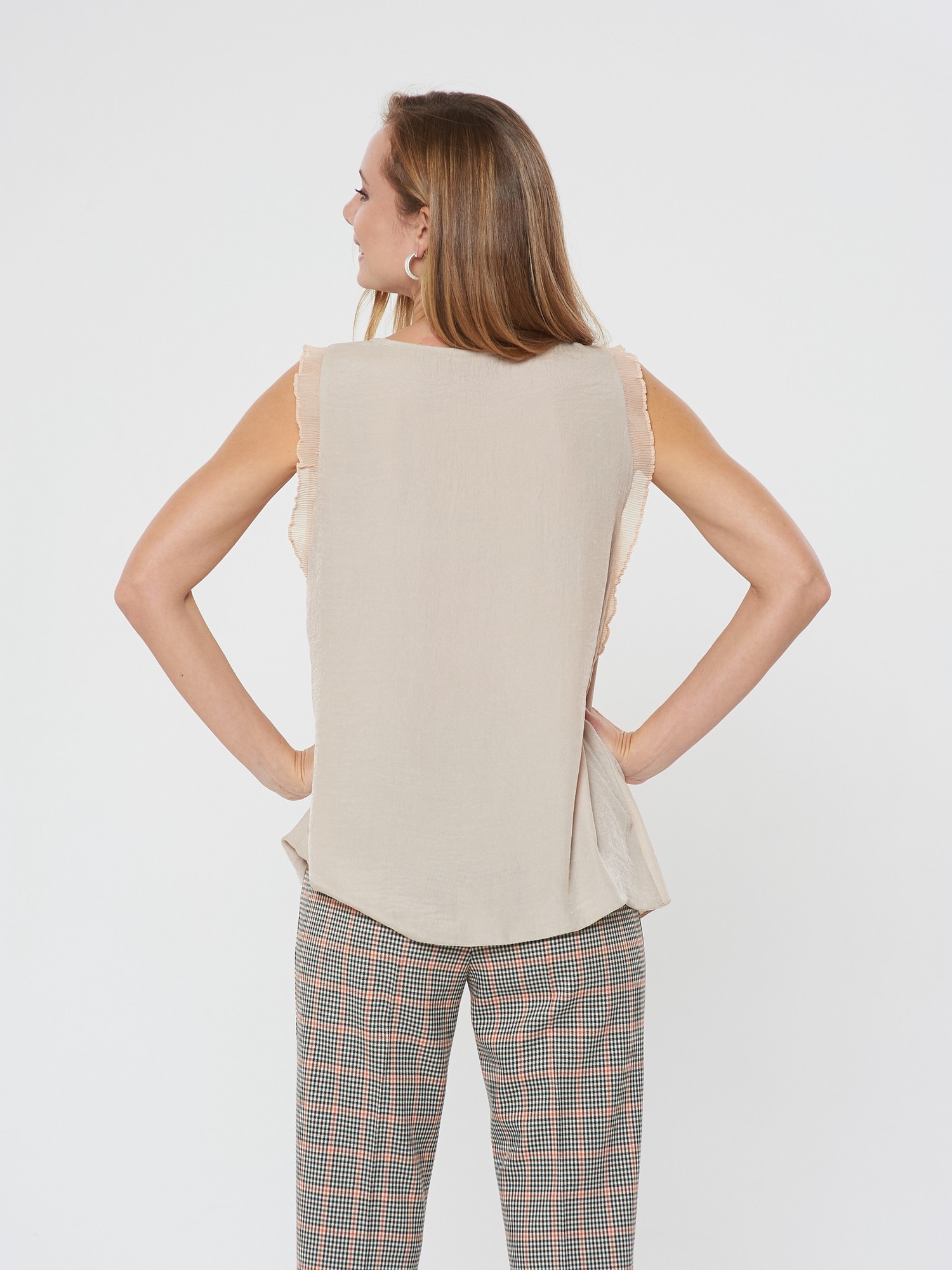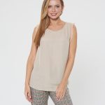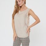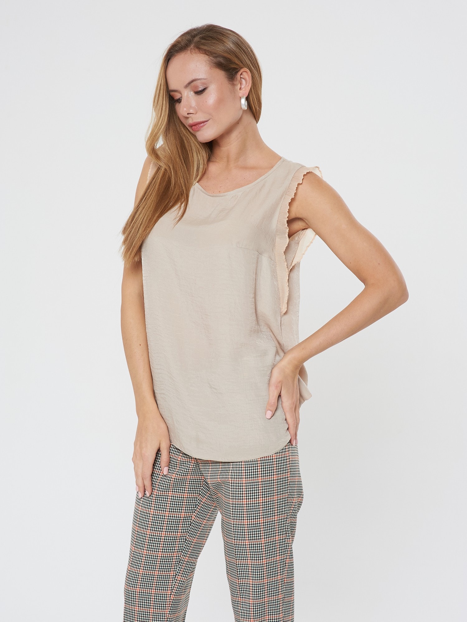 Блузка без рукавов пыльно-розового цвета с воздушной тесьмой по краю проймы. Такая блузка может легко стать основой различных образов. Сочетайте с брюками Б-117 ГЧ(В20)