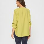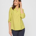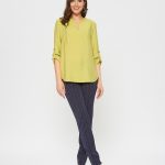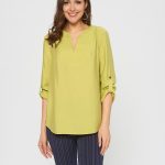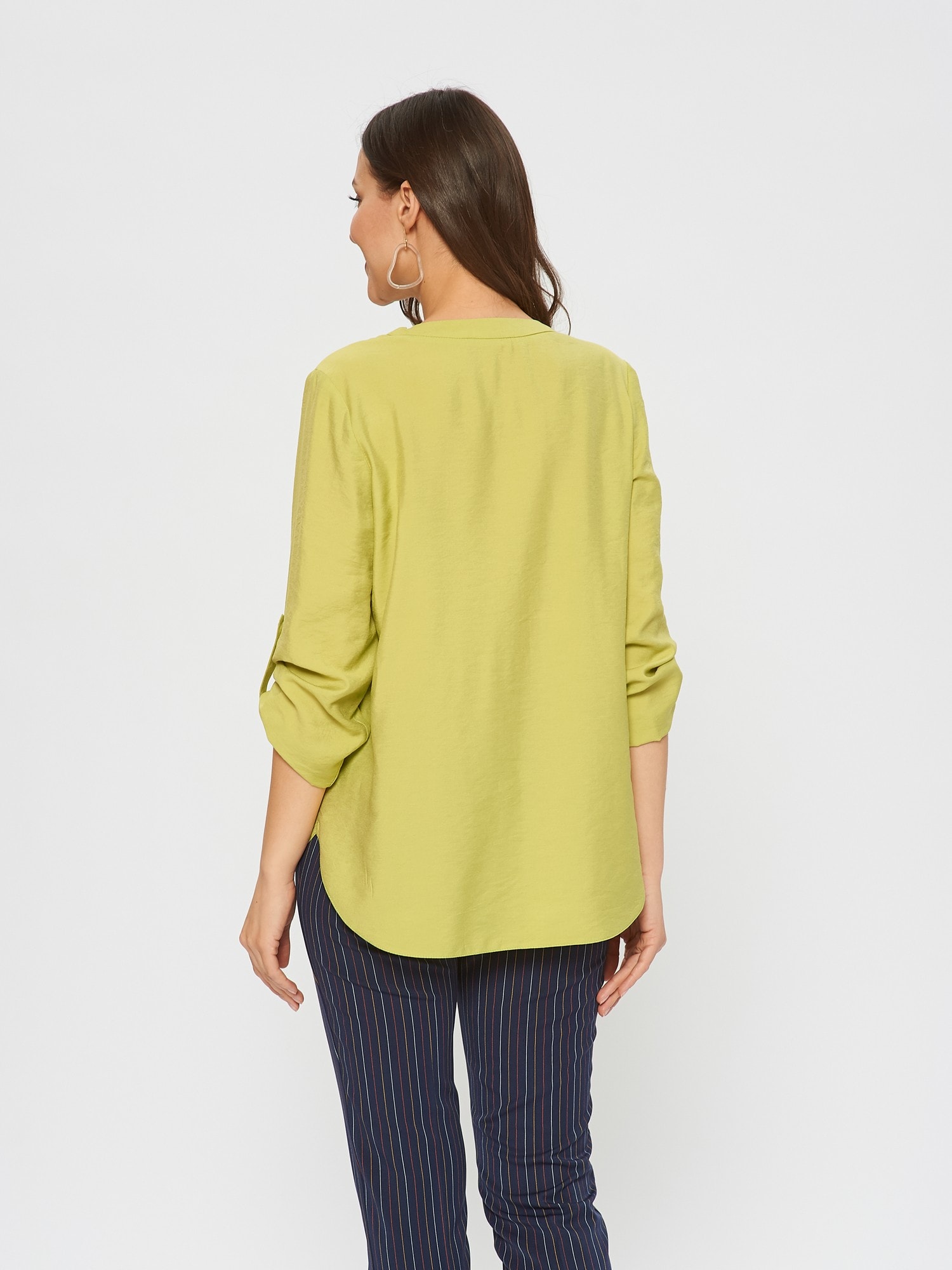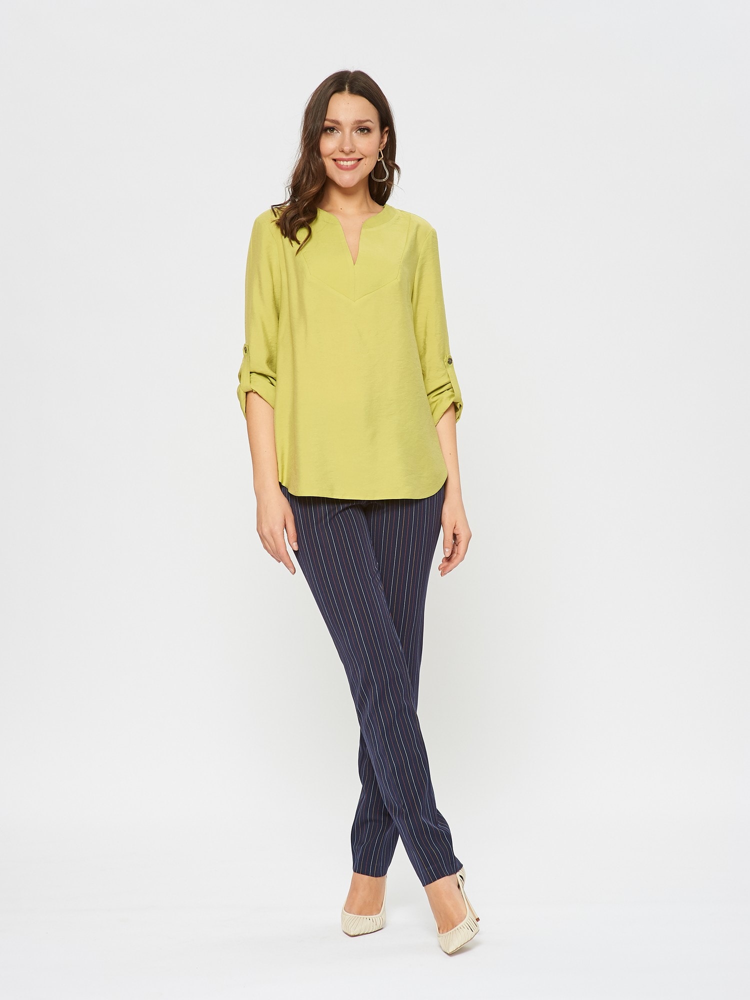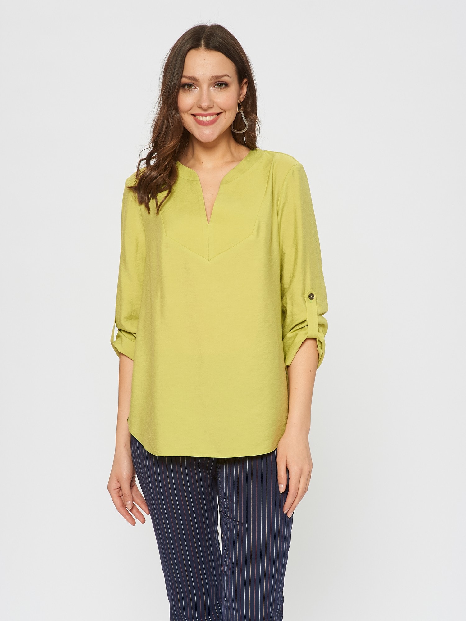 Блузка с длинным рукавом и хлястиком для подворотов. Горловина с фигурным вырезом. Выполнена из яркой ткани цвета спелого лайма. Дополните образ брюками Б-117 РАД(В20) и жилетом В-86 РАД(В20)