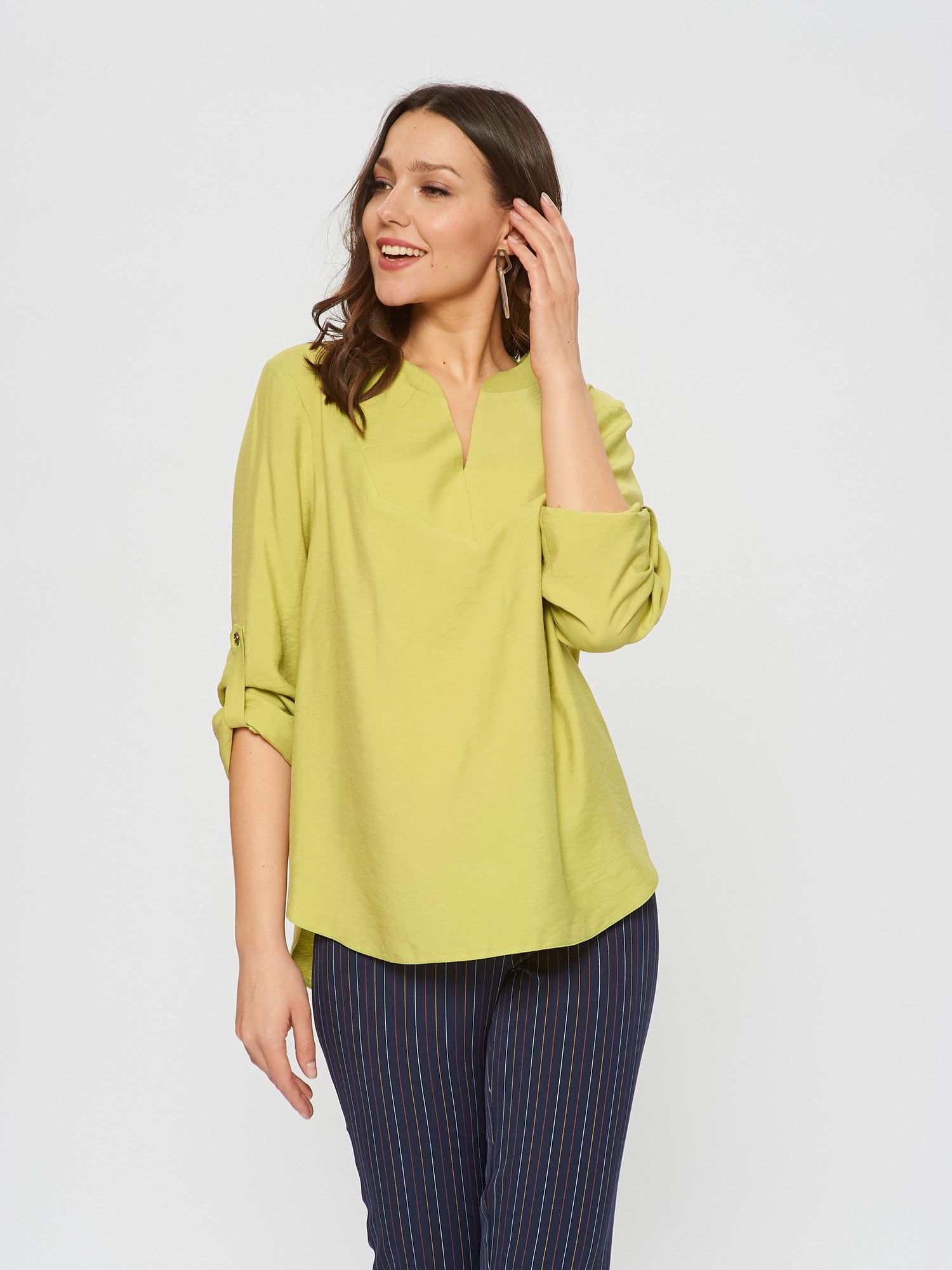 Блузка с длинным рукавом и хлястиком для подворотов. Горловина с фигурным вырезом. Выполнена из яркой ткани цвета спелого лайма. Дополните образ брюками Б-117 РАД(В20) и жилетом В-86 РАД(В20)