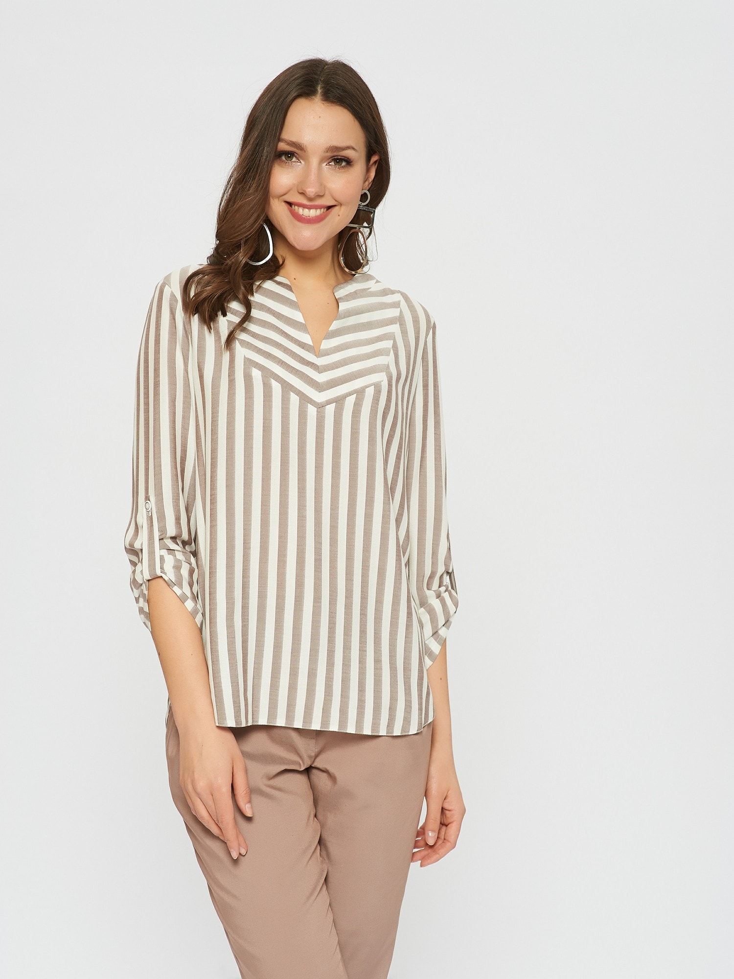 Блузка-хит сезона. Блузка с морским настроением благодаря цветовой гамме и принту "полоска". Особым элементом является разное направление полоски, хлястики для подвязывания рукавов и разрез на декольте. Дополните комплект брюками Б-01 МИК2(В20)
