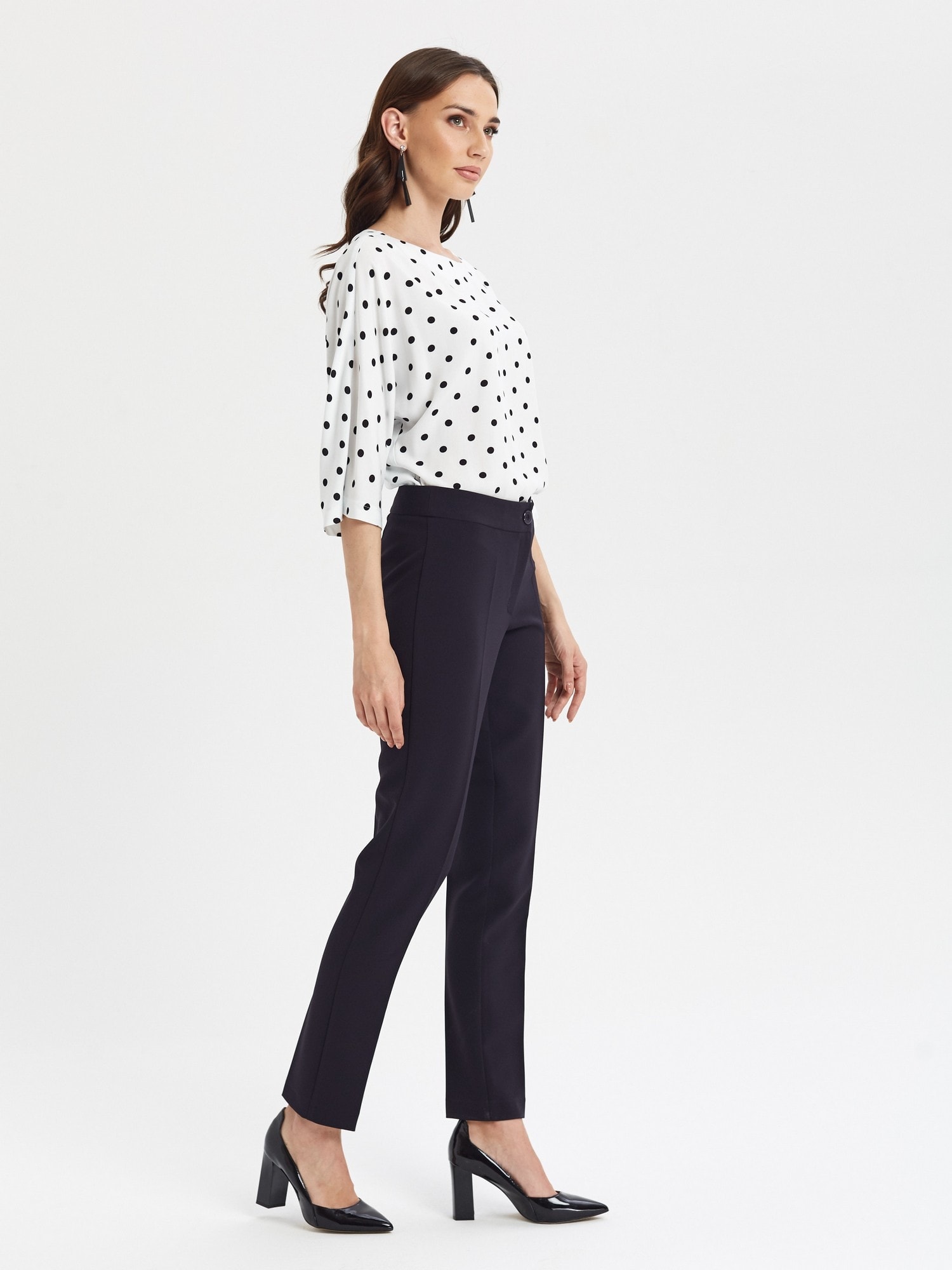 48% вискоза, 48% полиэстер, 4% эластан Размеры 42-52 Рост модели 178 см Элегантные черные брюки средней посадки на кокетке - отличный способ подчеркнуть женственность делового образа. Прямой силуэт брючин, достаточная длина, - подчеркнут традиционность look-a. Классическая рубашка, шпильки, и безупречный рабочий сет готов. Образ на фото дополнен блузкой Д-801 ДР(О9)
