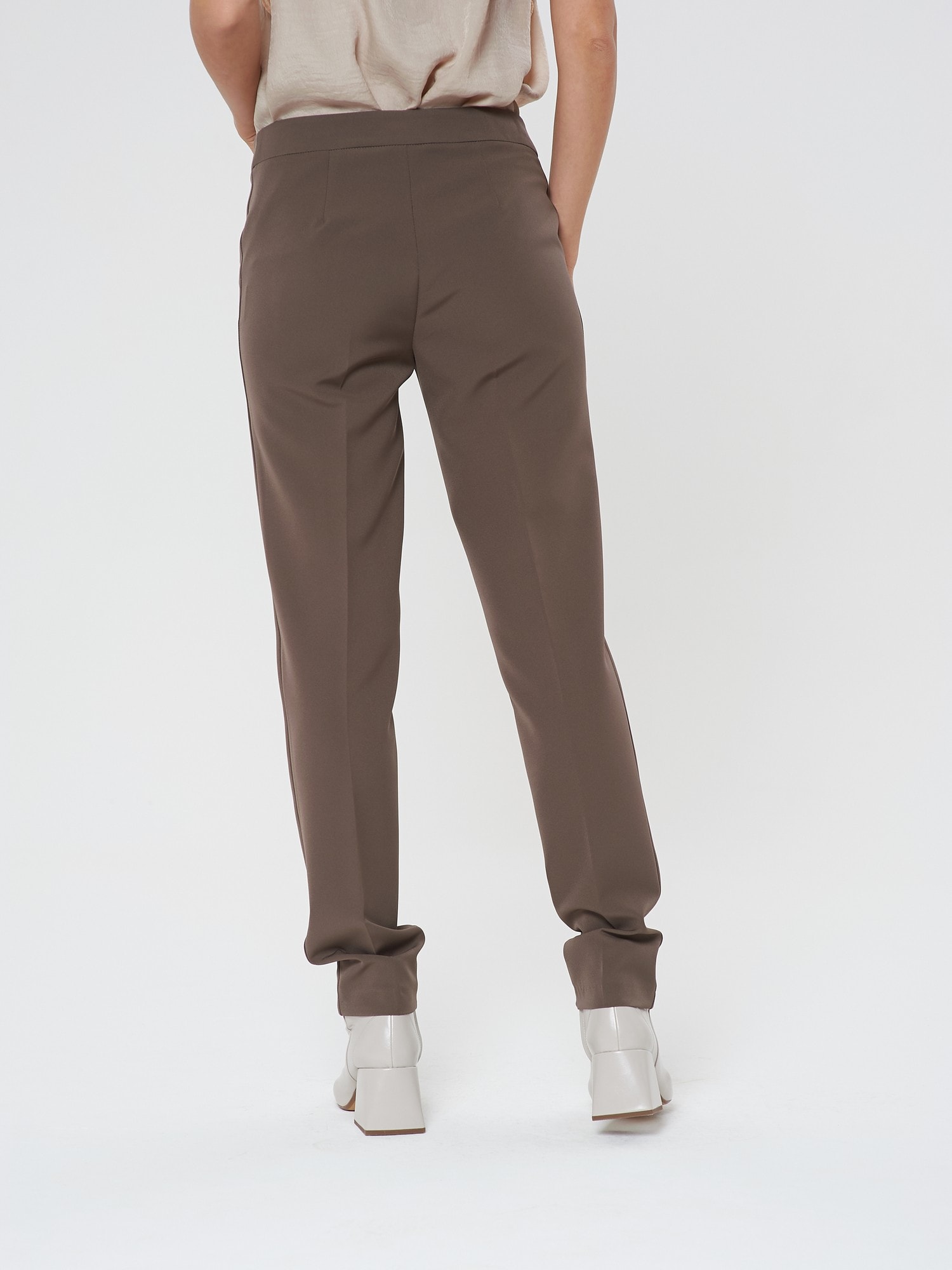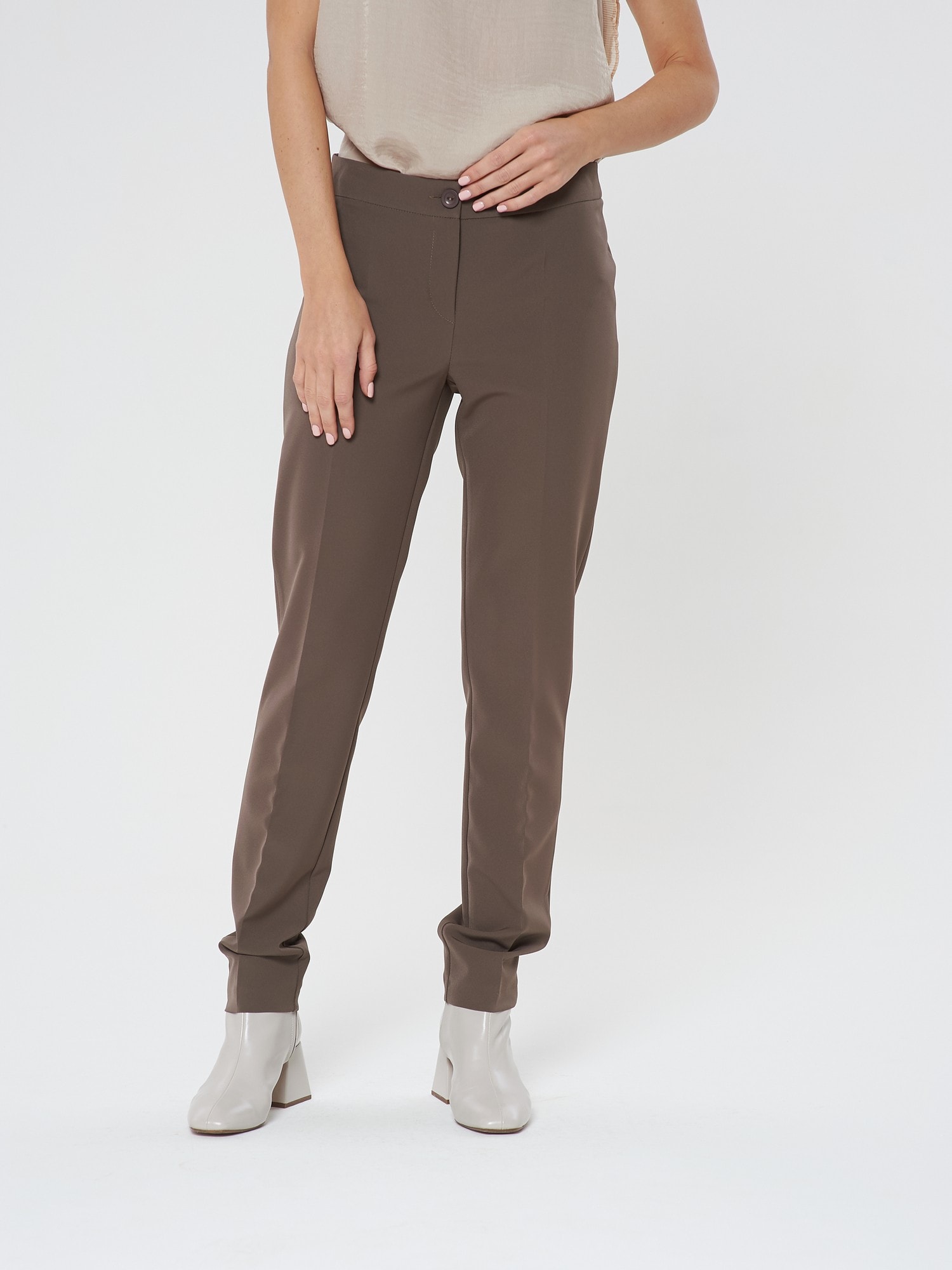Базовые брюки цвета мокко со средней посадкой. Благодаря лаконичному крою они с легкостью могут быть как повседневным, так и праздничным вариантом. Дополните брюки жакетом в тон В-951 МД(В20)