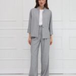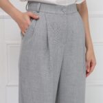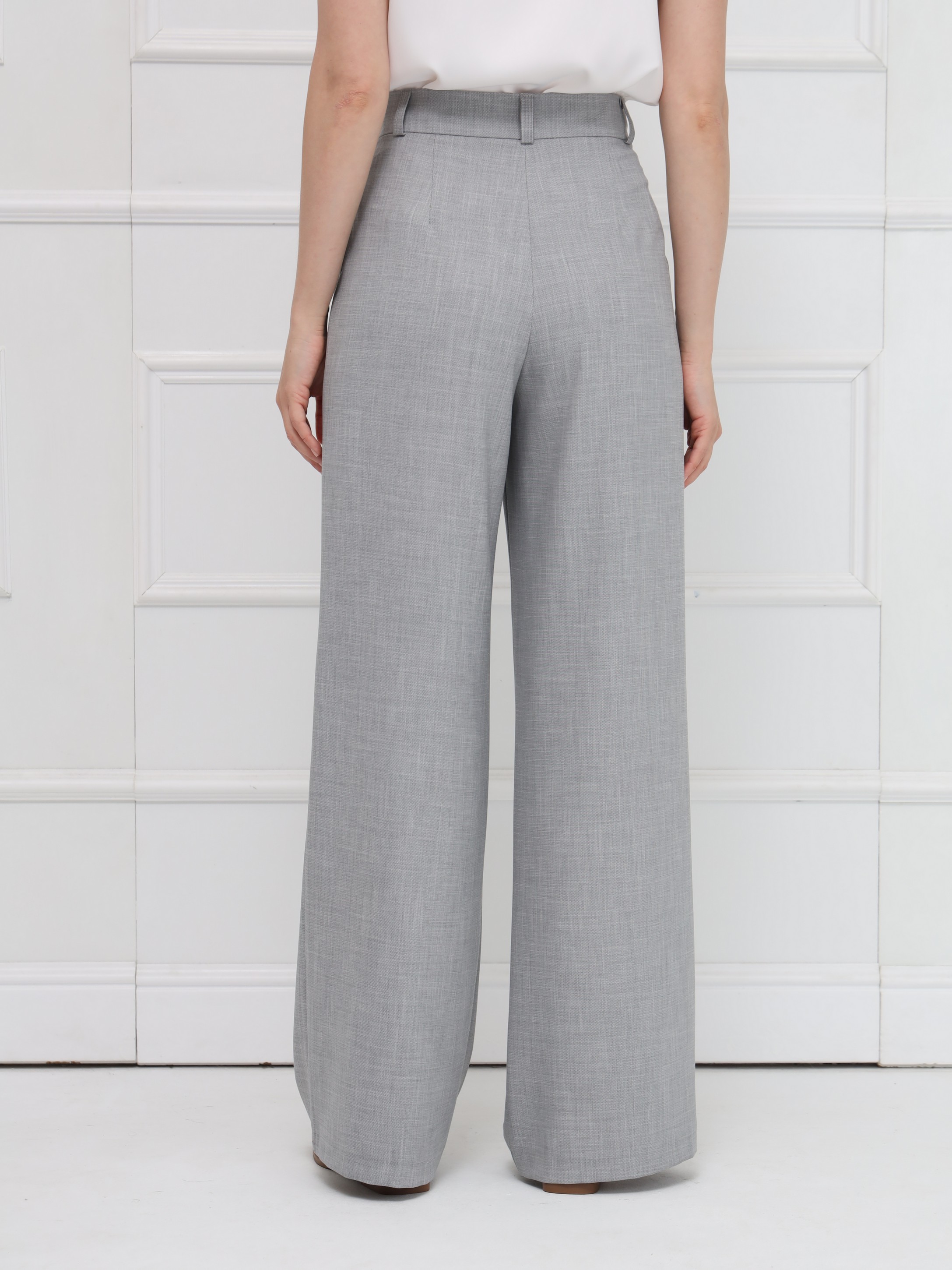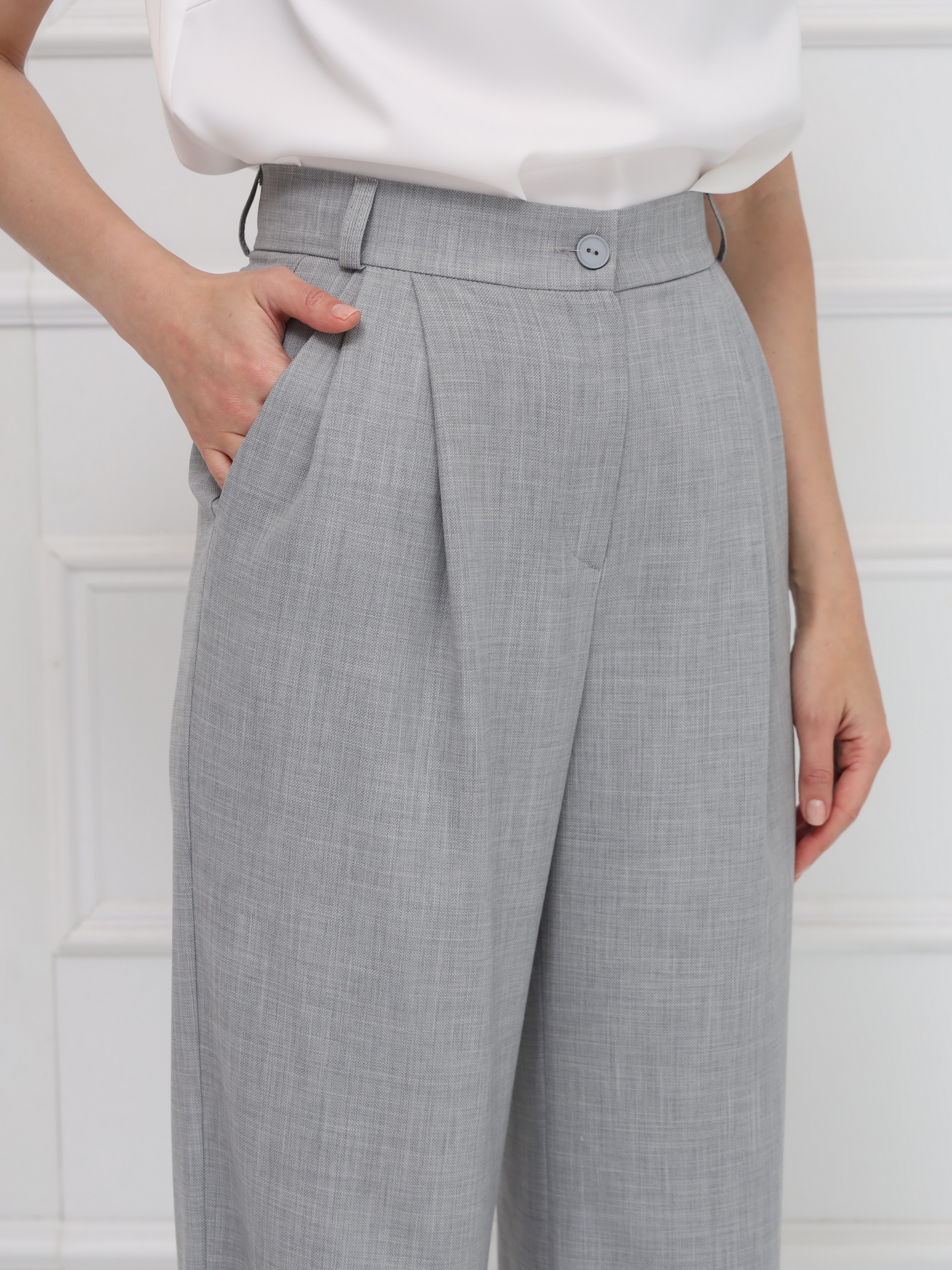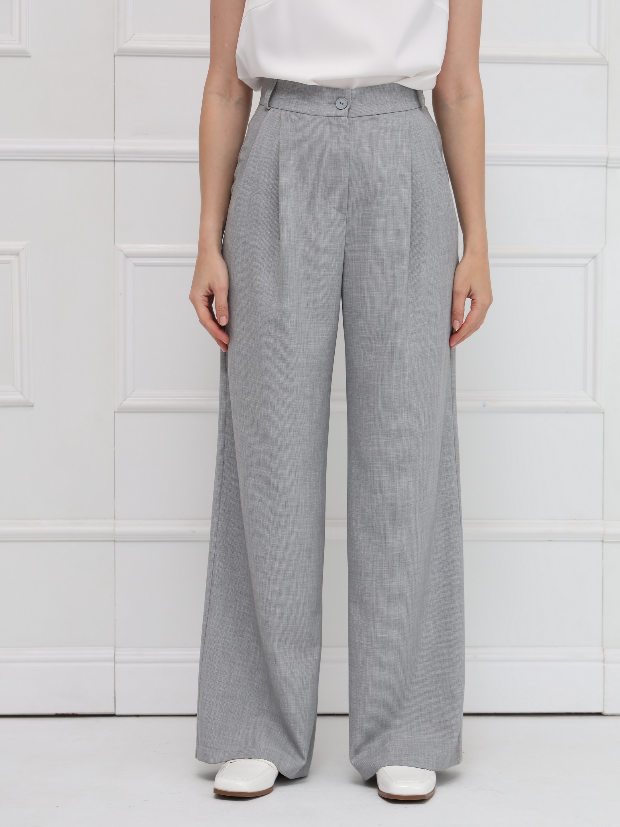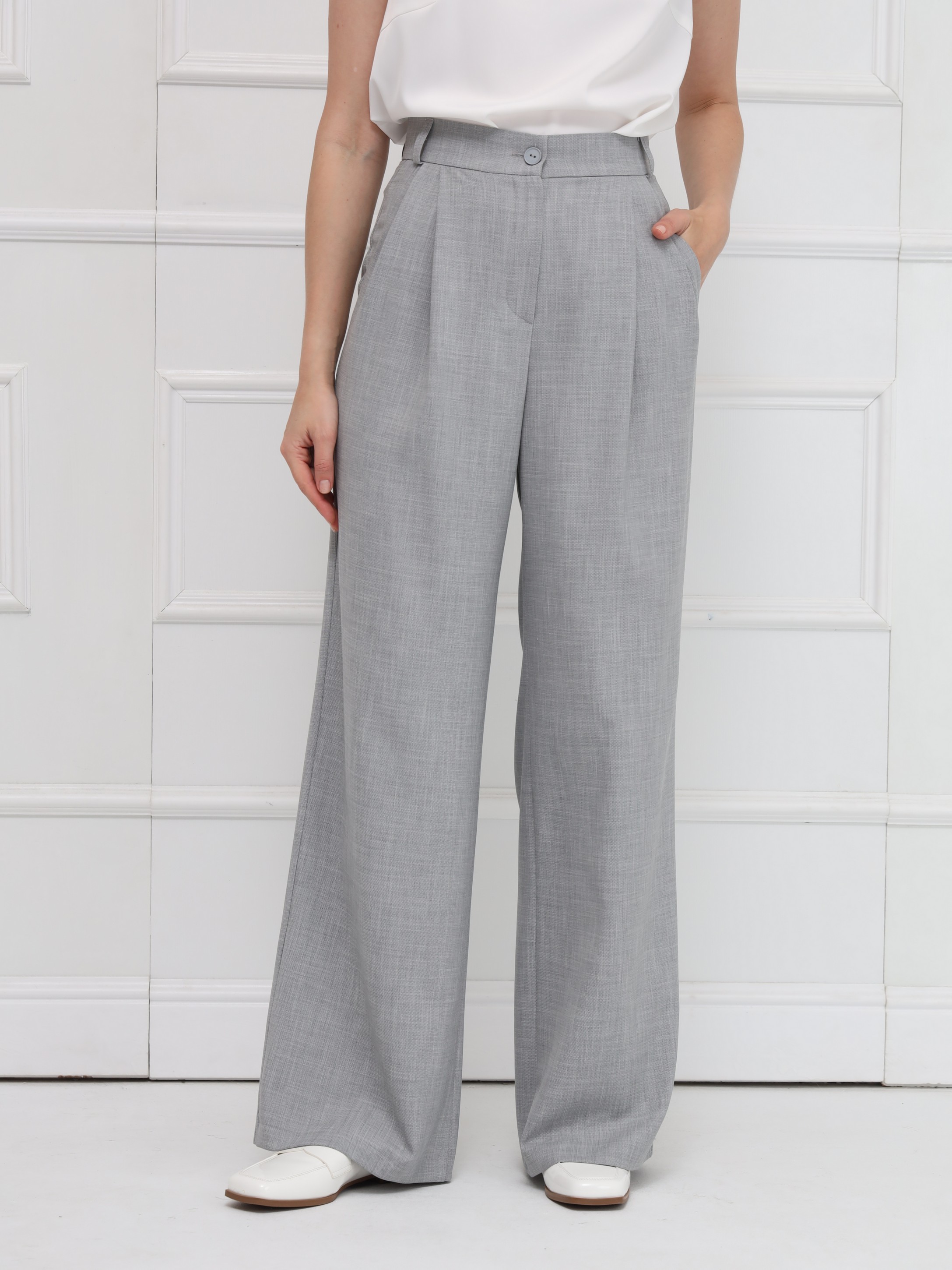 Широкие брюки-палаццо, с высокой посадкой подчёркивают линию талии и создают плавный, женственный силуэт благодаря мягким складкам. Модель выполнена из тонкой костюмной ткани с деликатной льняной фактурой, что добавляет образу утончённой естественности и лёгкости. Брюки имеют длину в пол, аккуратный гульфик, удобные боковые карманы и шлёвки на поясе - идеальная база для современного гардероба. На фото брюки представлены с жакетом В-219 ПБР(В6).