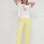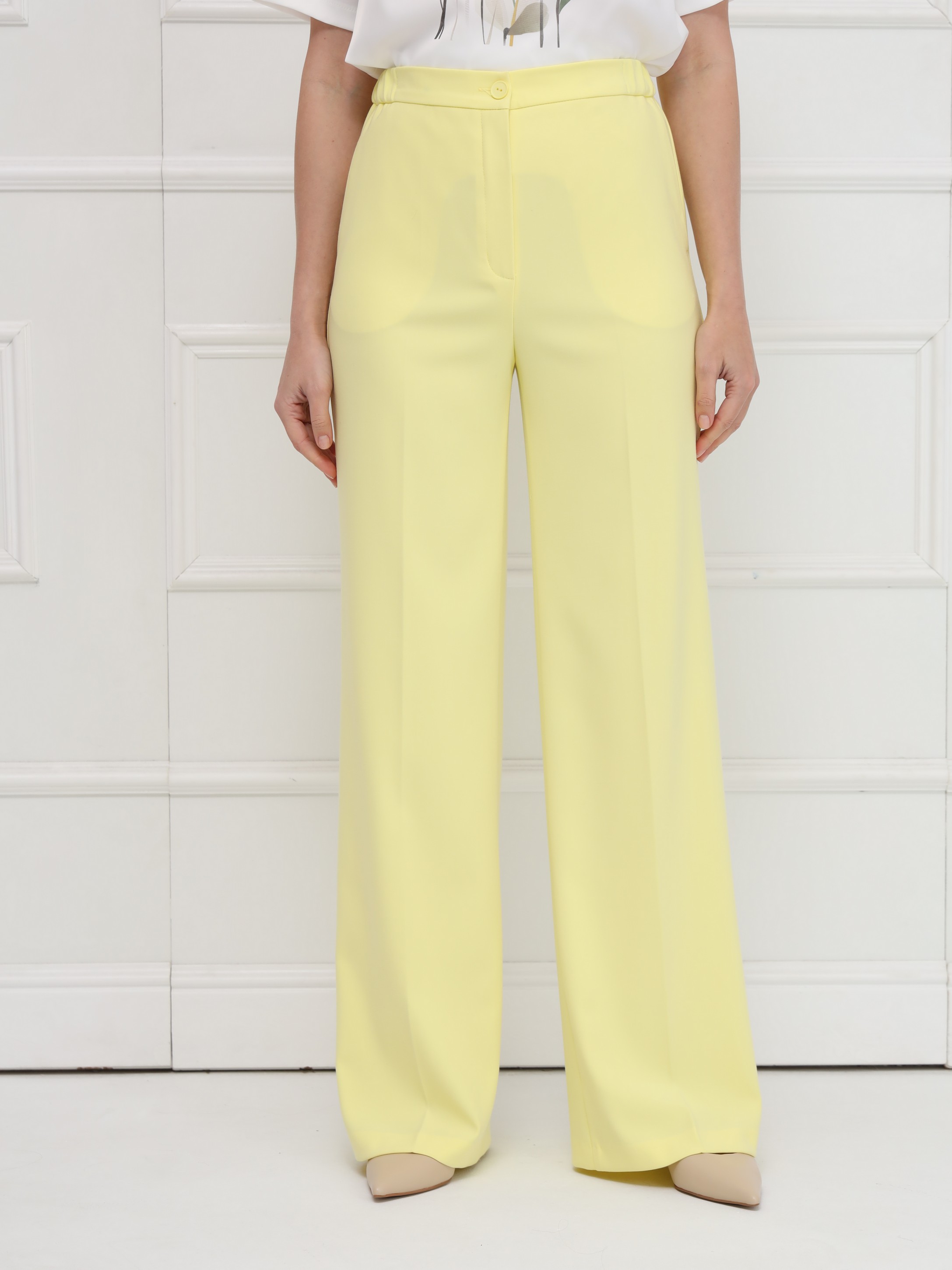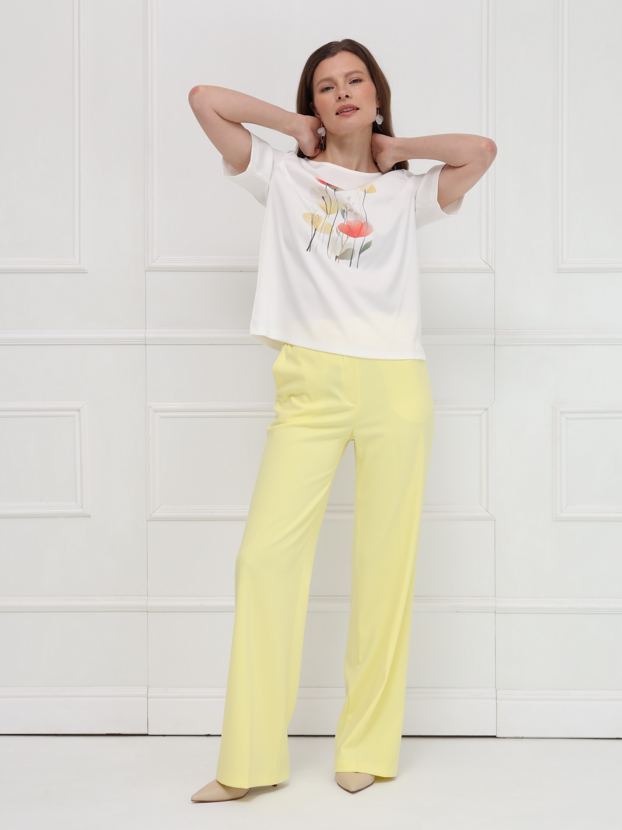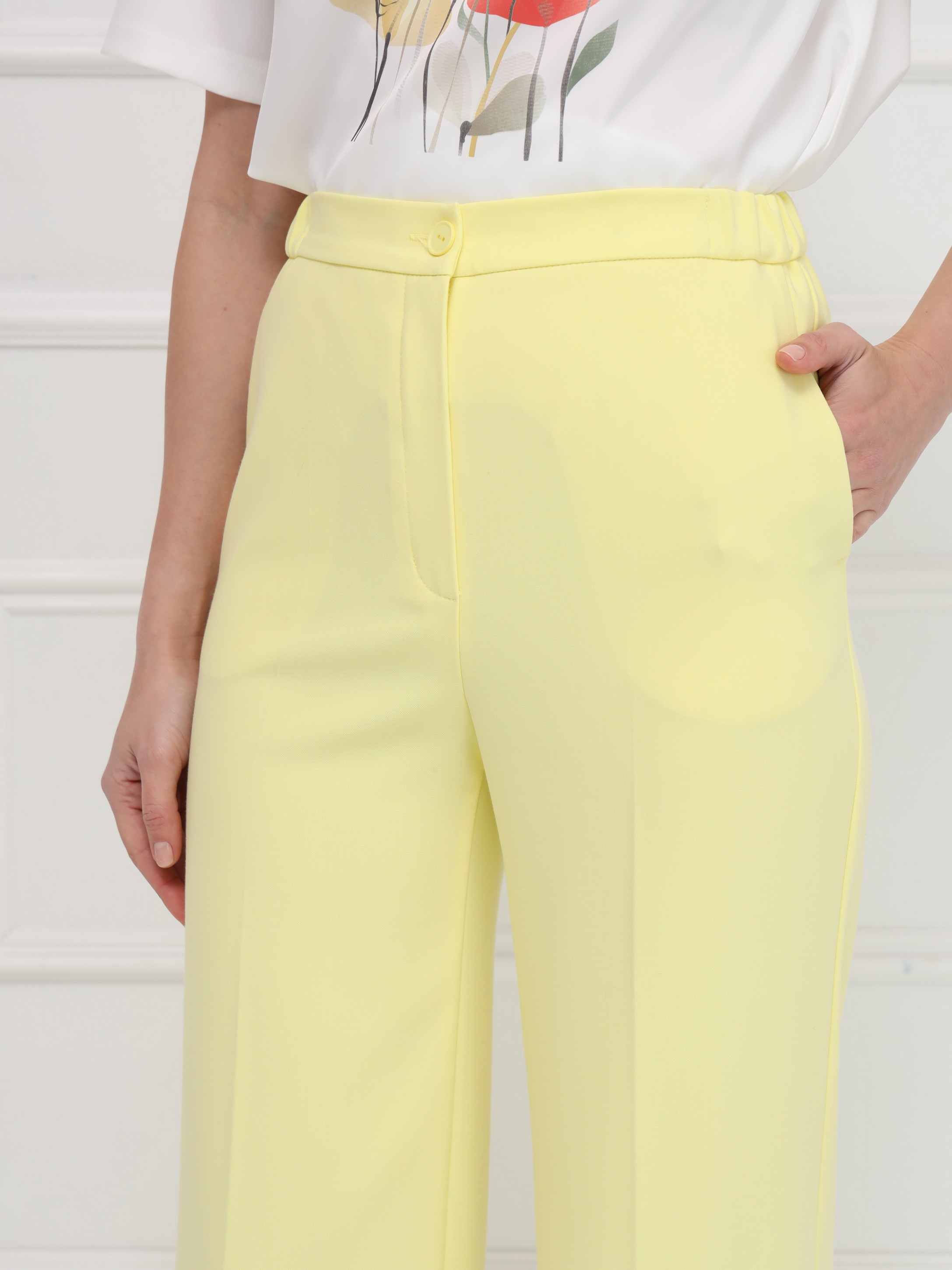 Брюки имеют высокую посадку и деликатное расклешение от бедра. Заутюженные стрелки вытягивают силуэт. Боковые карманы, застежка гульфик. Пояс с резинкой по бокам обеспечивает идеальное прилегание в талии. Мягкая костюмная ткань держит форму. На фото брюки представлены с блузкой Д-209 ТЛЕ(В6) и жакетом В-970 АКА(В6).