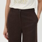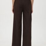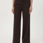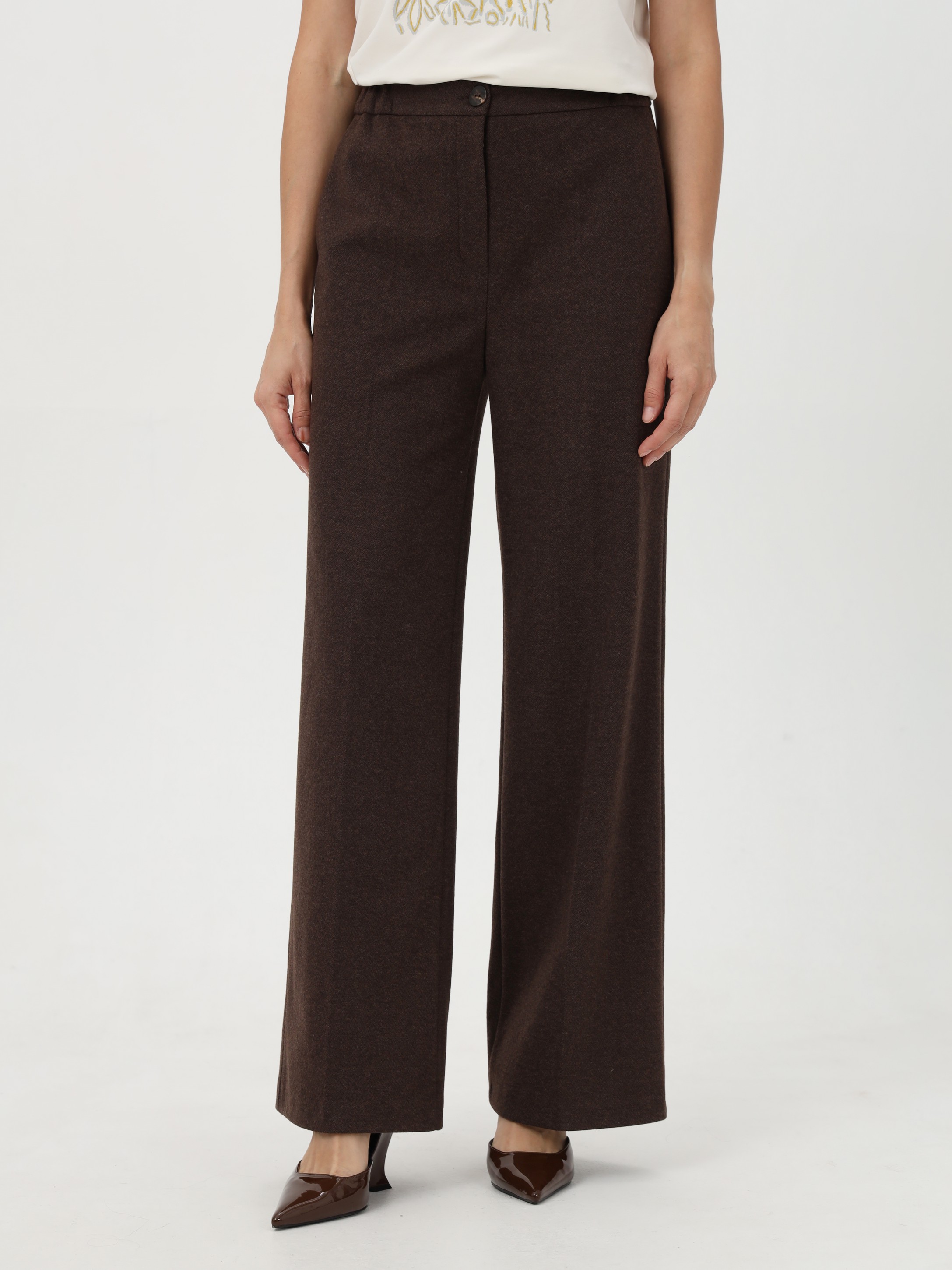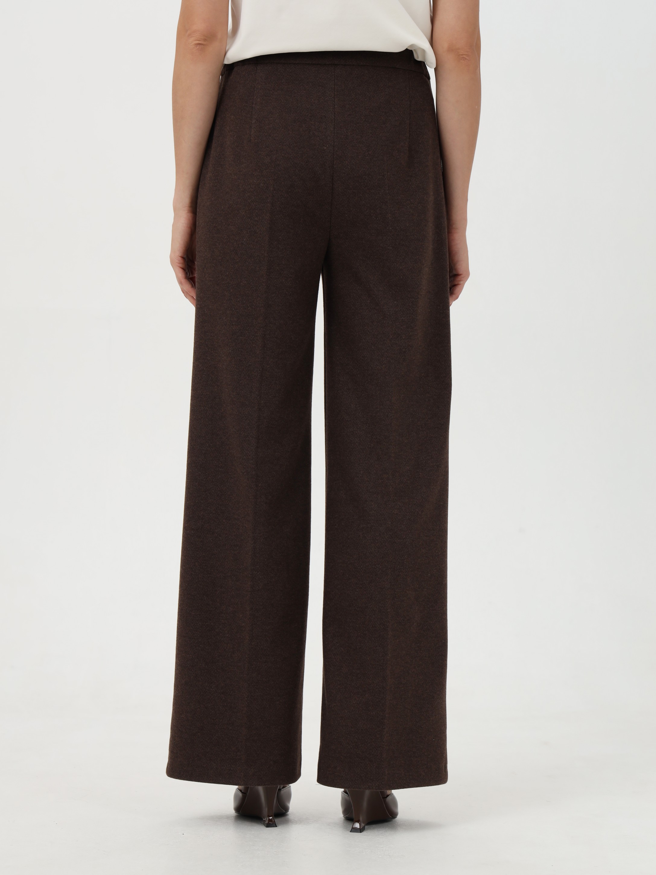 Брюки в шоколадном цвете, с высокой посадкой, выполнены из приятной на ощупь поливискозной ткани с плотным трикотажным переплетением. Расклешение от бедра формирует вытянутый, сбалансированный силуэт. Вытачки сзади обеспечивают точную посадку по фигуре. Застежка-гульфик и боковые карманы подчеркивают функциональность. В поясе по бокам вставлены резинки для удобства и комфорта в течение дня. На фото в паре Жакет В-932 ПШО(О5)