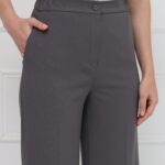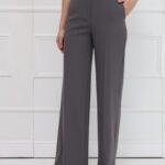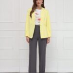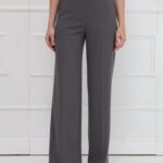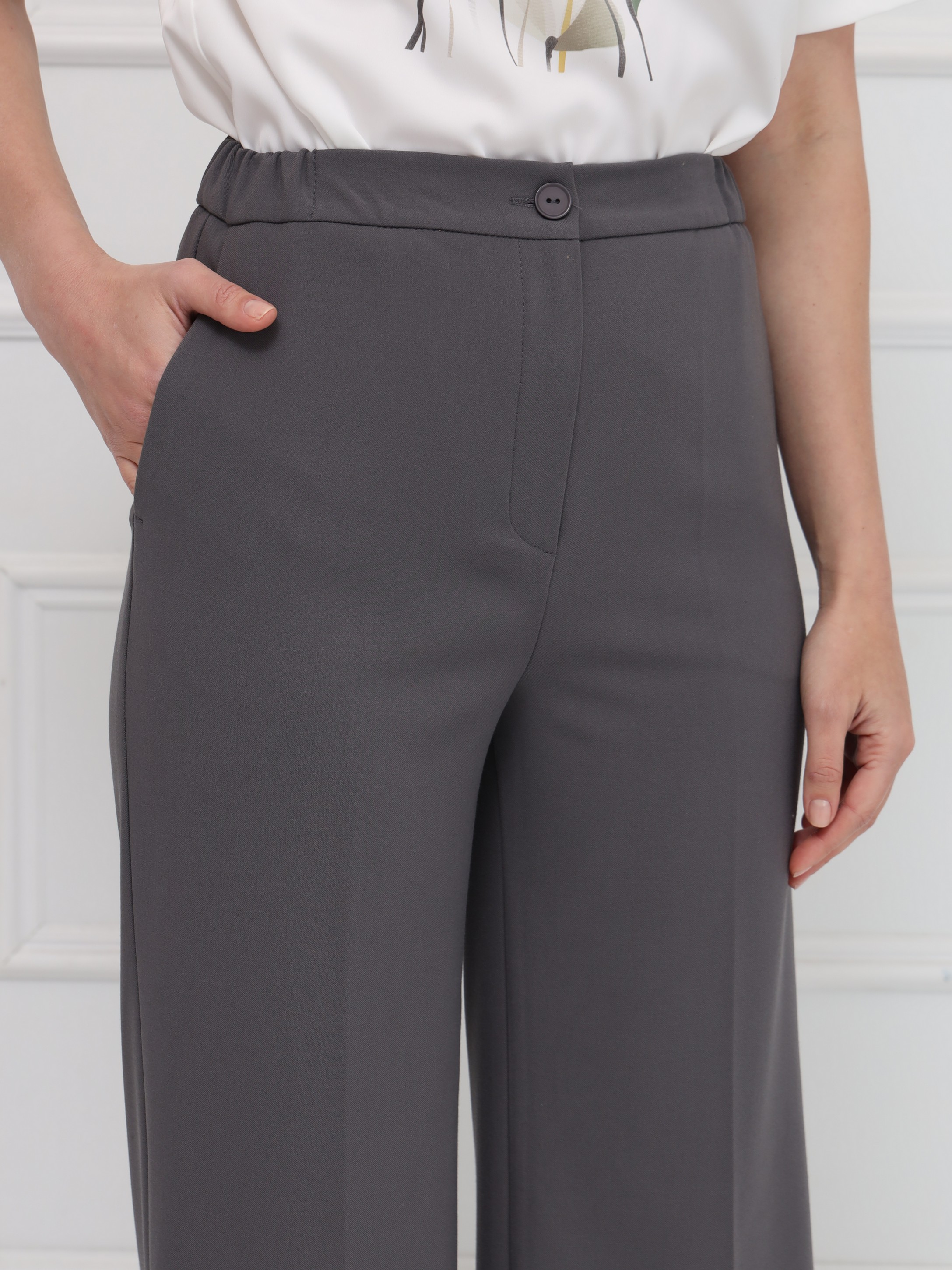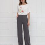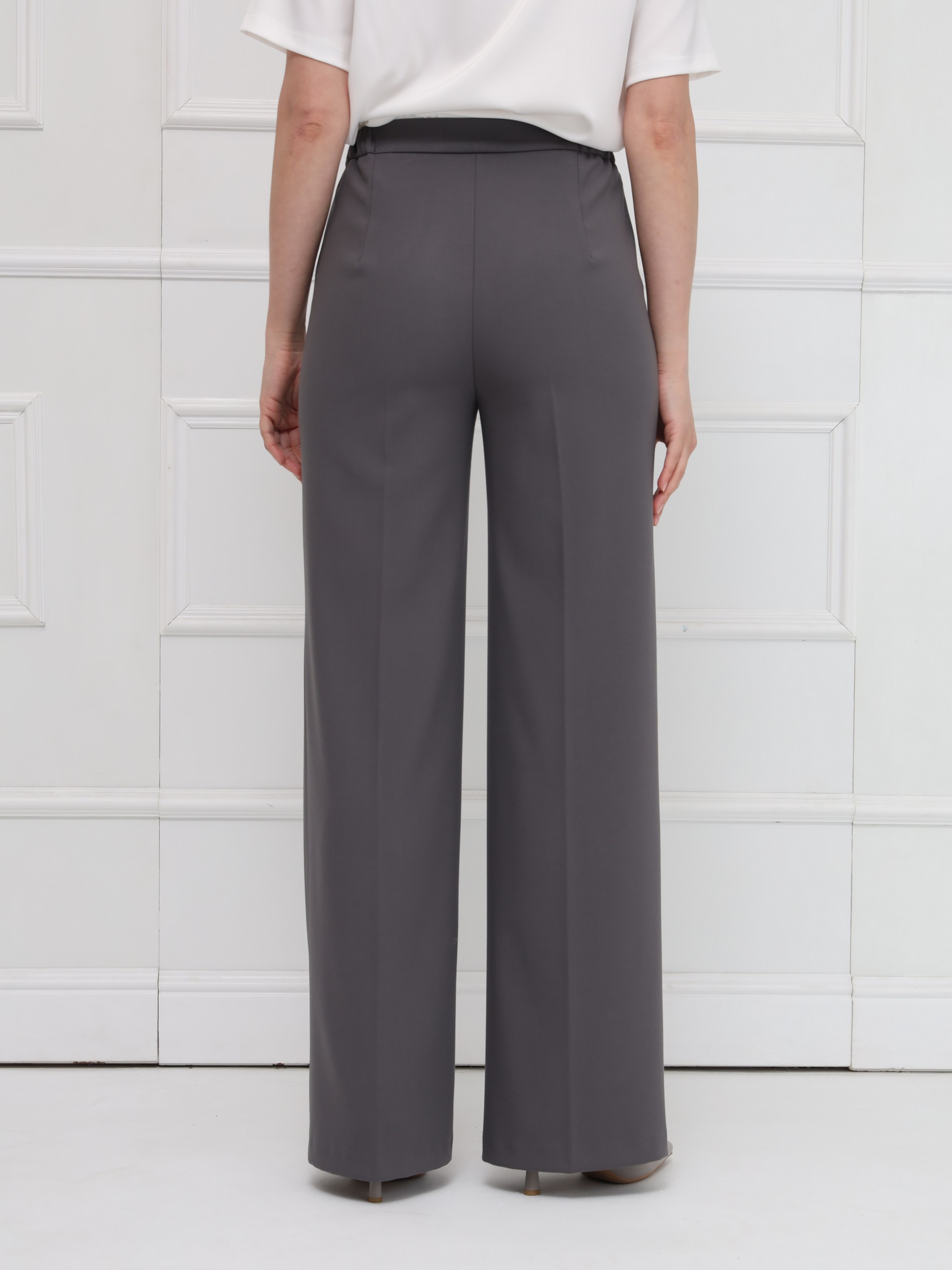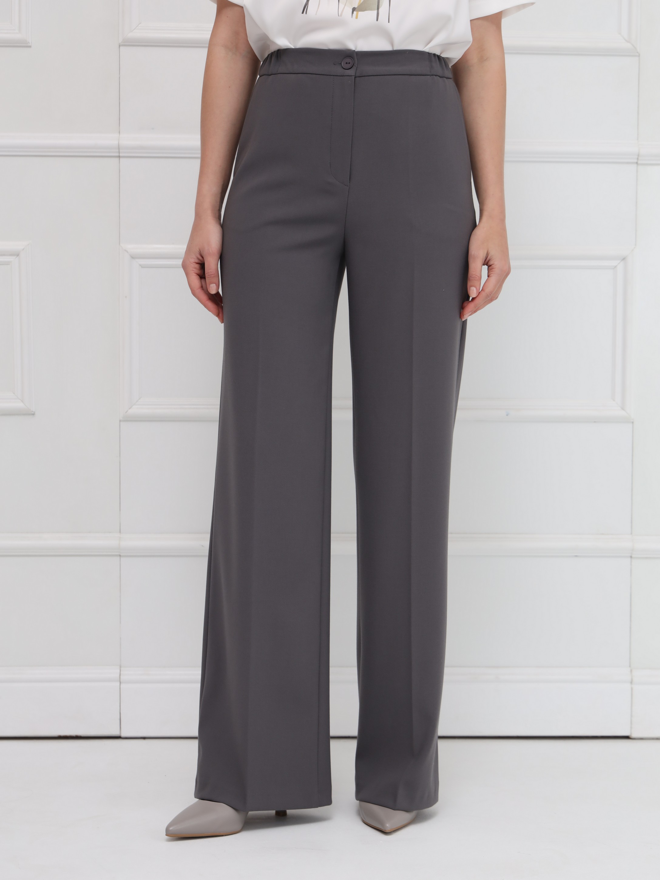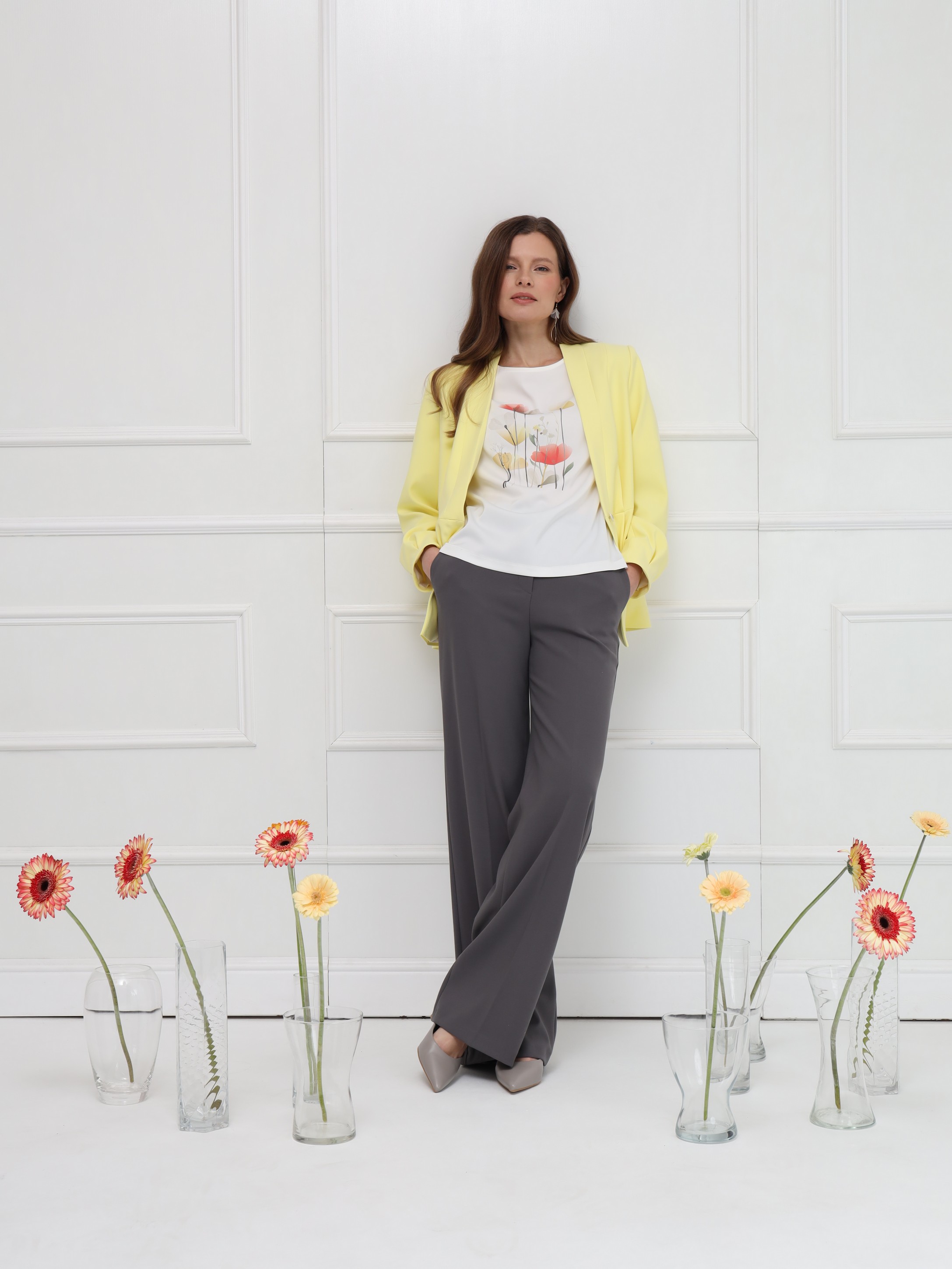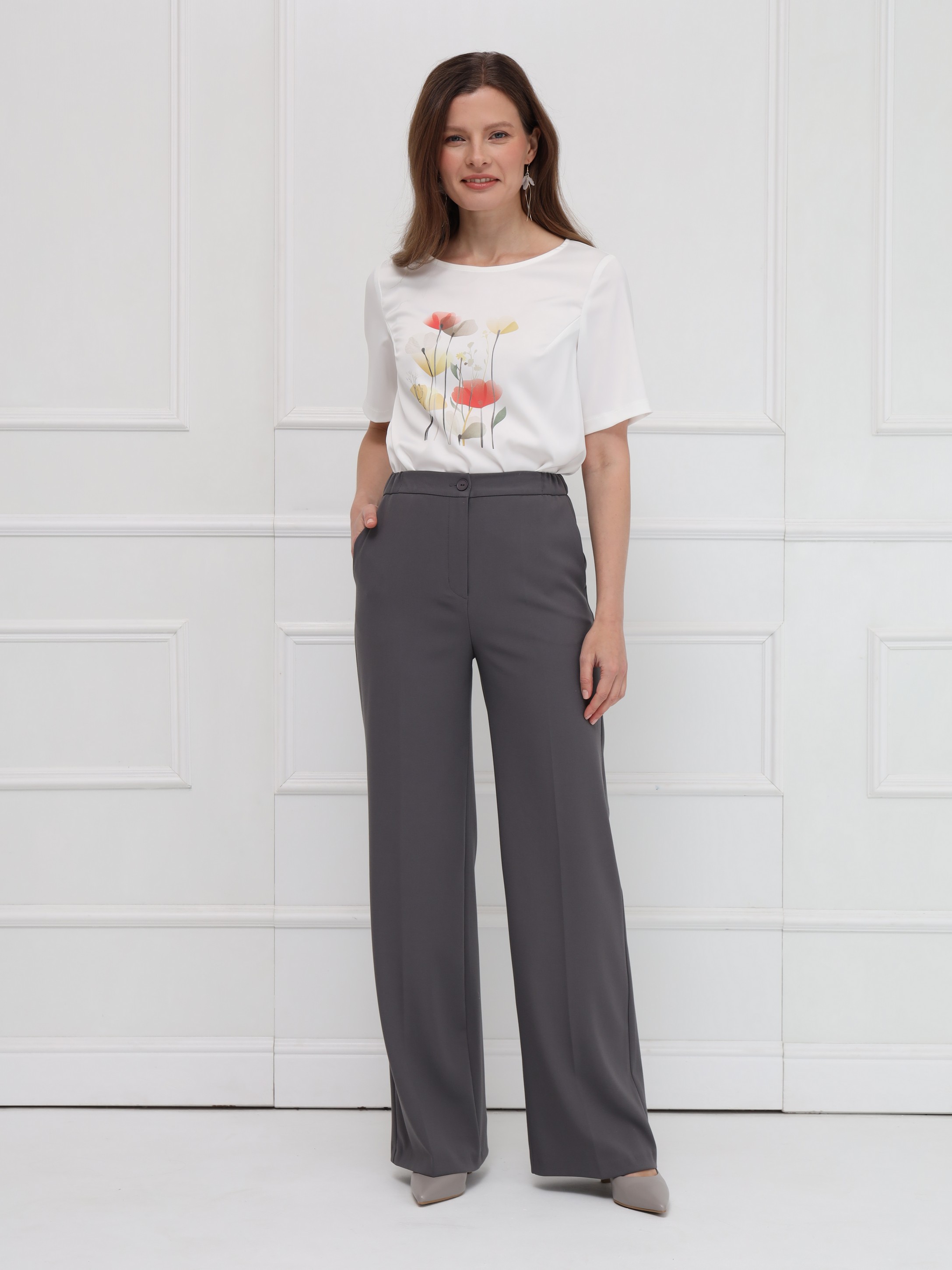 Брюки имеют высокую посадку и деликатное расклешение от бедра. Заутюженные стрелки вытягивают силуэт. Боковые карманы, застежка гульфик. Пояс с резинкой по бокам обеспечивает идеальное прилегание в талии. Мягкая костюмная ткань держит форму. На фото брюки представлены с блузкой Д-209 ТЛЕ(В6) и жакетом В-970 АКА(В6).
