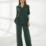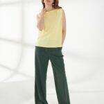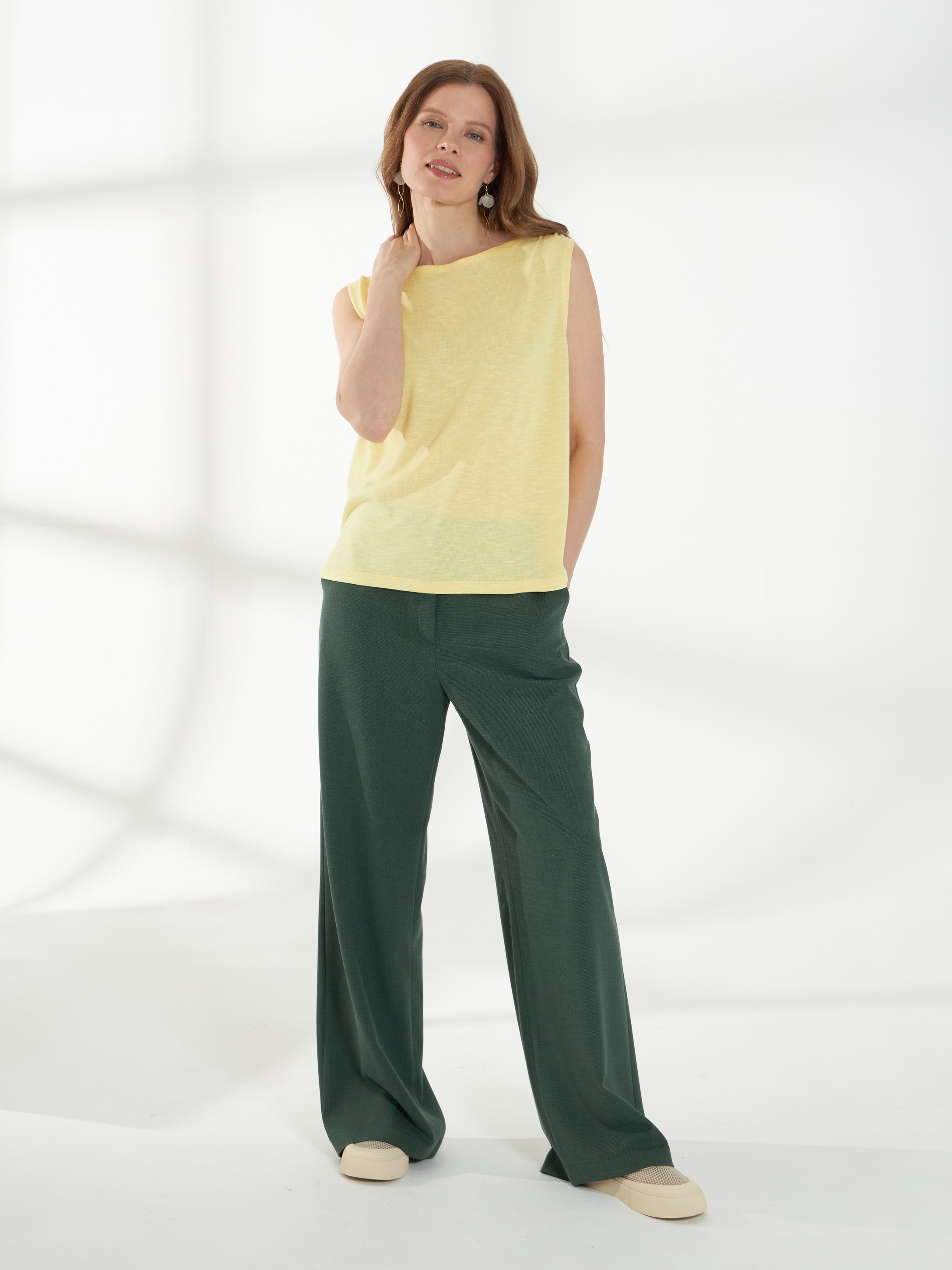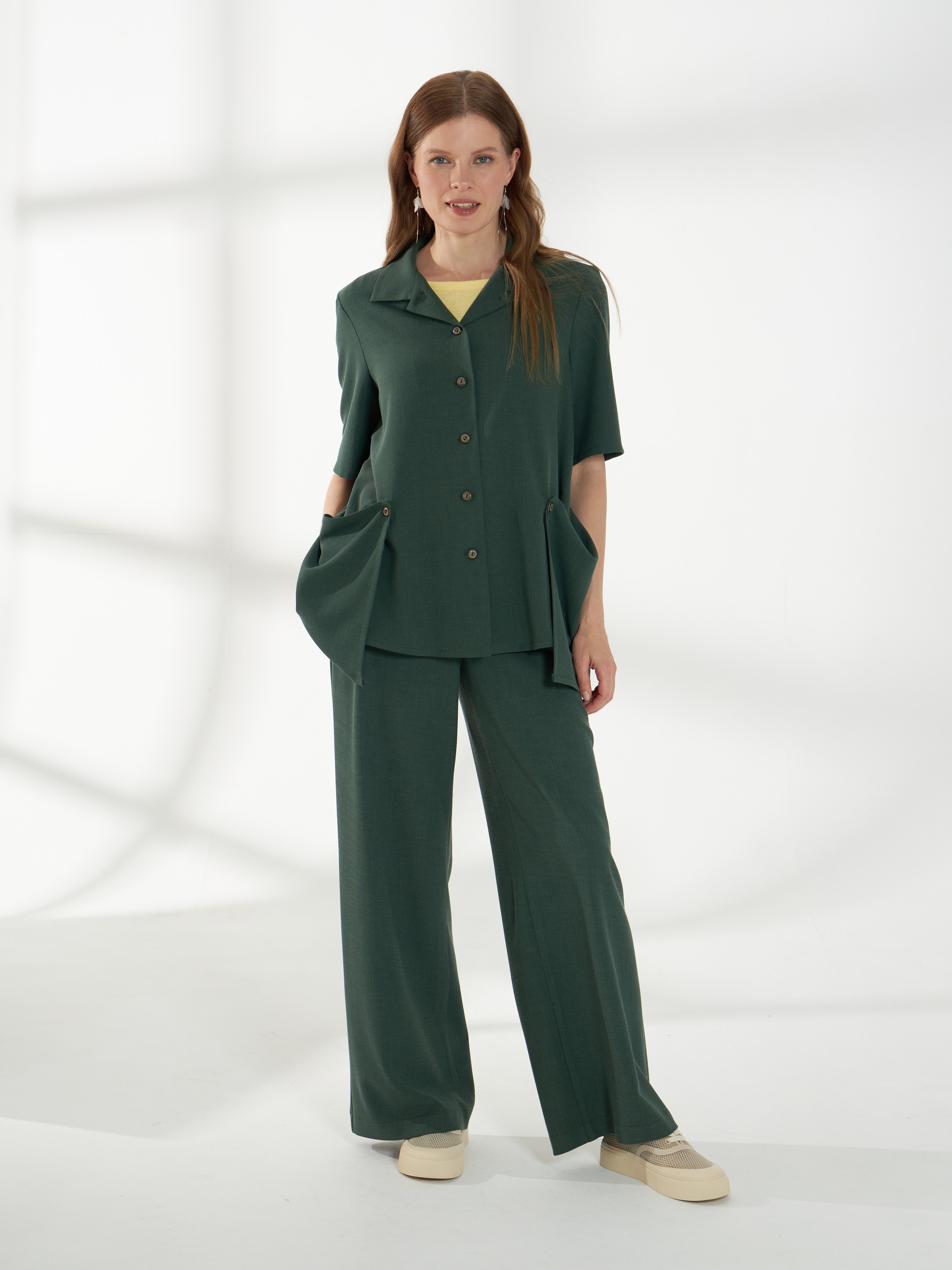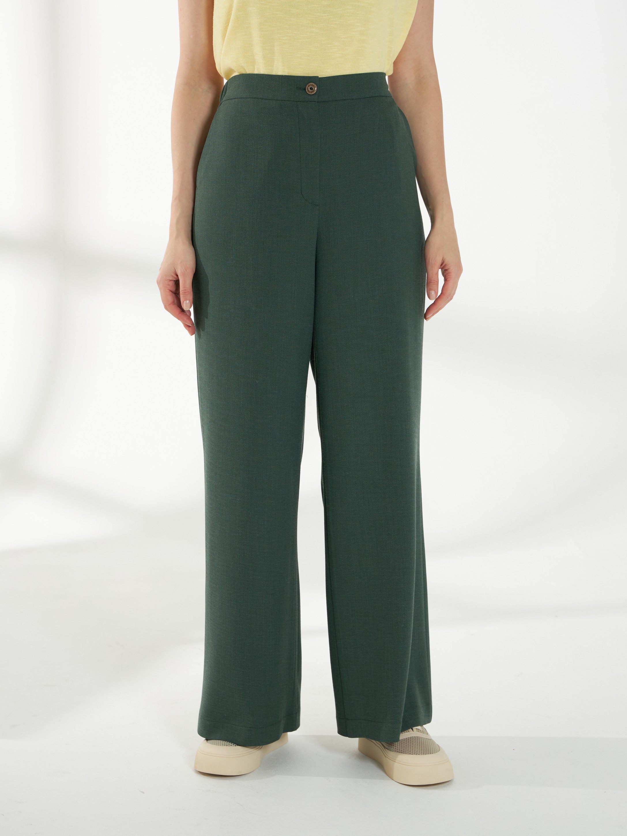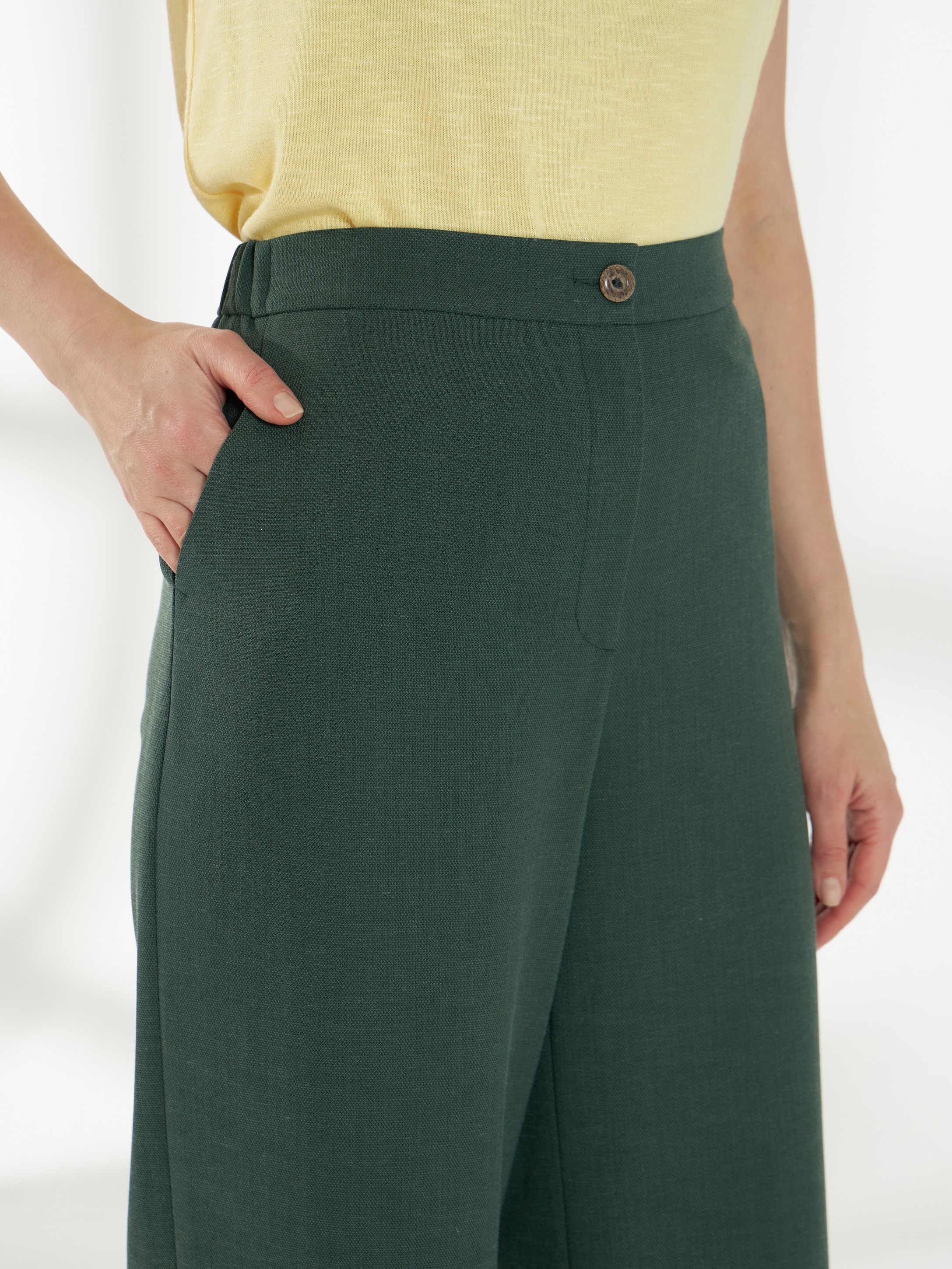 Широкие брюки из дышащей и пластичной ткани с комфортным свободным силуэтом. По бокам предусмотрены функциональные карманы, спереди-застежка-гульфик, сзади-резинка в поясе для удобной посадки. Модель легко драпируется и сохраняет аккуратный вид в течение дня. Модель в зеленом оттенке представлена с блузкой Д-263 ФЛО(В6) и джемпером С-65 ЛУЧ(В6).