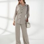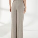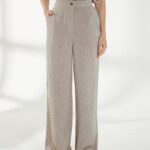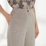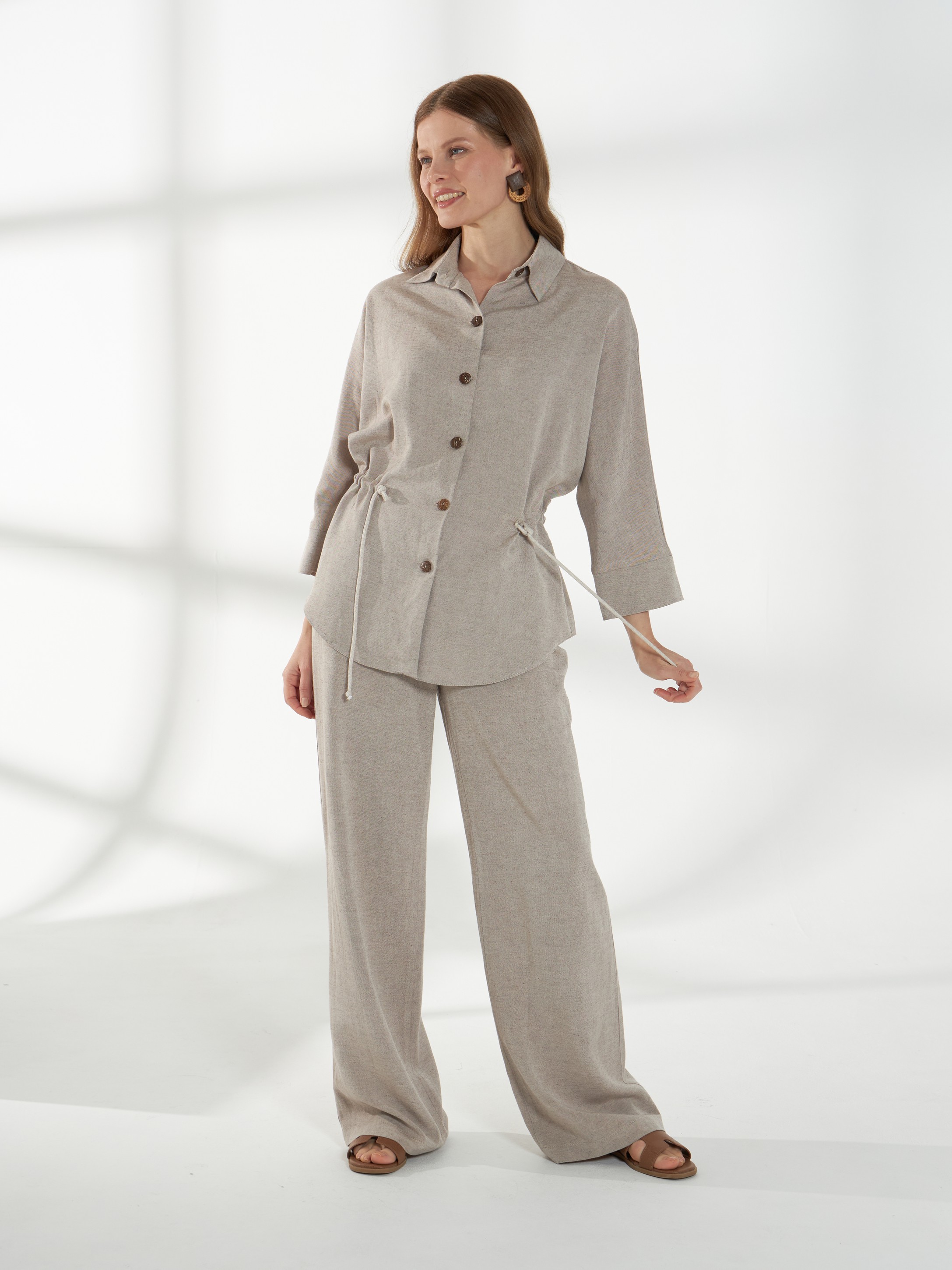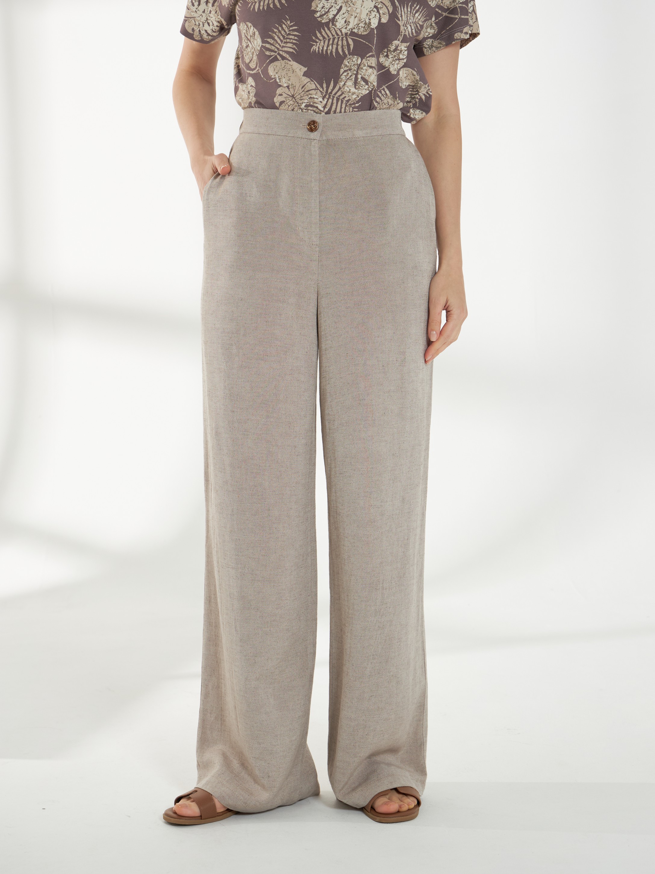 Широкие брюки из смесовой костюмной ткани со льном, в светло-коричневом оттенке. Свободный силуэт, по бокам предусмотрены функциональные карманы, спереди — застежка-гульфик, сзади — резинка в поясе для удобной посадки. Модель легко драпируется и сохраняет аккуратный вид в течение дня. На фото брюки представлены с блузкой Д-258 МКК(В6).