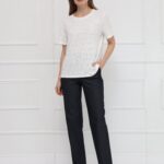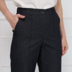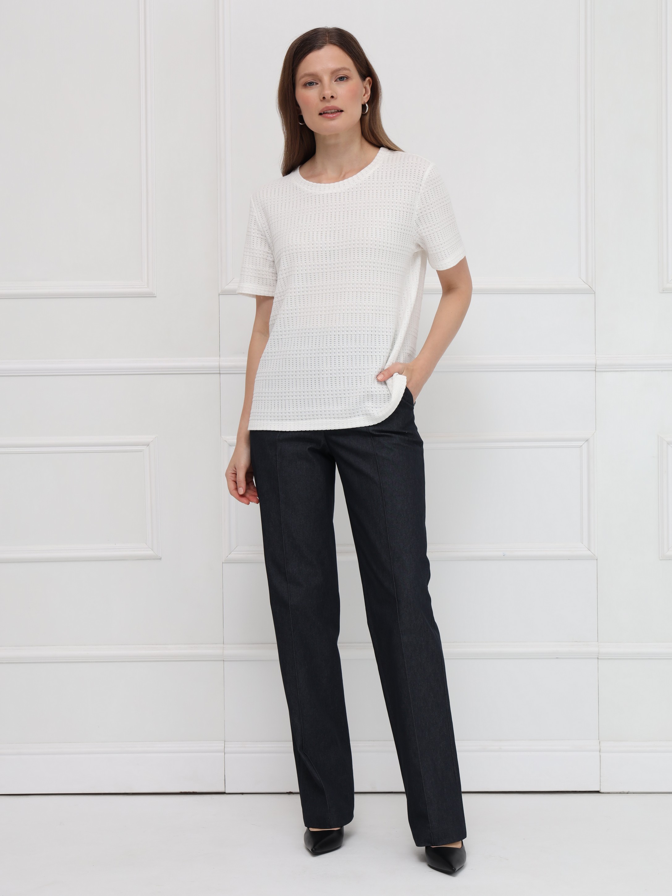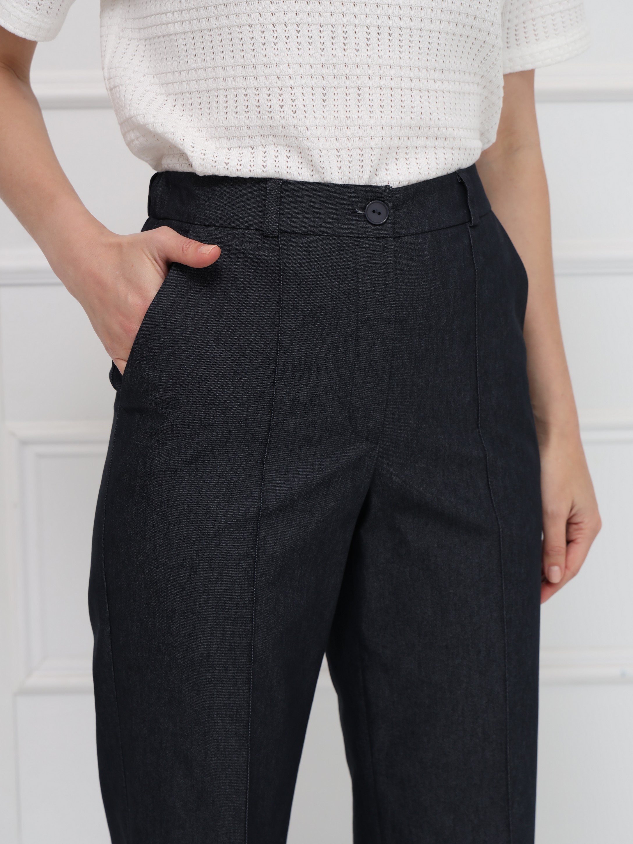Брюки из хлопкового материала, в актуальном оттенке тёмного денима, станут универсальной основой гардероба. Классическая посадка и застроченная стрелка спереди формируют аккуратный, вытянутый силуэт. Модель оснащена застёжкой-гульфиком, боковыми карманами и шлёвками для ремня, а комфортная резинка на поясе сзади обеспечивает идеальную посадку и свободу движений. Такие брюки легко впишутся в повседневные и городские образы. На фото брюки представлены с джемпером С-69 ПТН(В6) и жакетом В-990 ГЛШ(В6).
