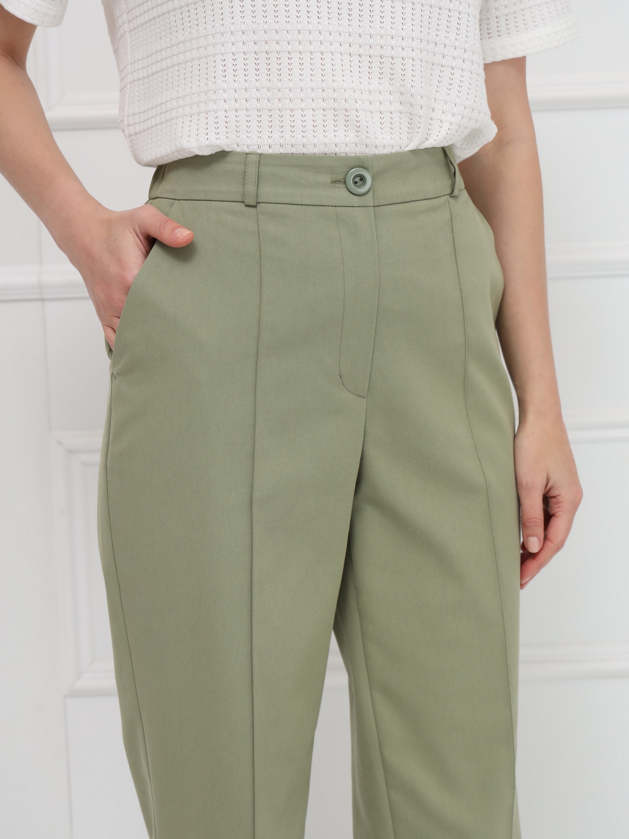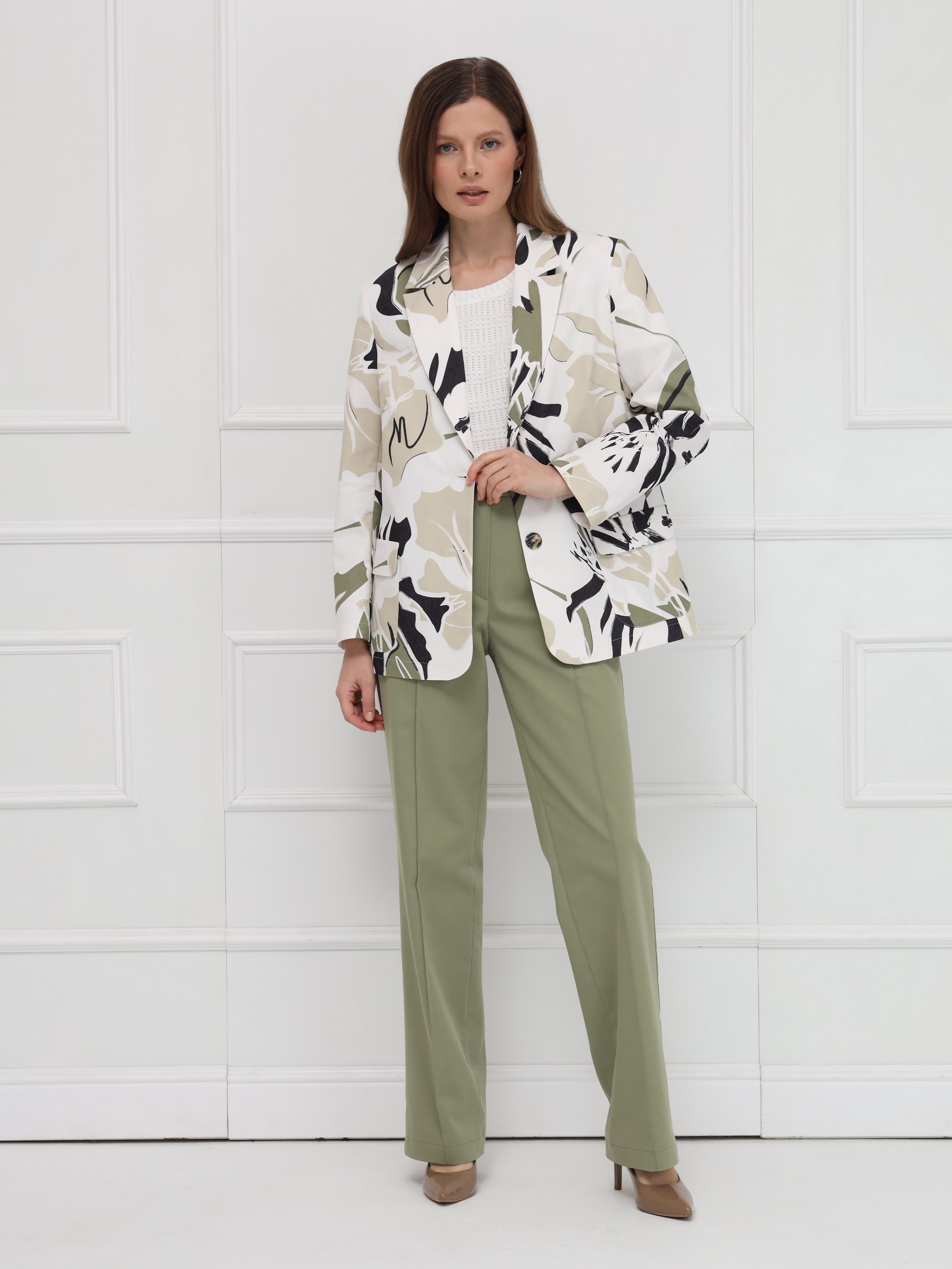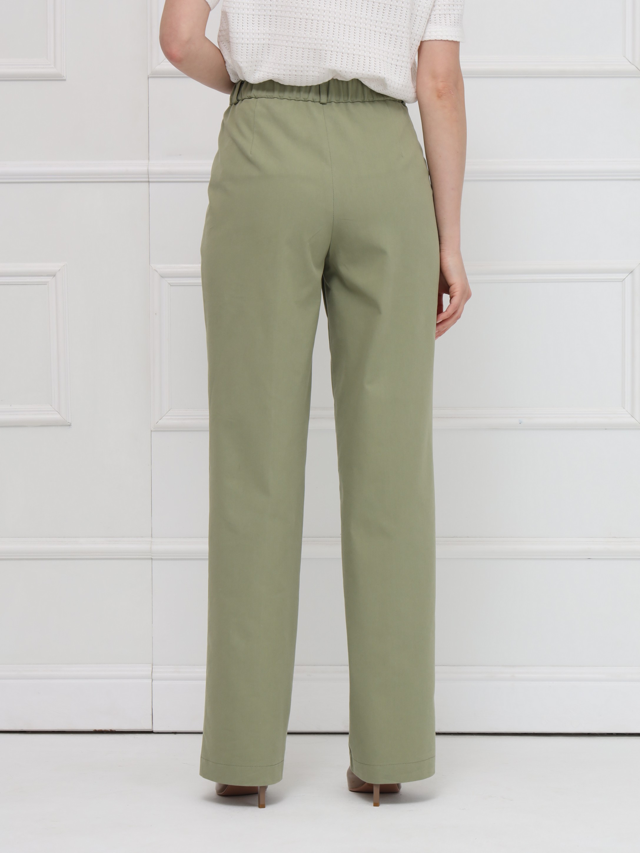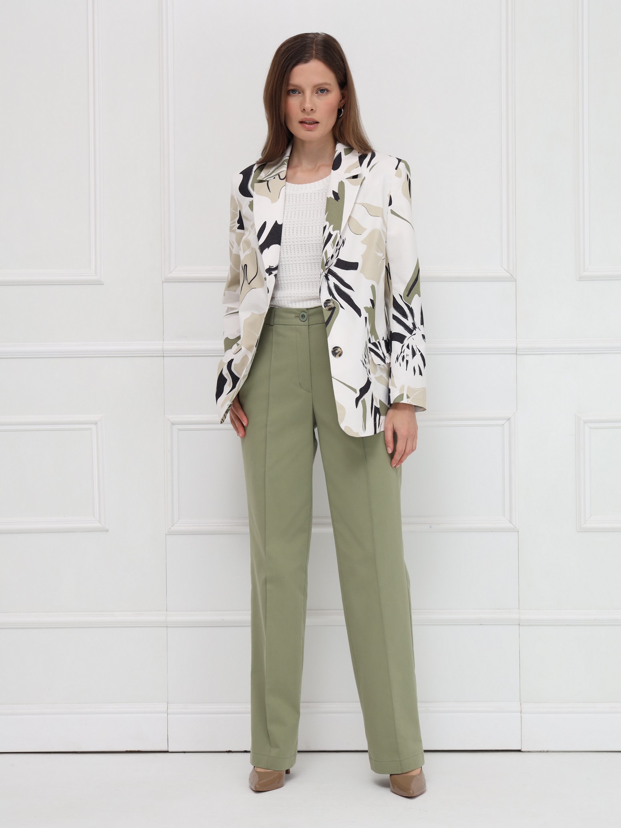 Брюки из хлопкового материала станут универсальной основой гардероба. Классическая посадка и застроченная стрелка спереди формируют аккуратный, вытянутый силуэт. Модель оснащена застёжкой-гульфиком, боковыми карманами и шлёвками для ремня, а комфортная резинка на поясе сзади обеспечивает идеальную посадку и свободу движений. Такие брюки легко впишутся в повседневные и городские образы. На фото брюки представлены с жакетом В-990 ОШТ(В6).