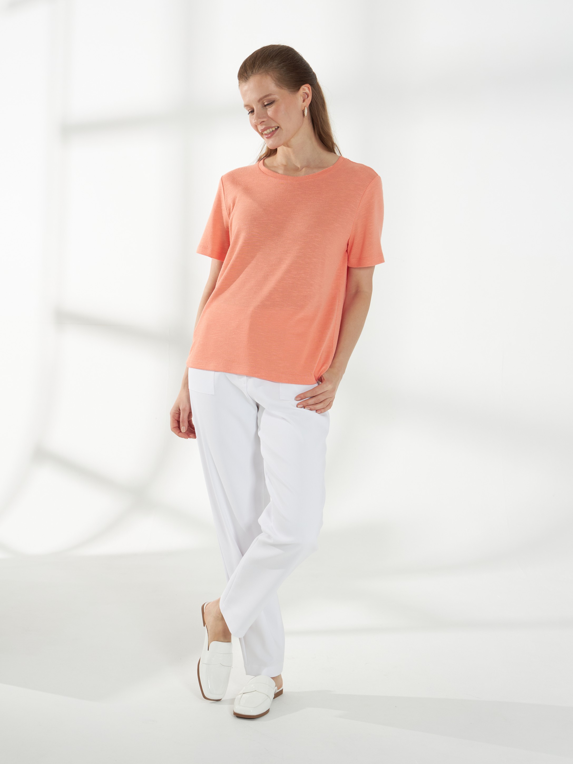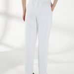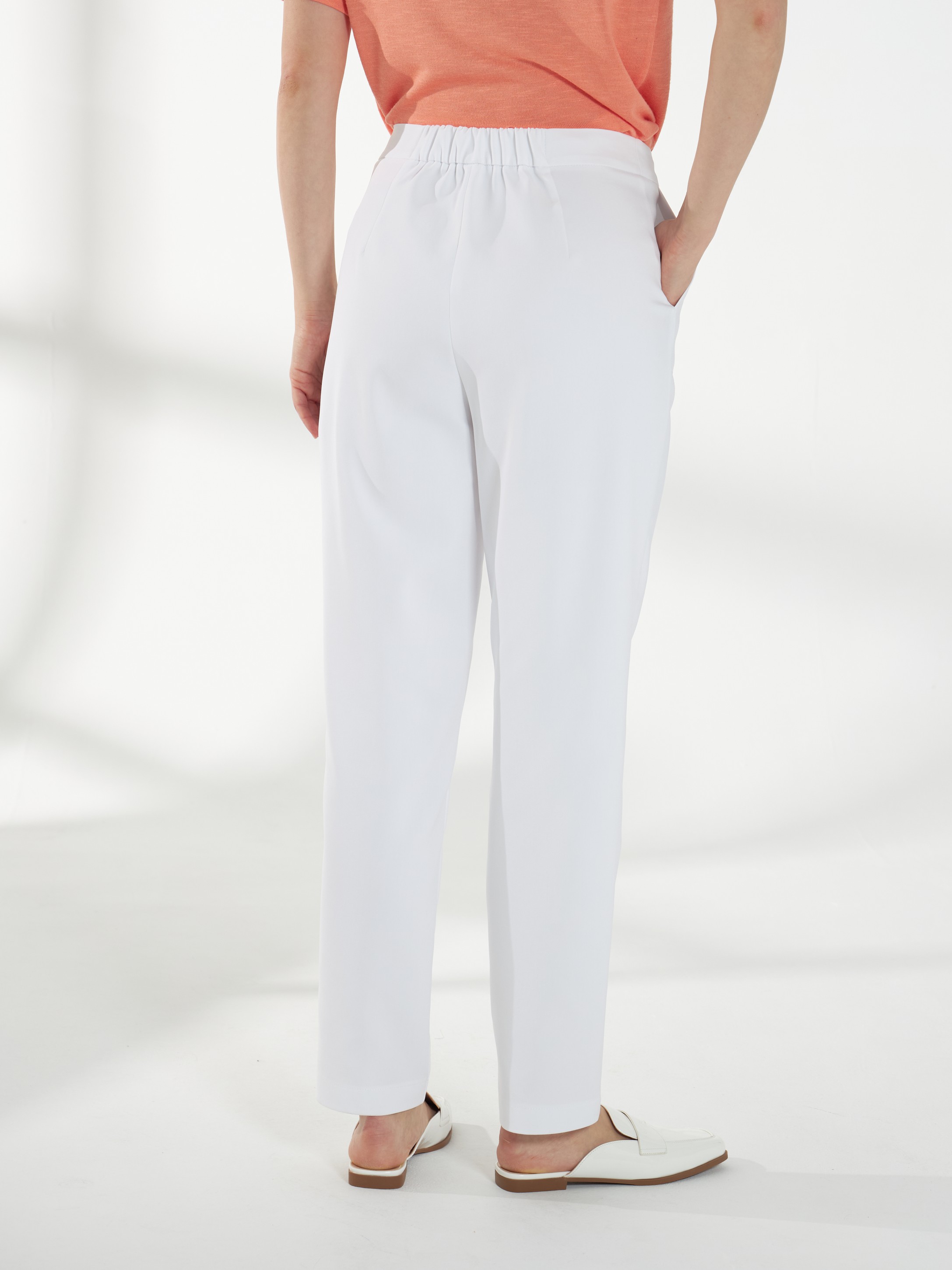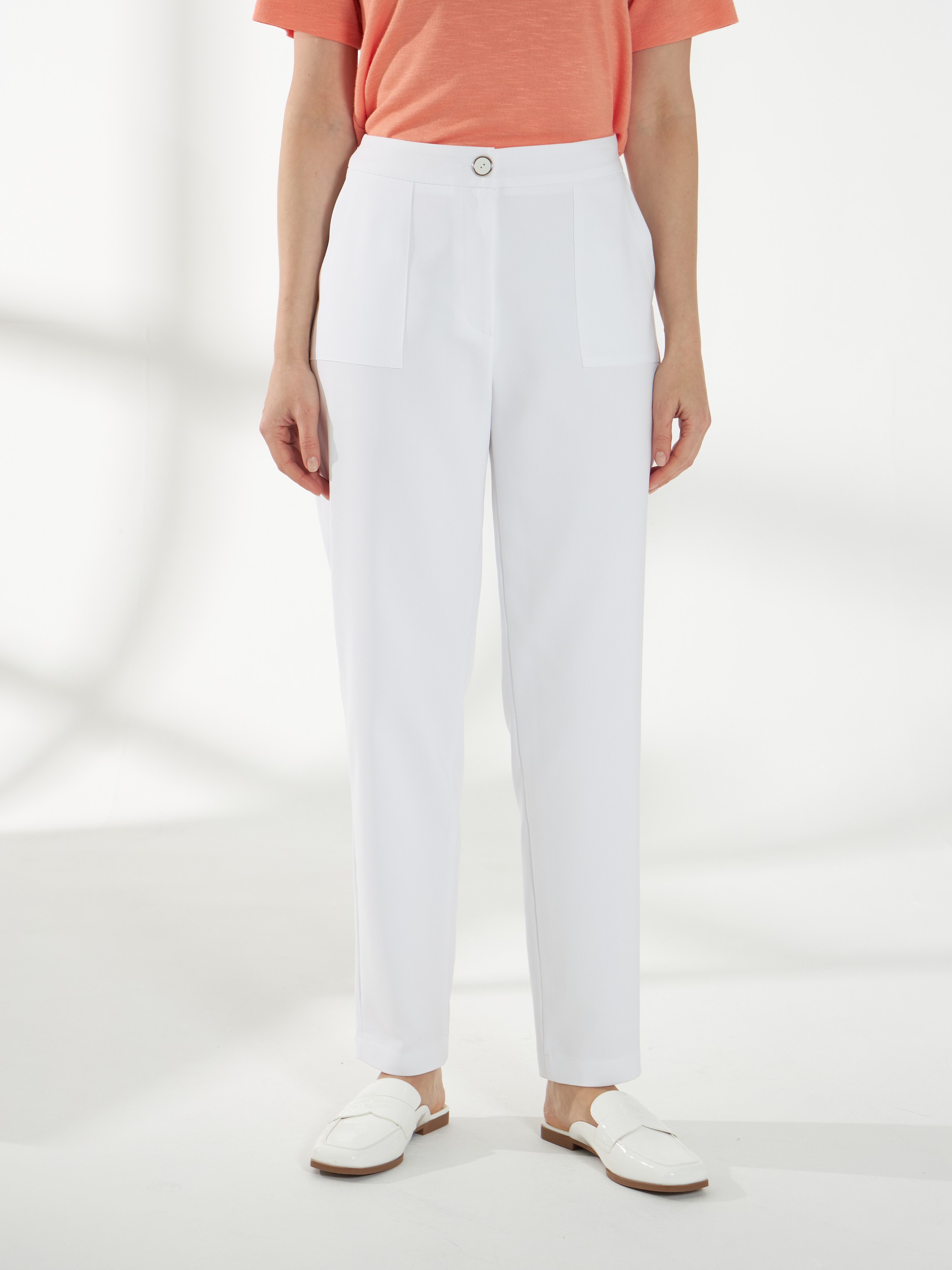 Безупречно белые брюки из хлопка с эластаном-мягкие, приятные к телу и хорошо тянущиеся, не сковывают движения и сохраняют форму в течение дня. Модель с высокой посадкой, пояс сзади оснащен резинкой для комфортной посадки. Застежка-гульфик, спереди накладные карманы, брюки деликатно заужены книзу. Легкая и универсальная альтернатива вашим любимым джинсам летом. На фото брюки представлены с джемпером С-65 РИФ(В6).